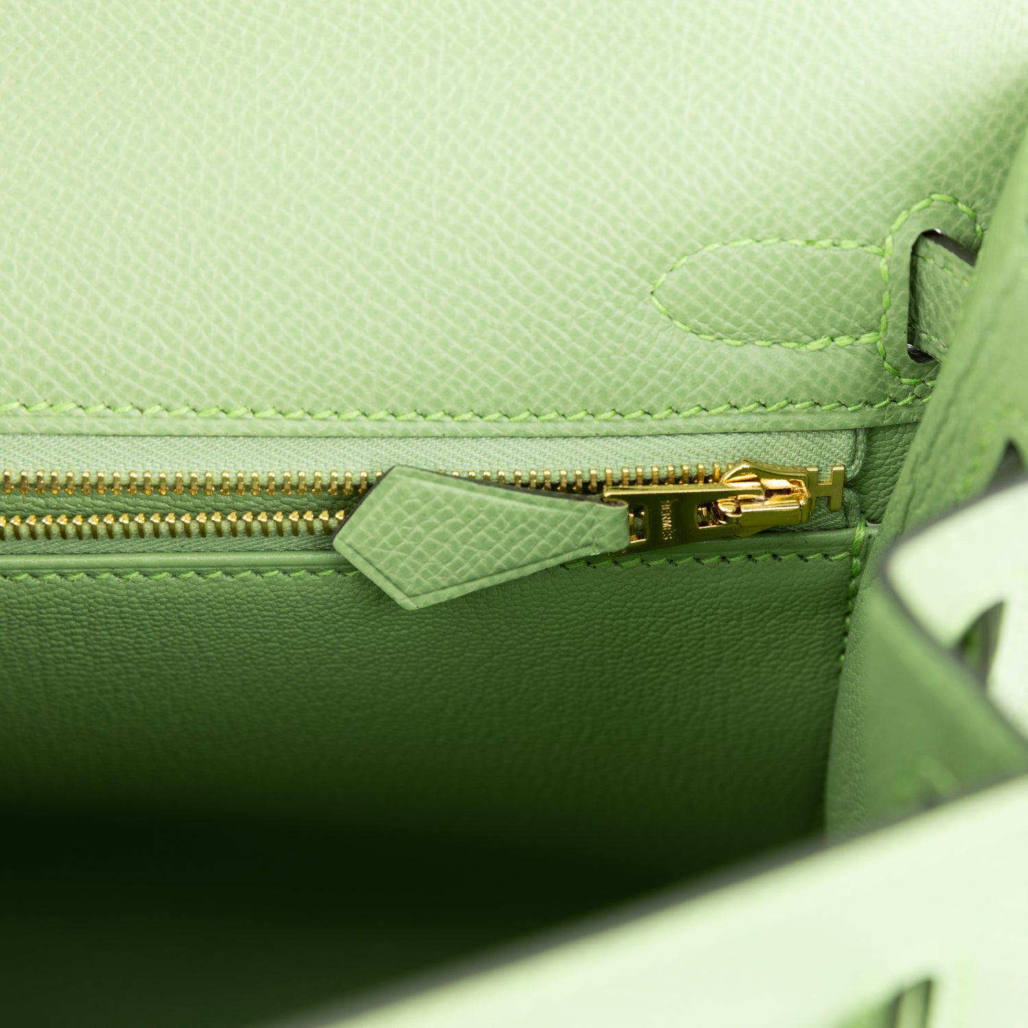 The interior is lined with Vert Criquet chevre and has one zip pocket with an Hermes engraved pull and one open pocket on the opposite side.