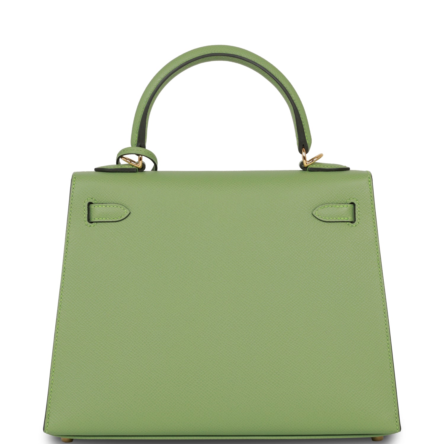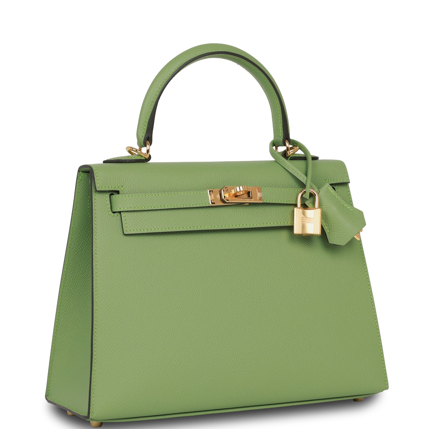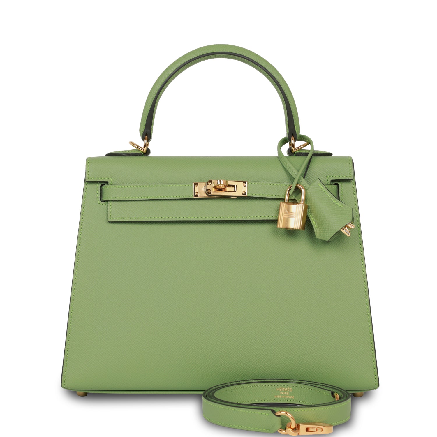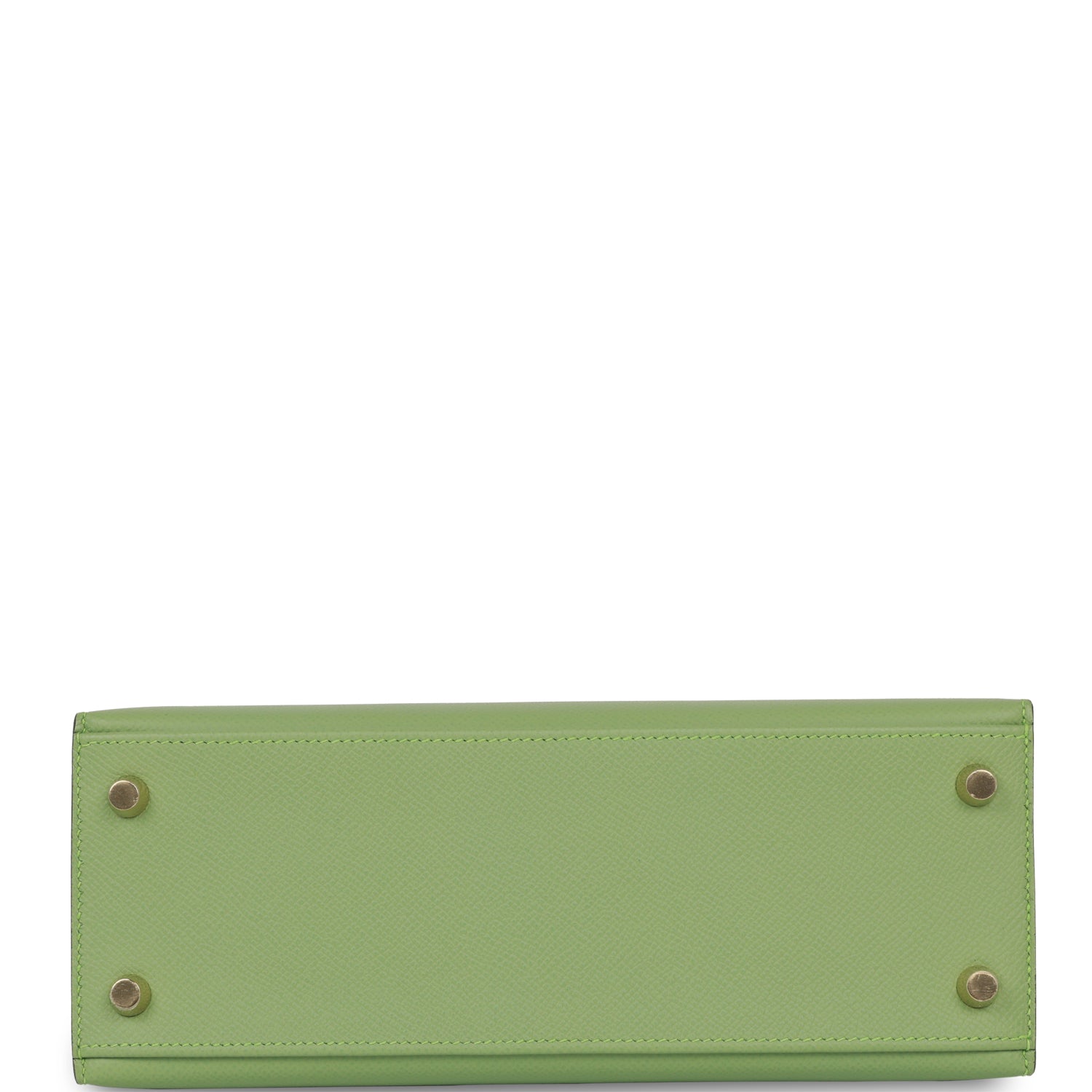 This Kelly, in the Sellier style, is in Vert Criquet epsom leather with gold hardware and has tonal stitching, two straps with front toggle closure, clochette with lock and two keys, single rolled handle and removable shoulder strap.