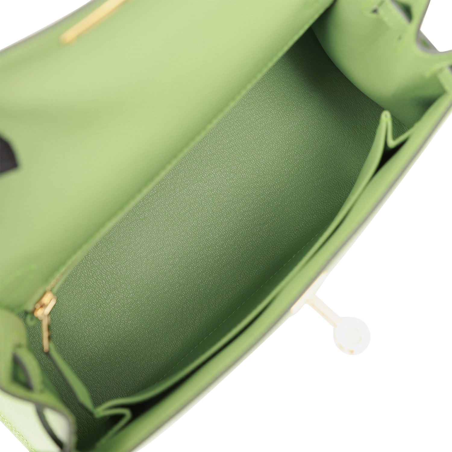 The interior is lined with Vert Criquet chevre and has one zip pocket with an Hermes engraved pull and one open pocket on the opposite side.