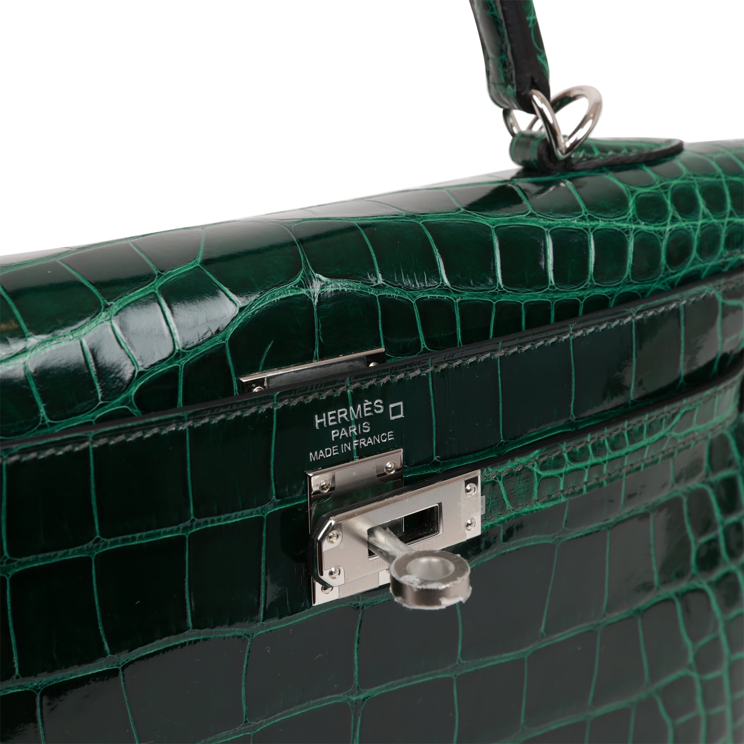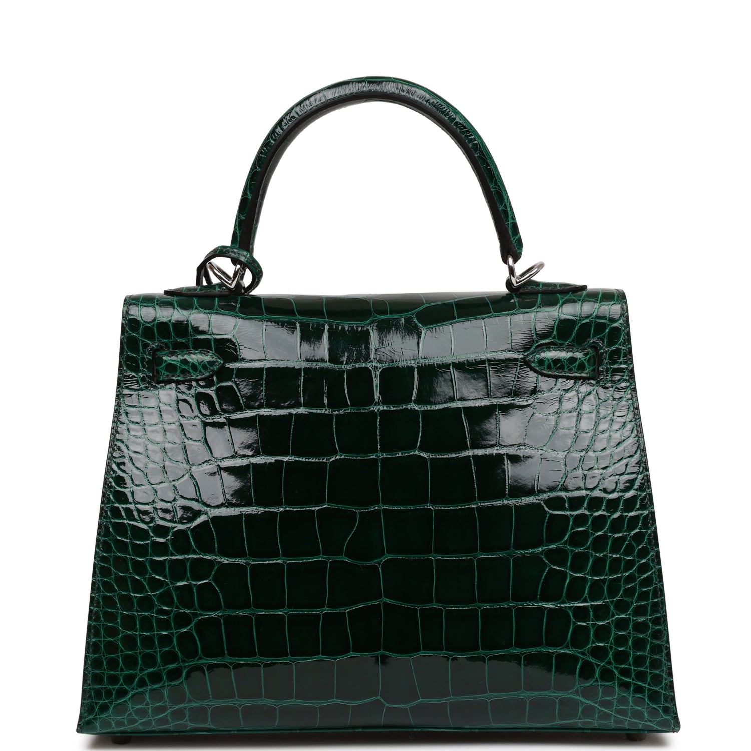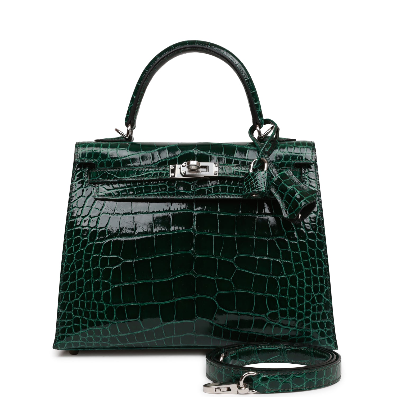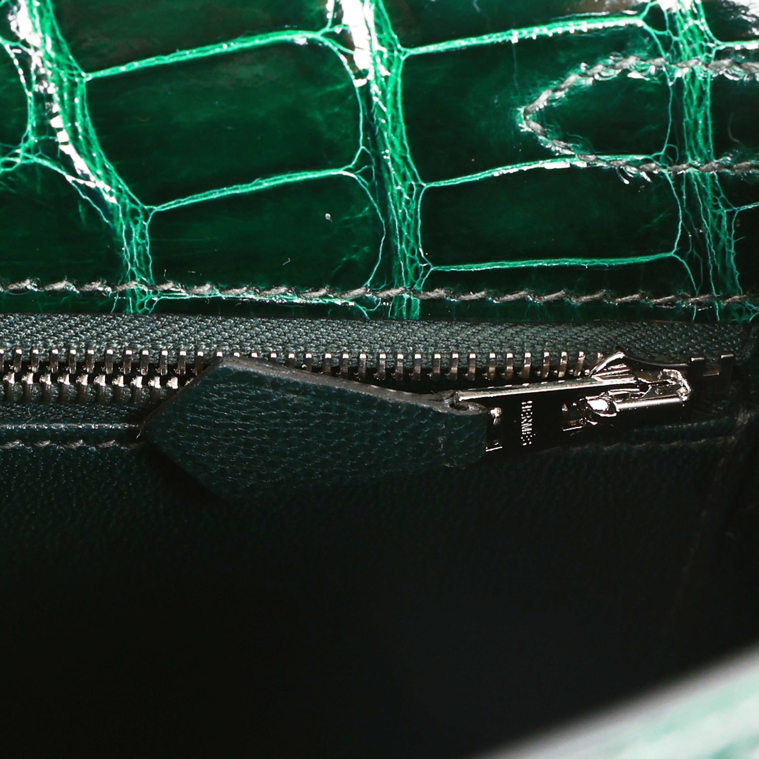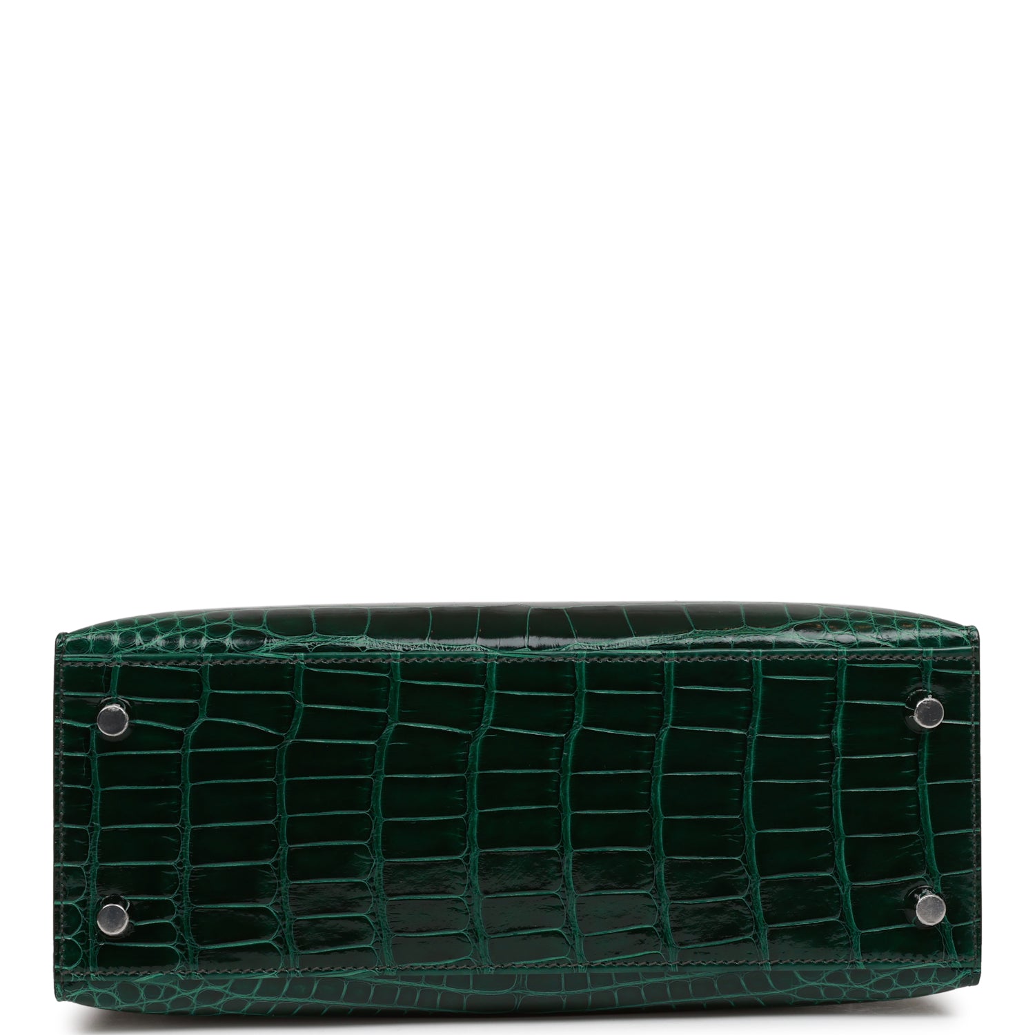 This Sellier Kelly is in Vert Fonce shiny alligator with palladium hardware and has tonal stitching, front flap, two straps with center toggle closure, clochette with lock and two keys, single rolled handle and removable strap.