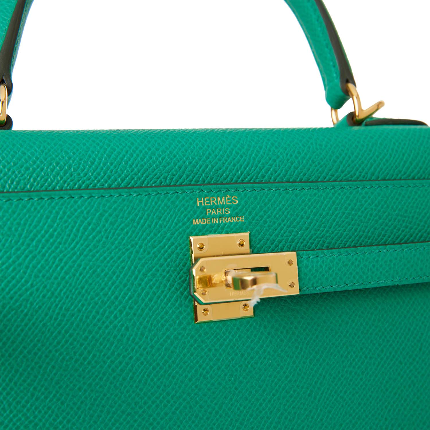 This Sellier Kelly is of Vert Jade epsom leather with gold hardware and has tonal stitching, front flap, two straps with center toggle closure, clochette with lock and two keys, single rolled handle and an optional shoulder strap.