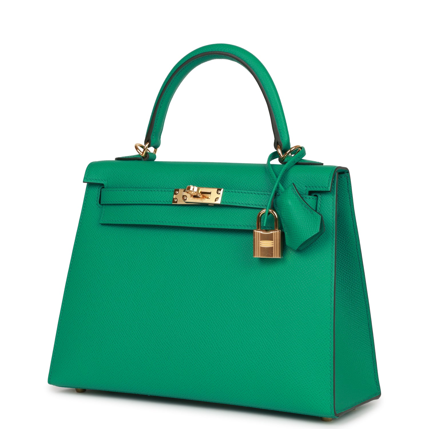 This Sellier Kelly is of Vert Jade epsom leather with gold hardware and has tonal stitching, front flap, two straps with center toggle closure, clochette with lock and two keys, single rolled handle and an optional shoulder strap.