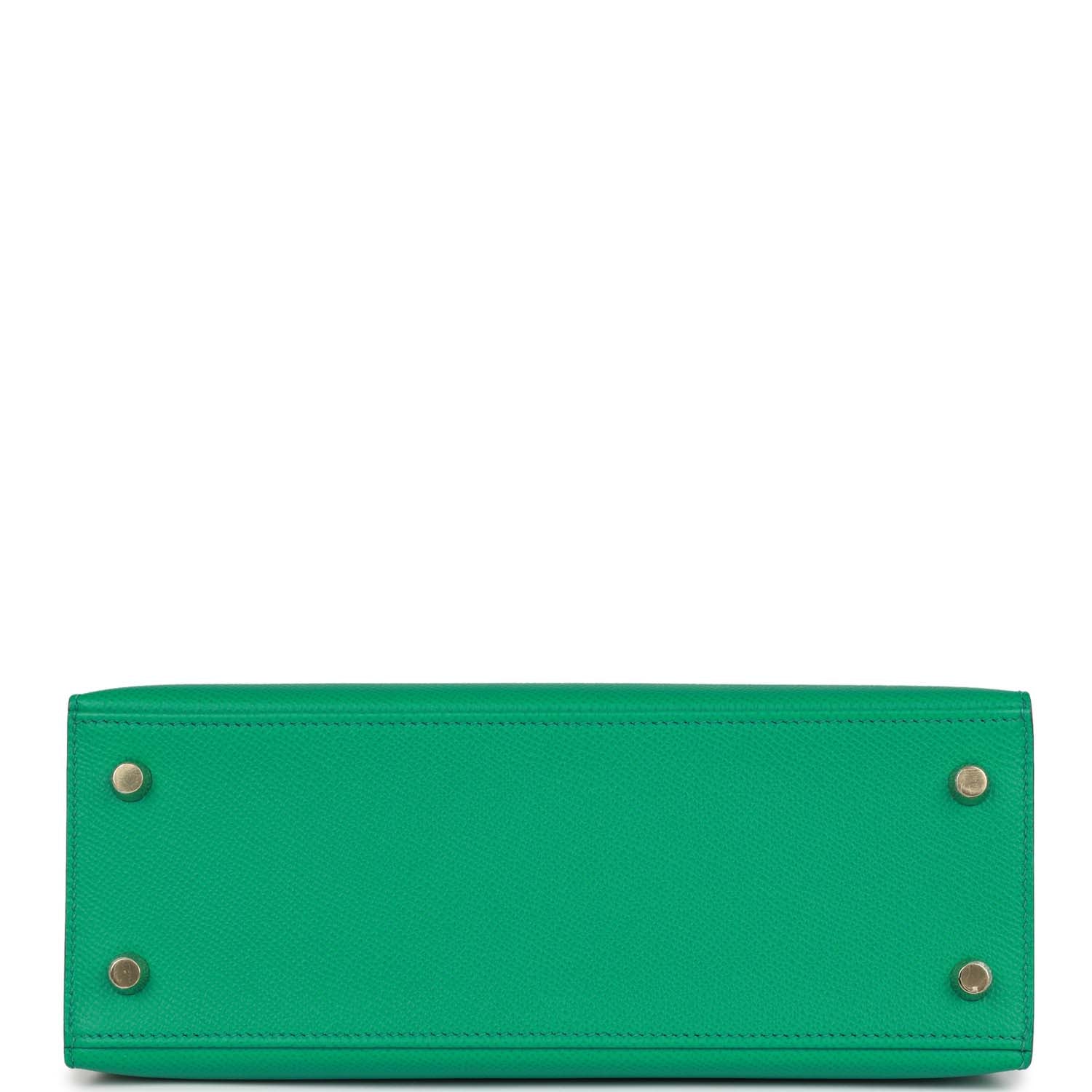 This Sellier Kelly is in Vert Jade epsom leather with gold hardware and has tonal stitching, front flap, two straps with center toggle closure, clochette with lock and two keys, single rolled handle and an optional shoulder strap.