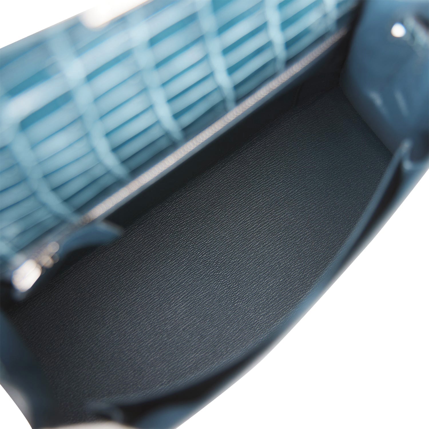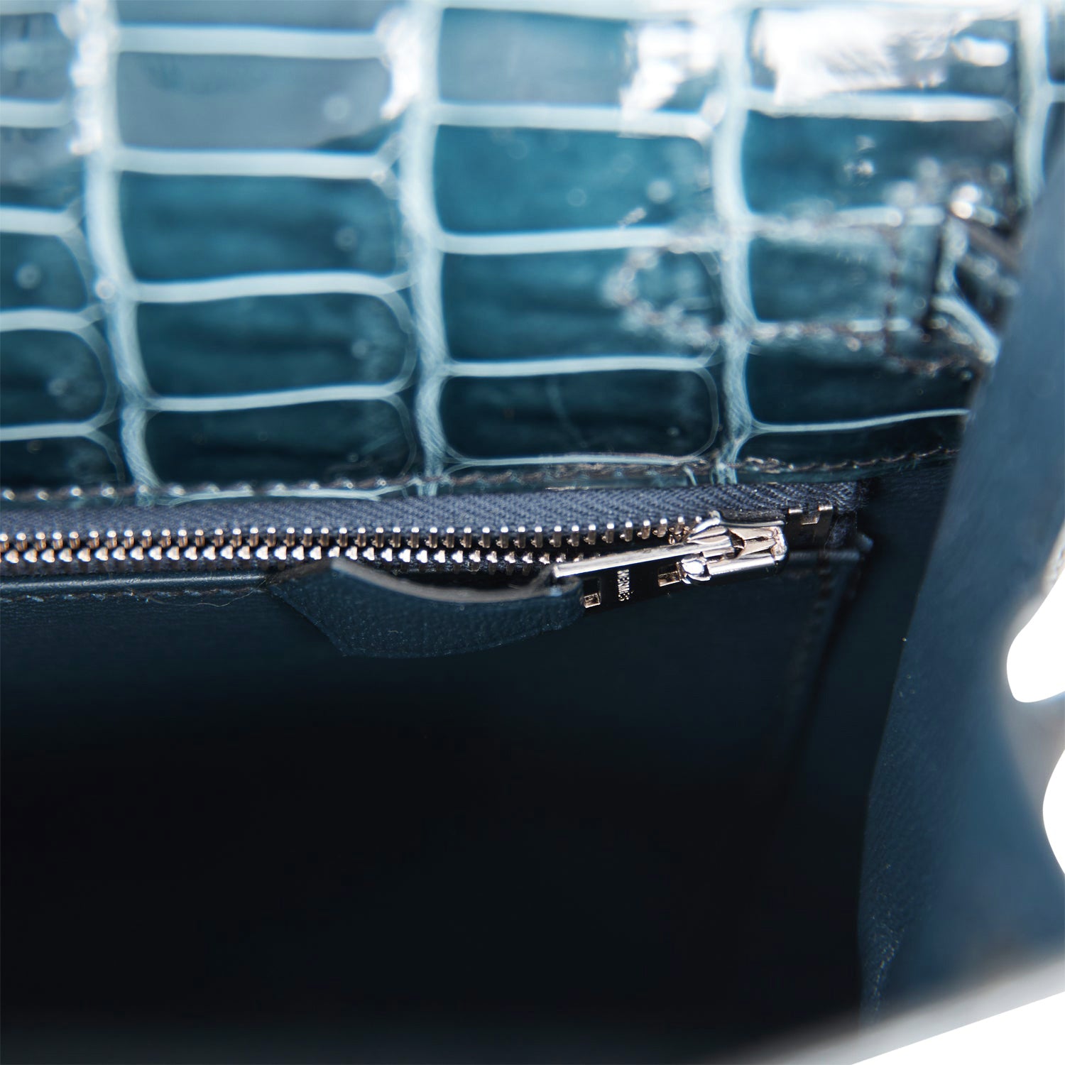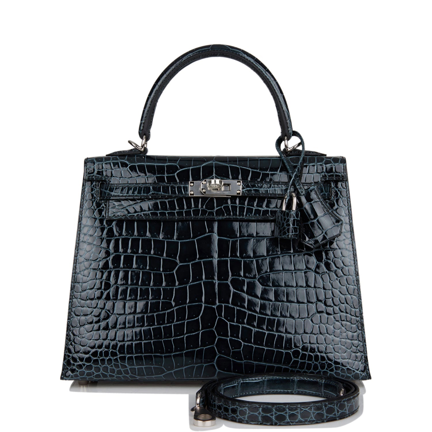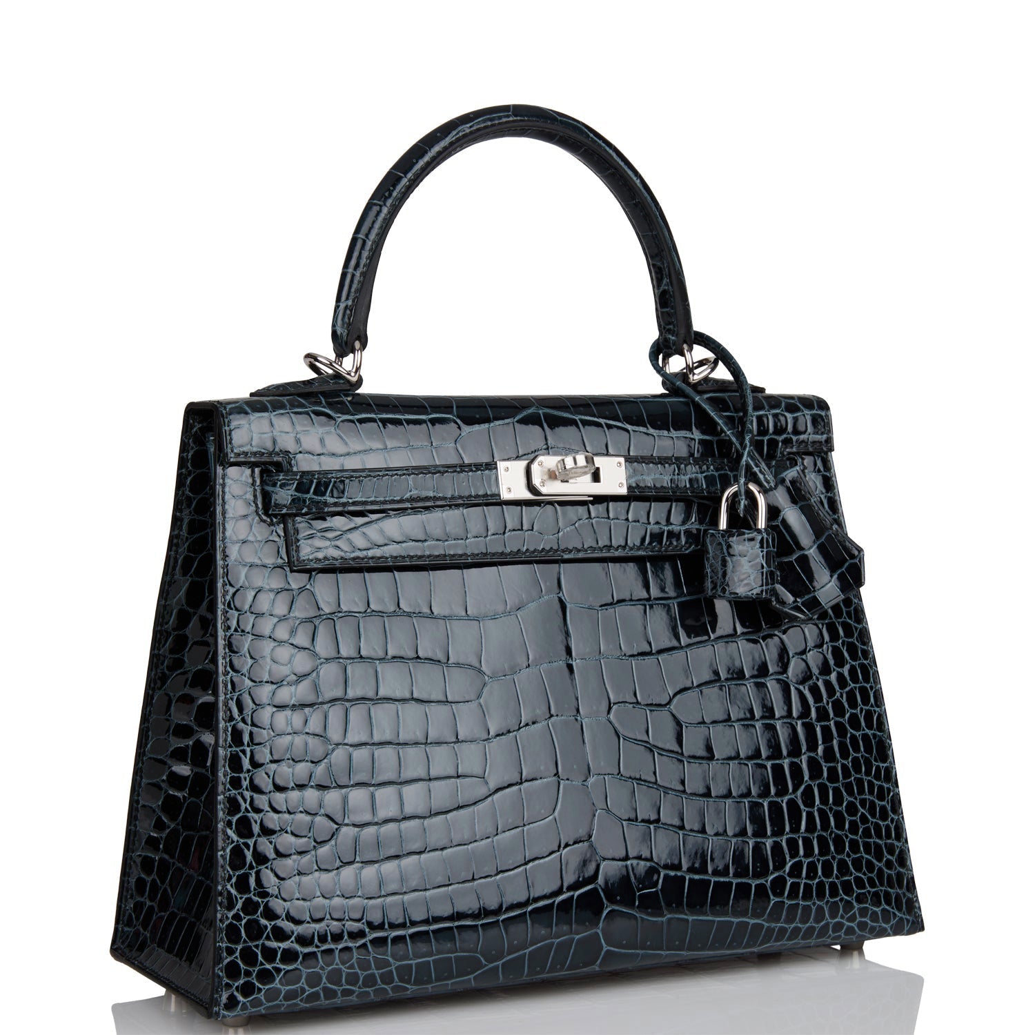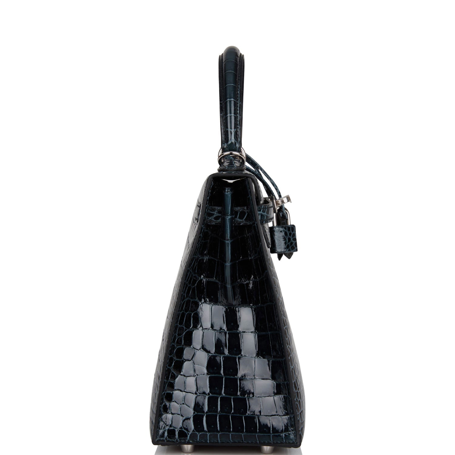 This Sellier Kelly is in Vert Rousseau shiny Niloticus crocodile with palladium hardware and has tonal stitching, front flap, two straps with center toggle closure, clochette with lock and two keys, single rolled handle and removable strap.