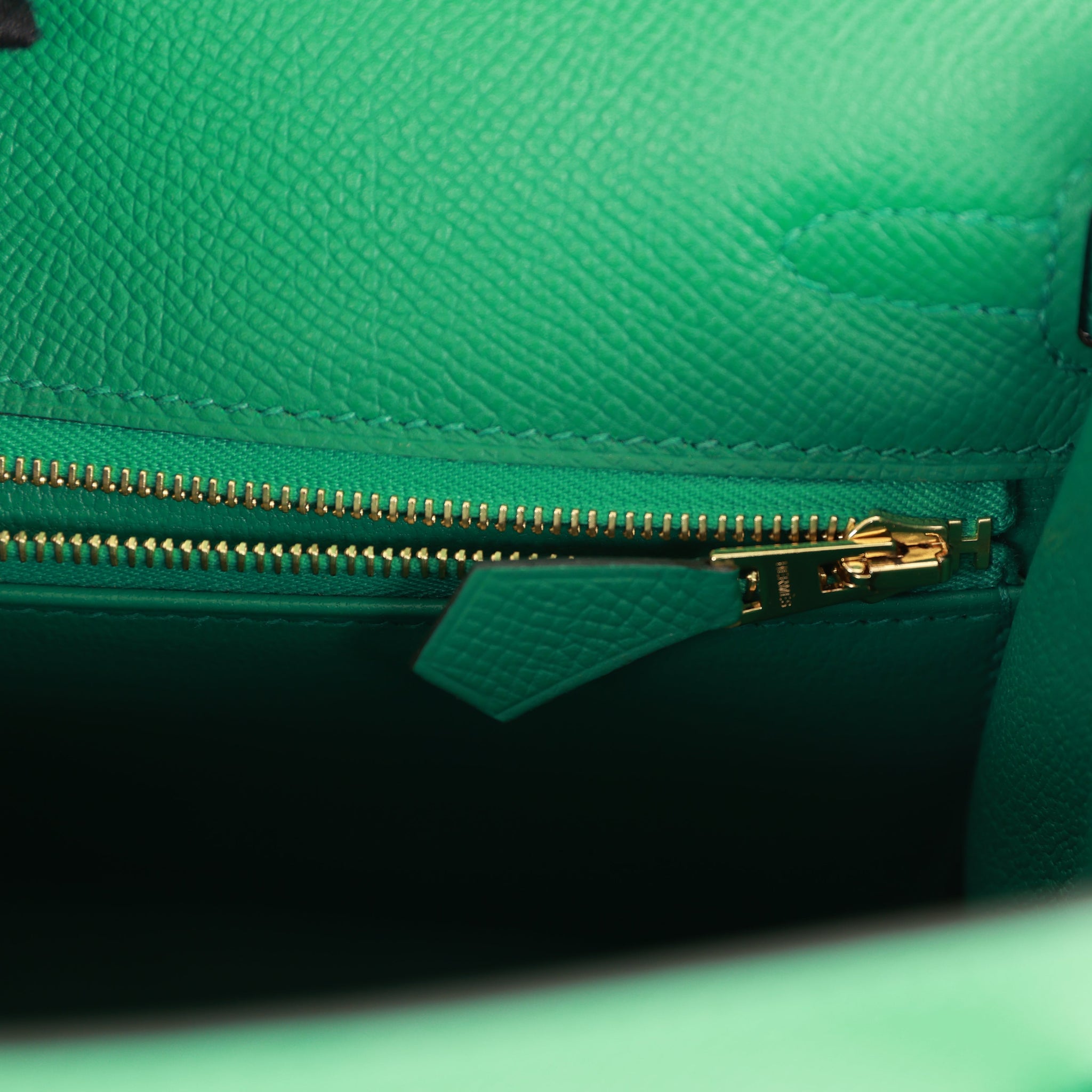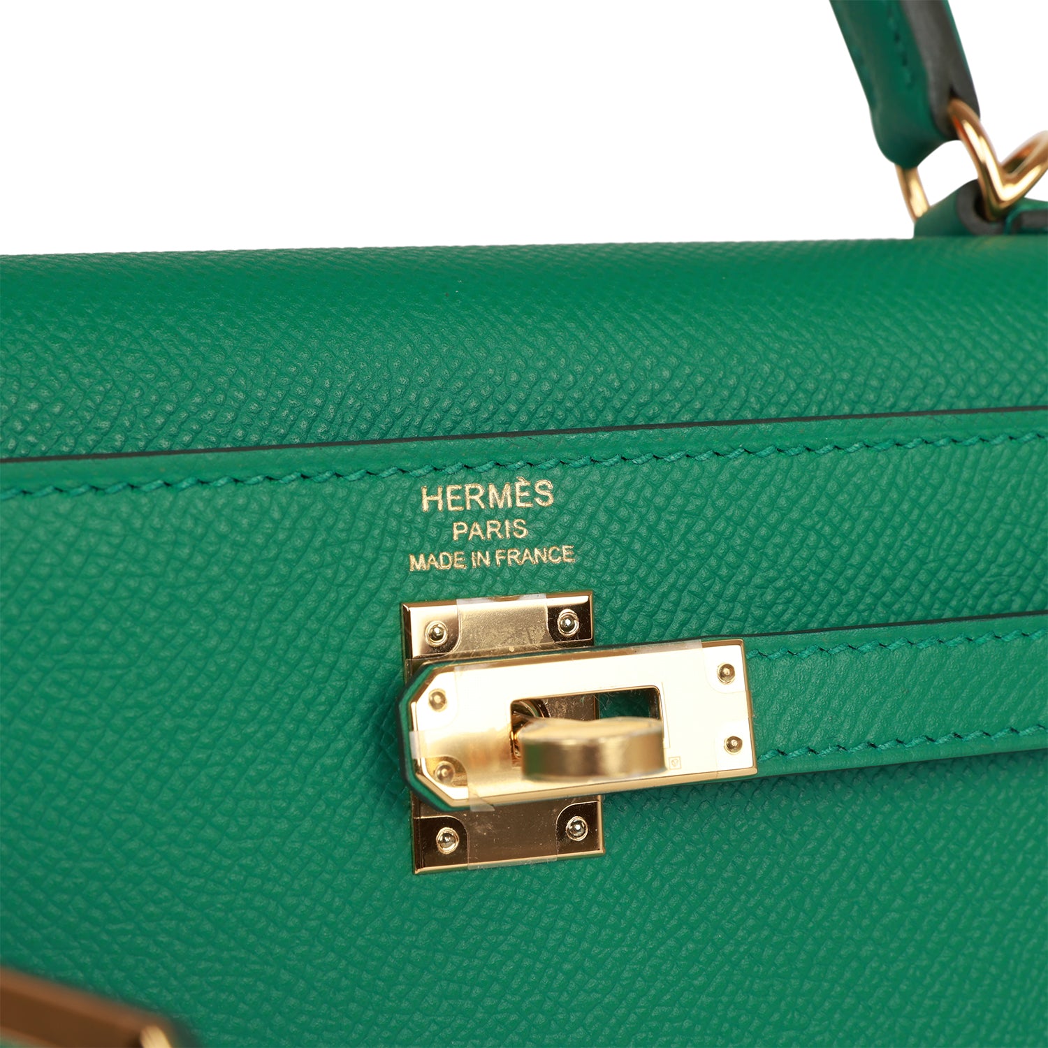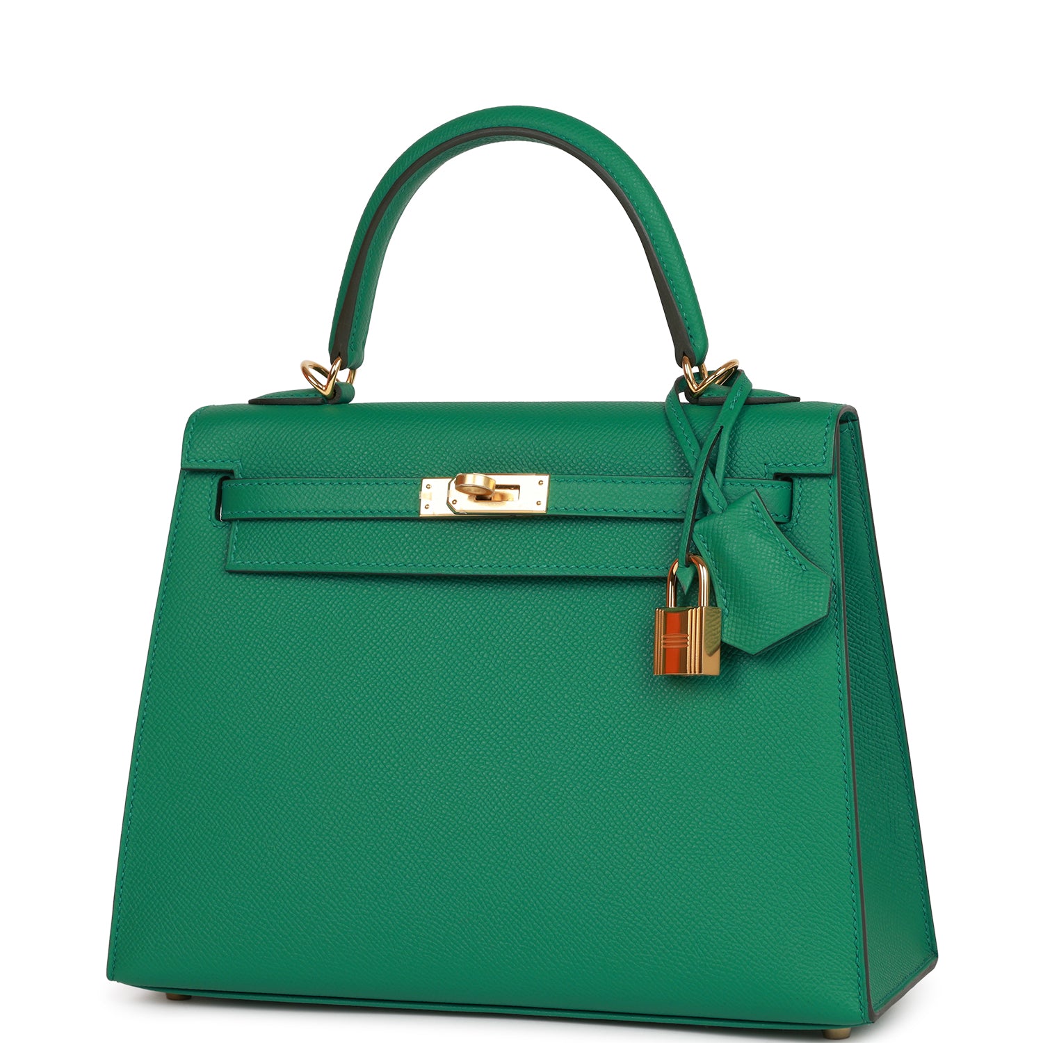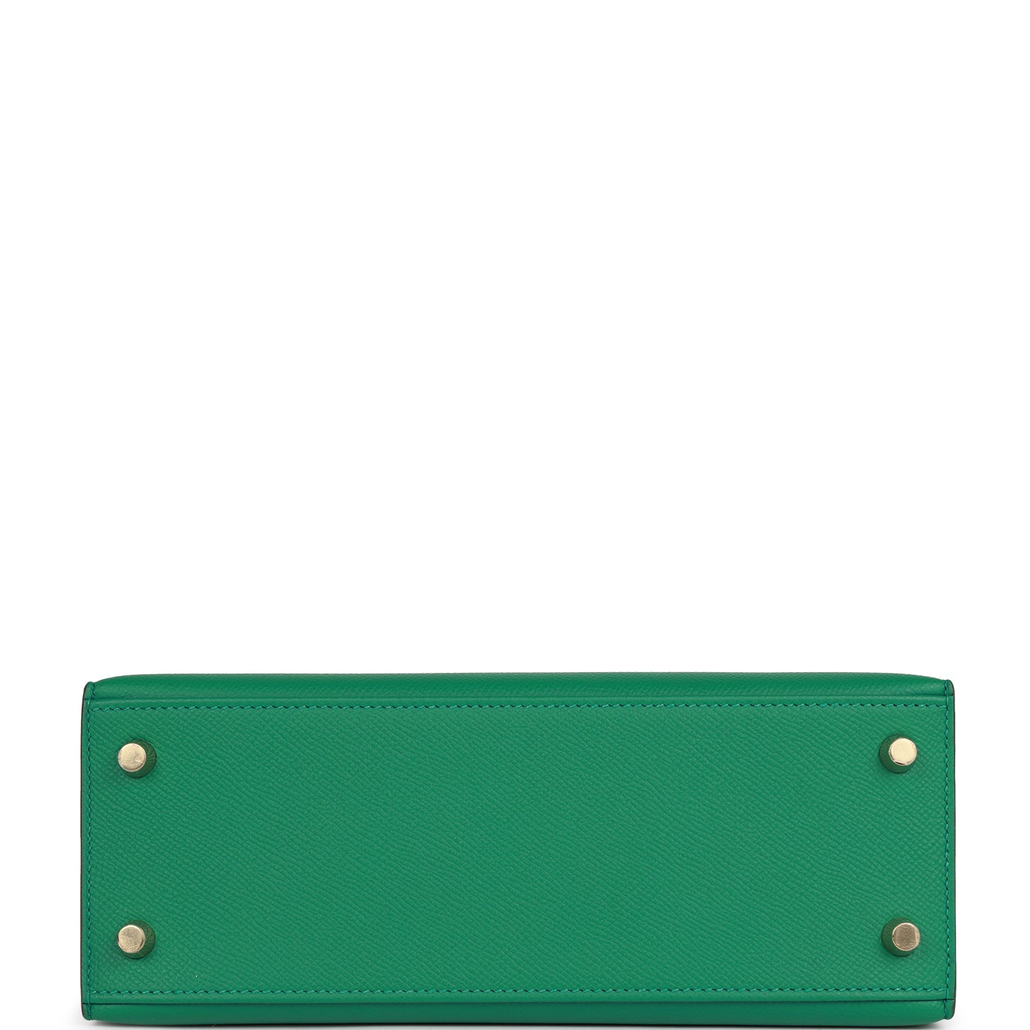 This Kelly, in the Sellier style, is in Vert Vertigo epsom leather with gold hardware and has tonal stitching, two straps with front toggle closure, clochette with lock and two keys, single rolled handle and removable shoulder strap.