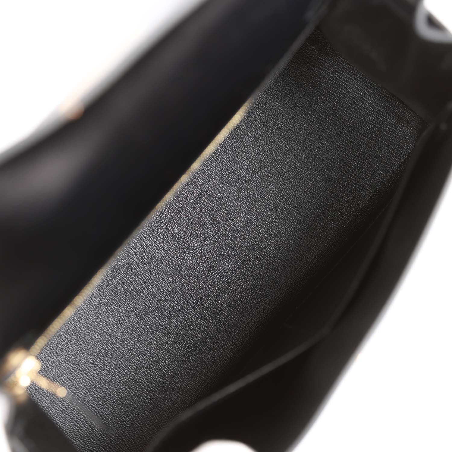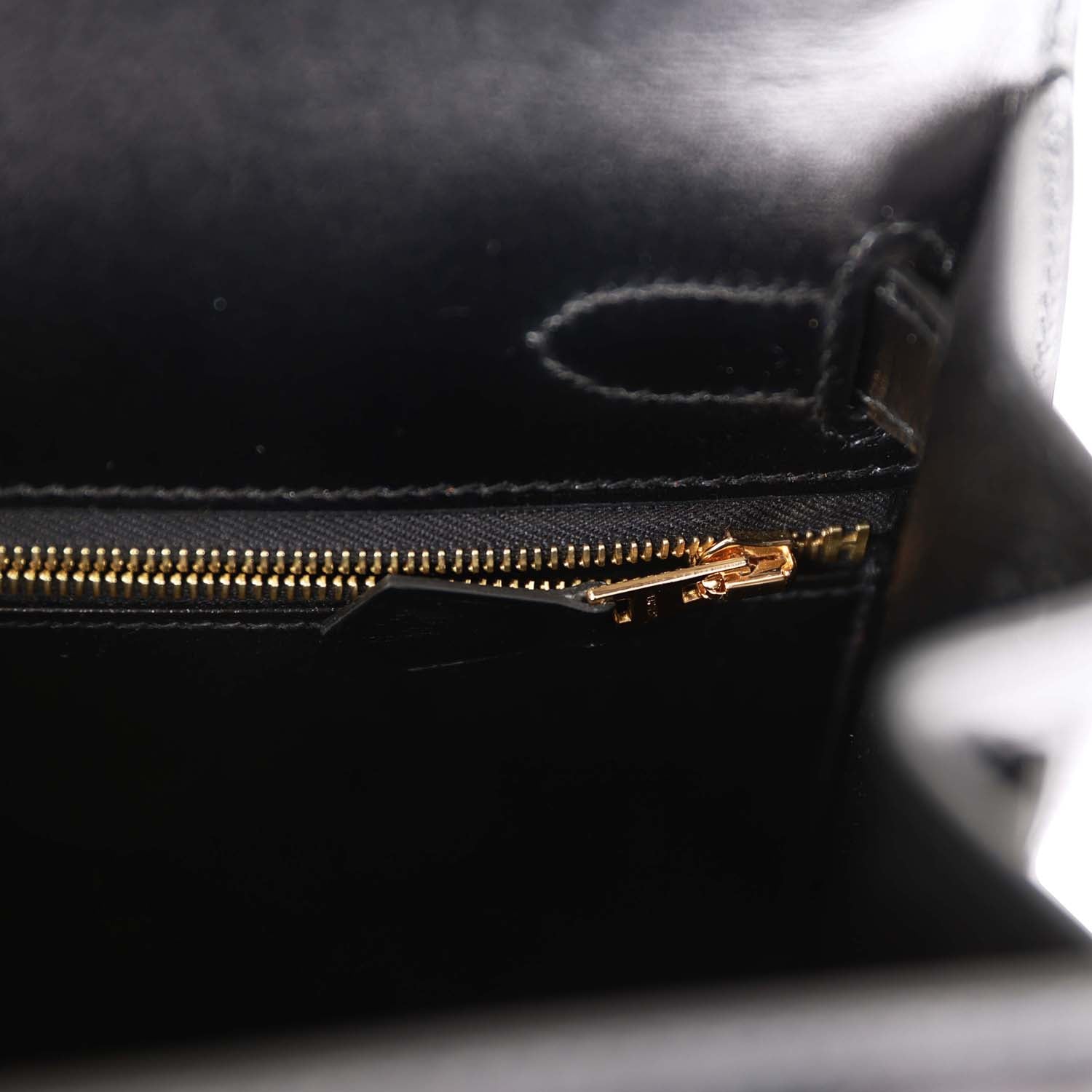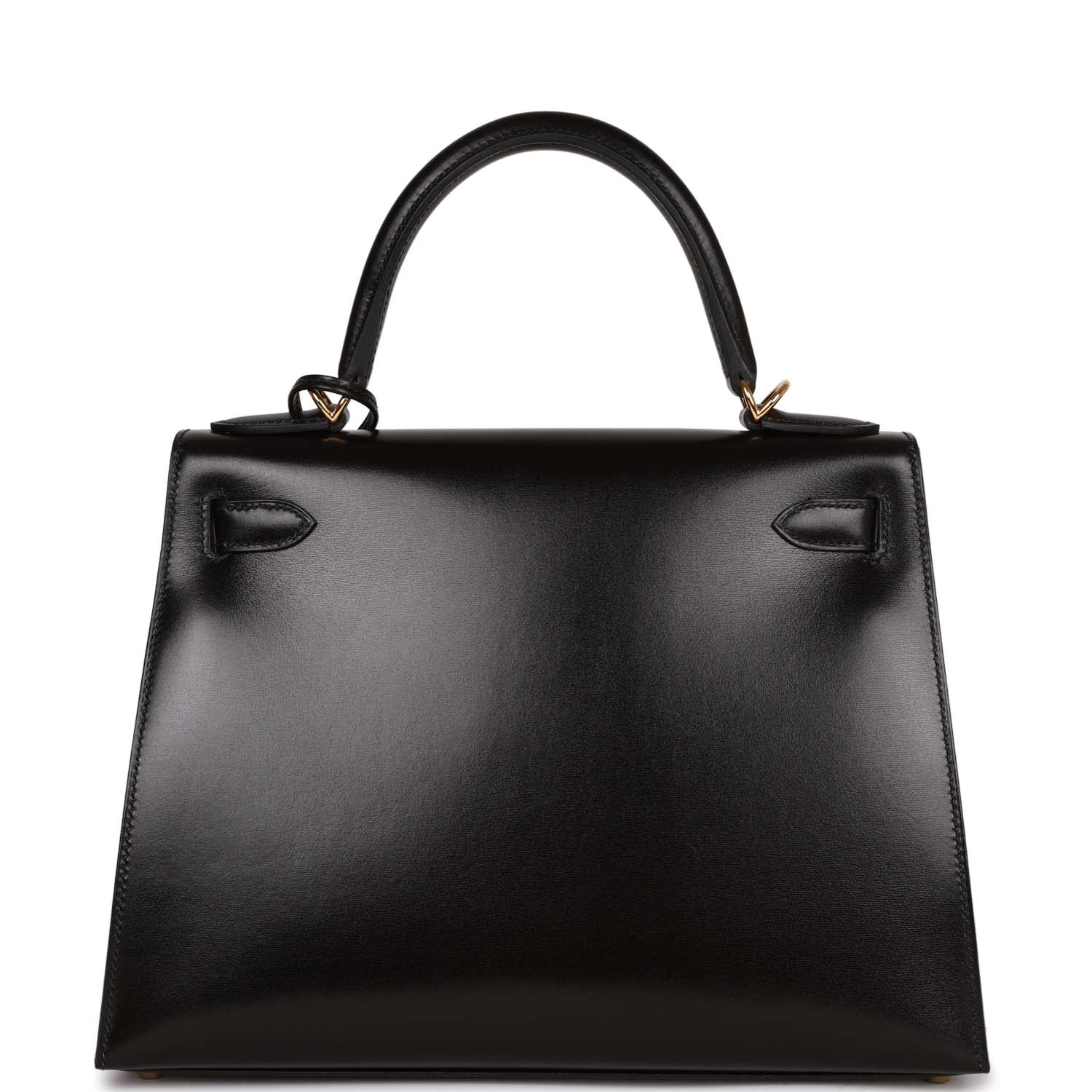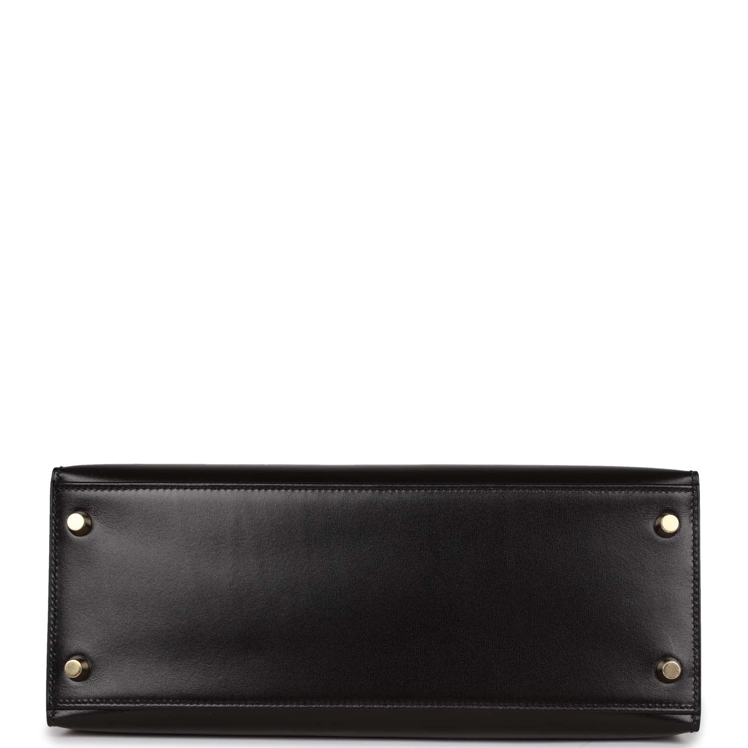 This Kelly, in the Sellier style, is in Black box leather with gold hardware and has tonal stitching, a front toggle closure, a clochette with lock and two keys and a single rolled handle.