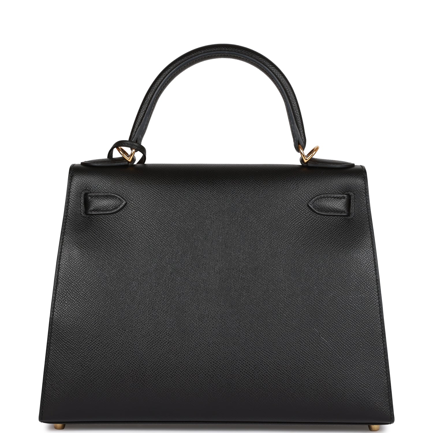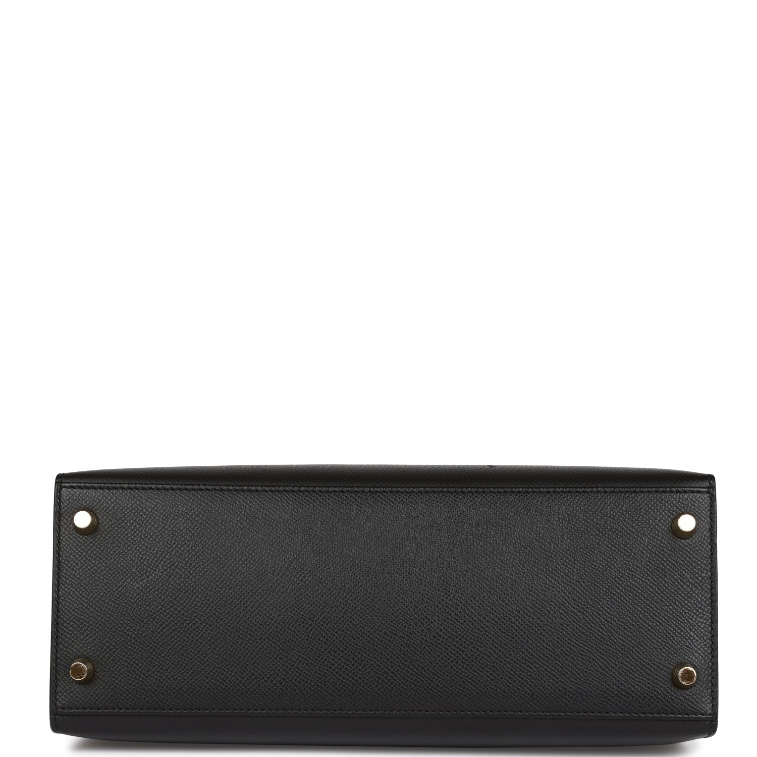 This Kelly Sellier is of black epsom leather with gold hardware and has tonal stitching, a front toggle closure, a clochette with lock and two keys, a single rolled handle and an optional shoulder strap.