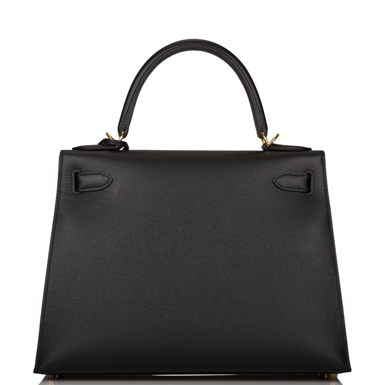 This Kelly Sellier is of black epsom leather with gold hardware and has tonal stitching, a front toggle closure, a clochette with lock and two keys, a single rolled handle and an optional shoulder strap.