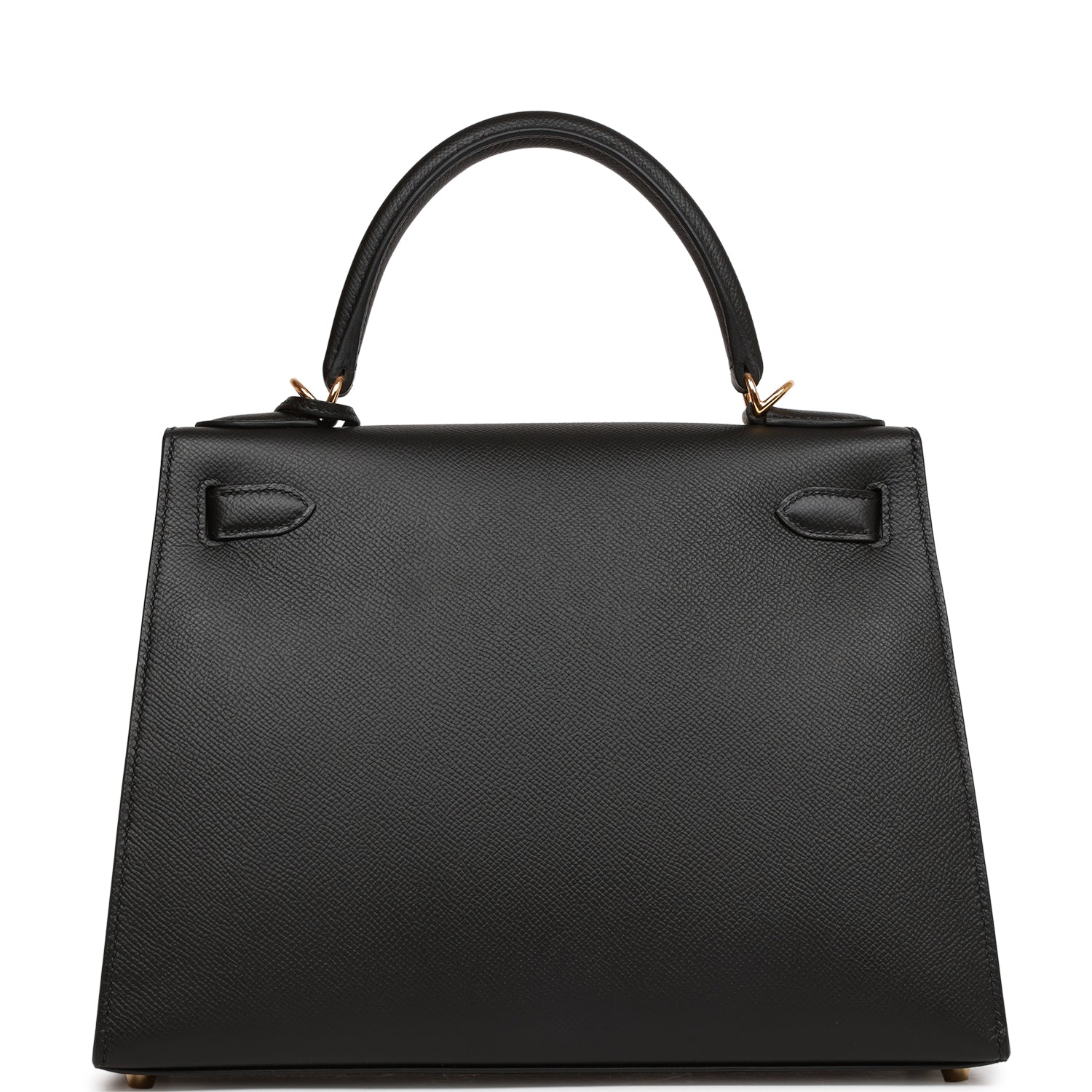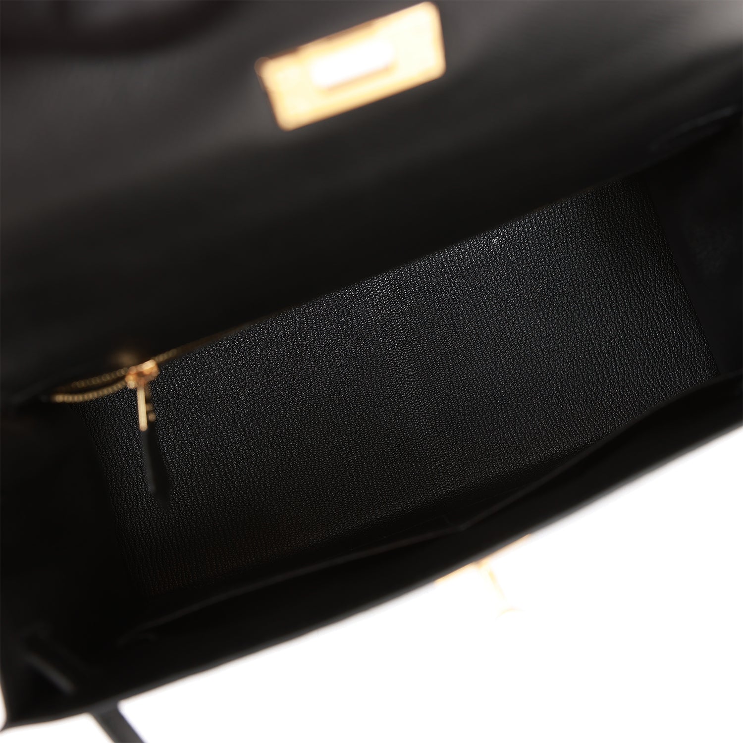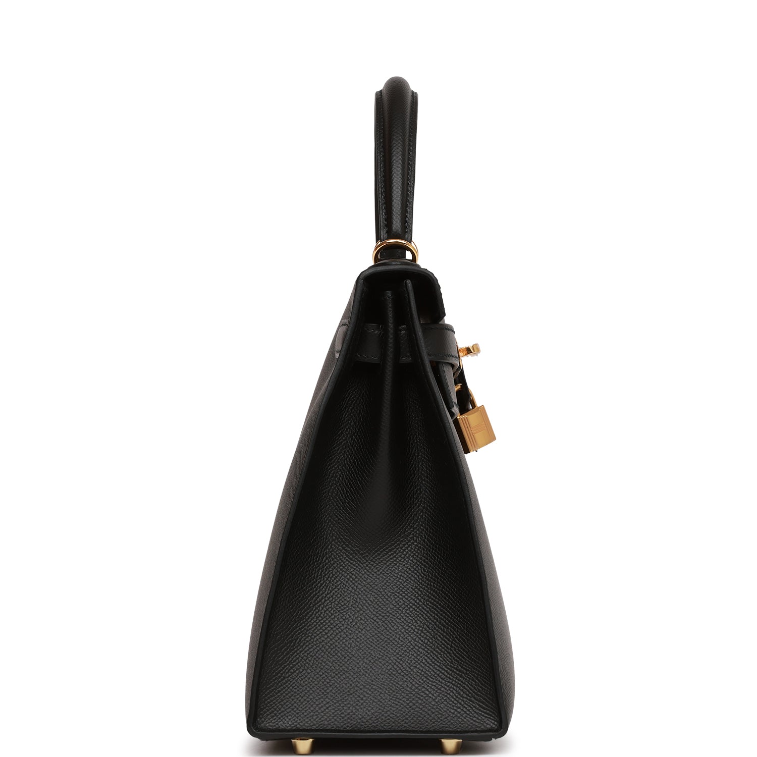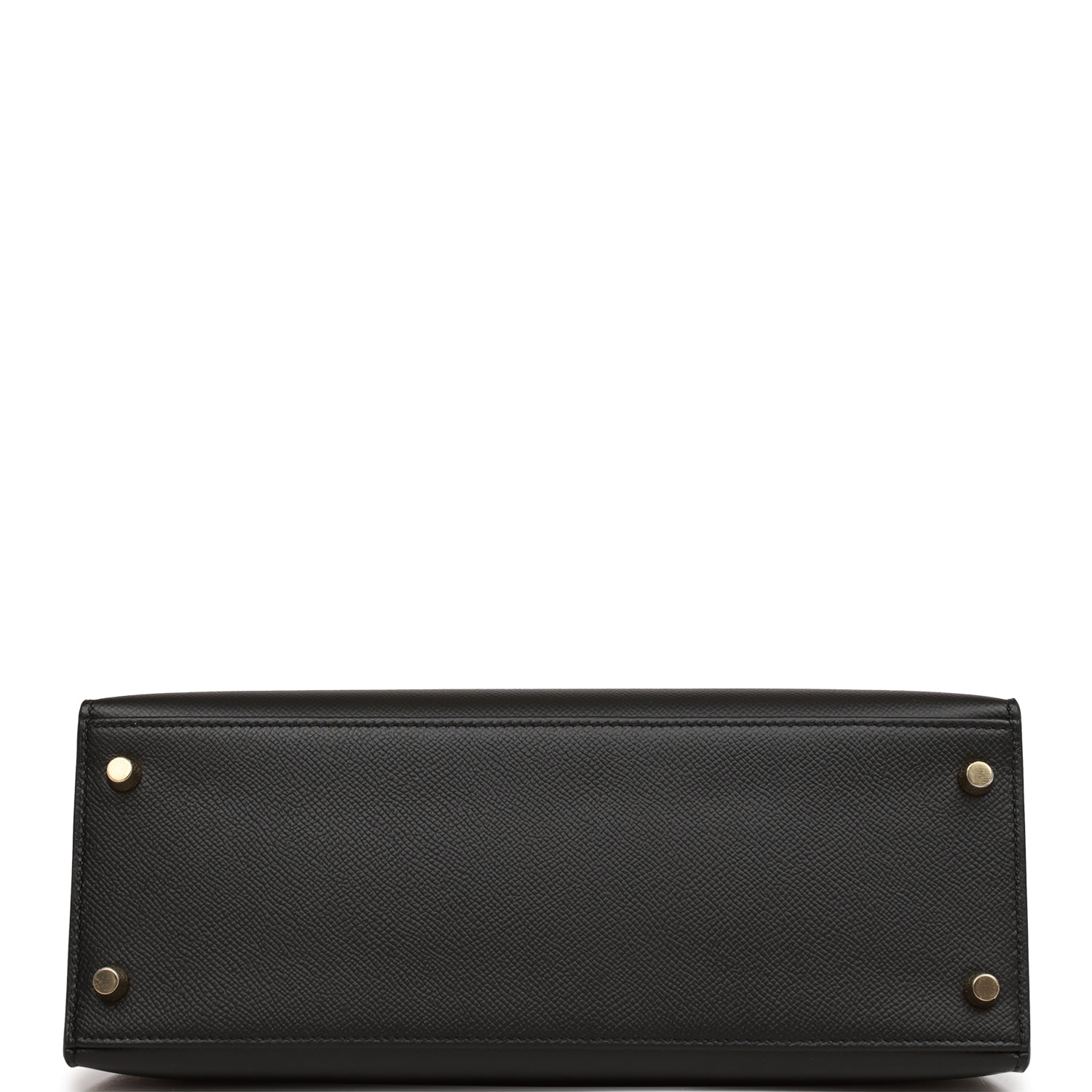This Kelly Sellier is of black epsom leather with gold hardware and has tonal stitching, a front toggle closure, a clochette with lock and two keys, a single rolled handle and an optional shoulder strap.