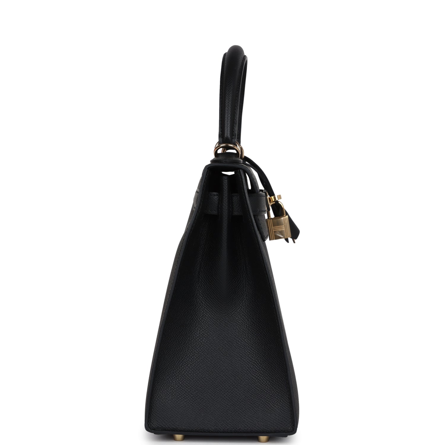 This Kelly, in the Sellier style, is in Black epsom leather with permabrass hardware and has tonal stitching, front flap, two straps with center toggle closure, clochette with lock and two keys, single rolled handle and removable shoulder strap.