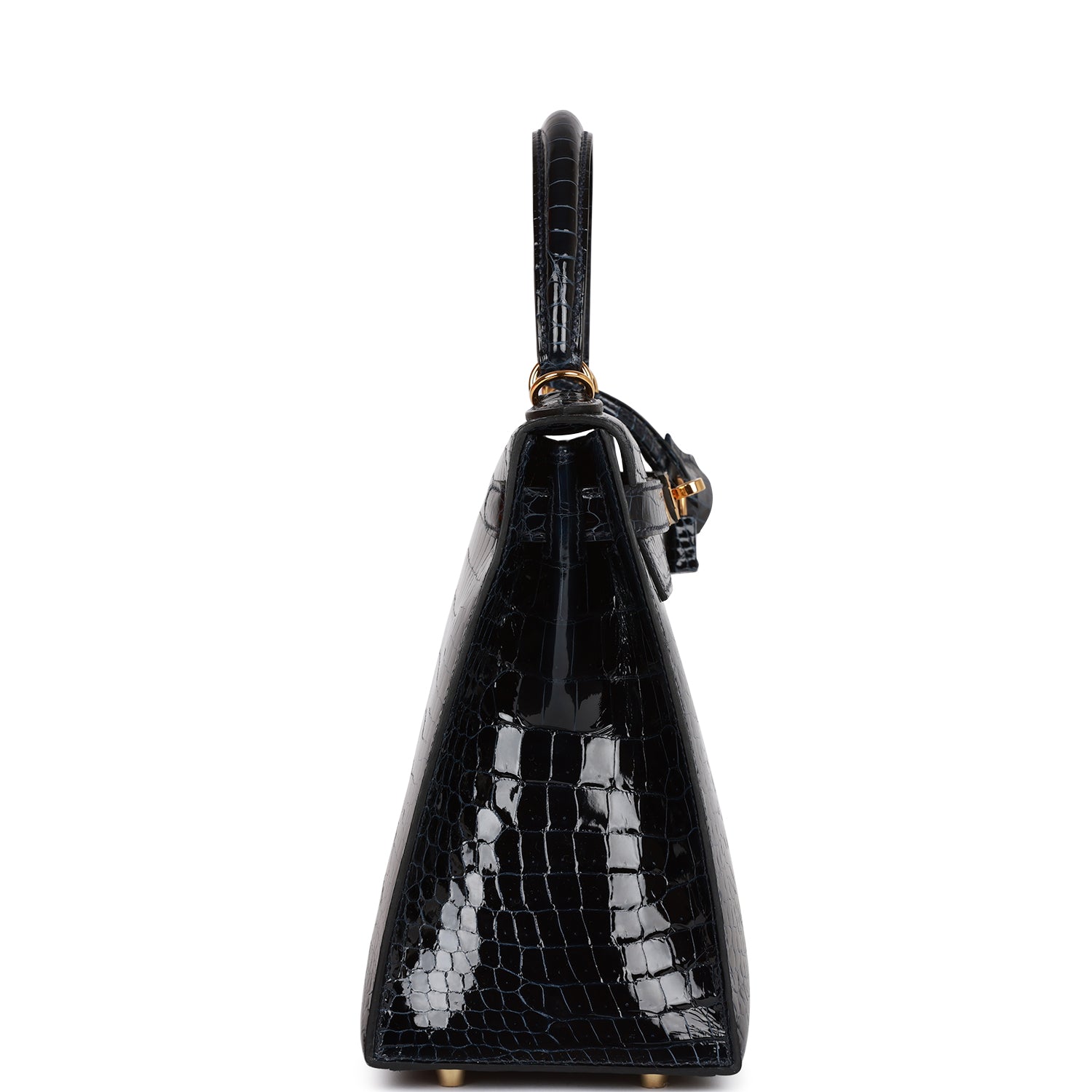 This Kelly, in the Sellier style, is of Bleu Baltique shiny porosus crocodile with gold hardware and features tonal stitching, a front toggle closure, a clochette with lock and two keys and a single rolled handle.
