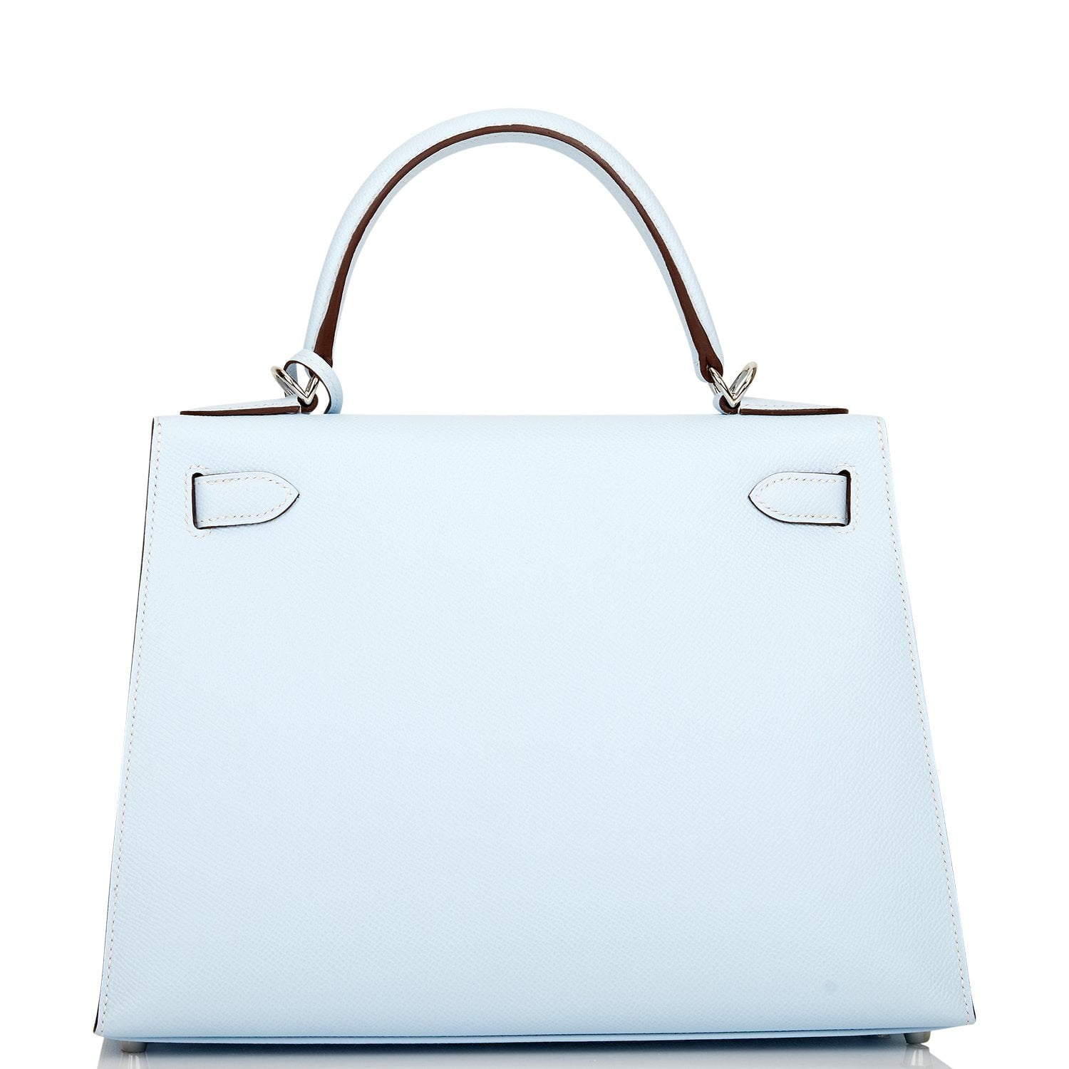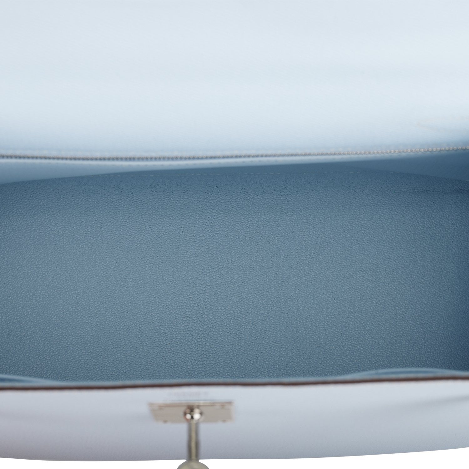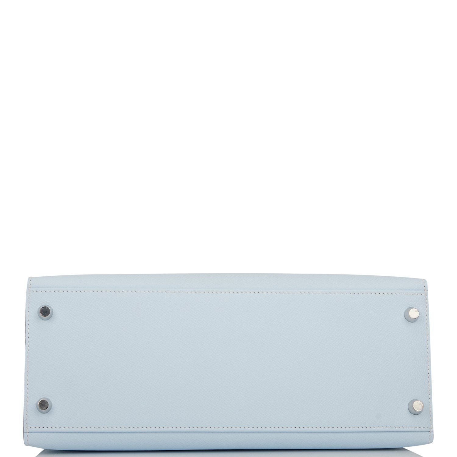 This Kelly, in the Sellier style, is in Bleu Brume epsom leather with palladium hardware and has tonal stitching, front flap, two straps with center toggle closure, clochette with lock and two keys a single rolled handle and removable shoulder strap.