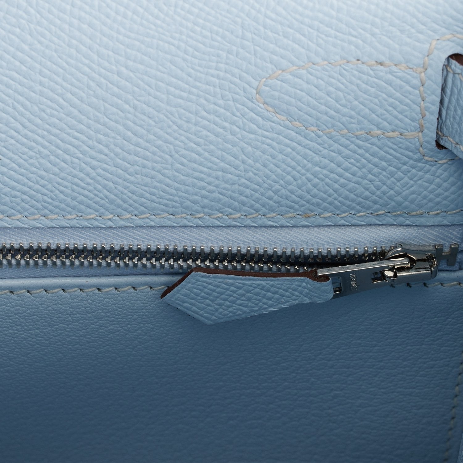 The interior is lined with Bleu Brume chevre leather and has one zip pocket with an Hermes engraved pull and two open pockets on the opposite side.