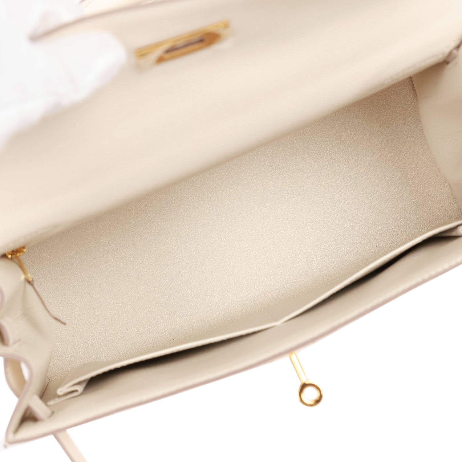 The interior is lined with Craie chevre leather and has one zip pocket with an Hermes engraved pull and two open pockets on the opposite side.