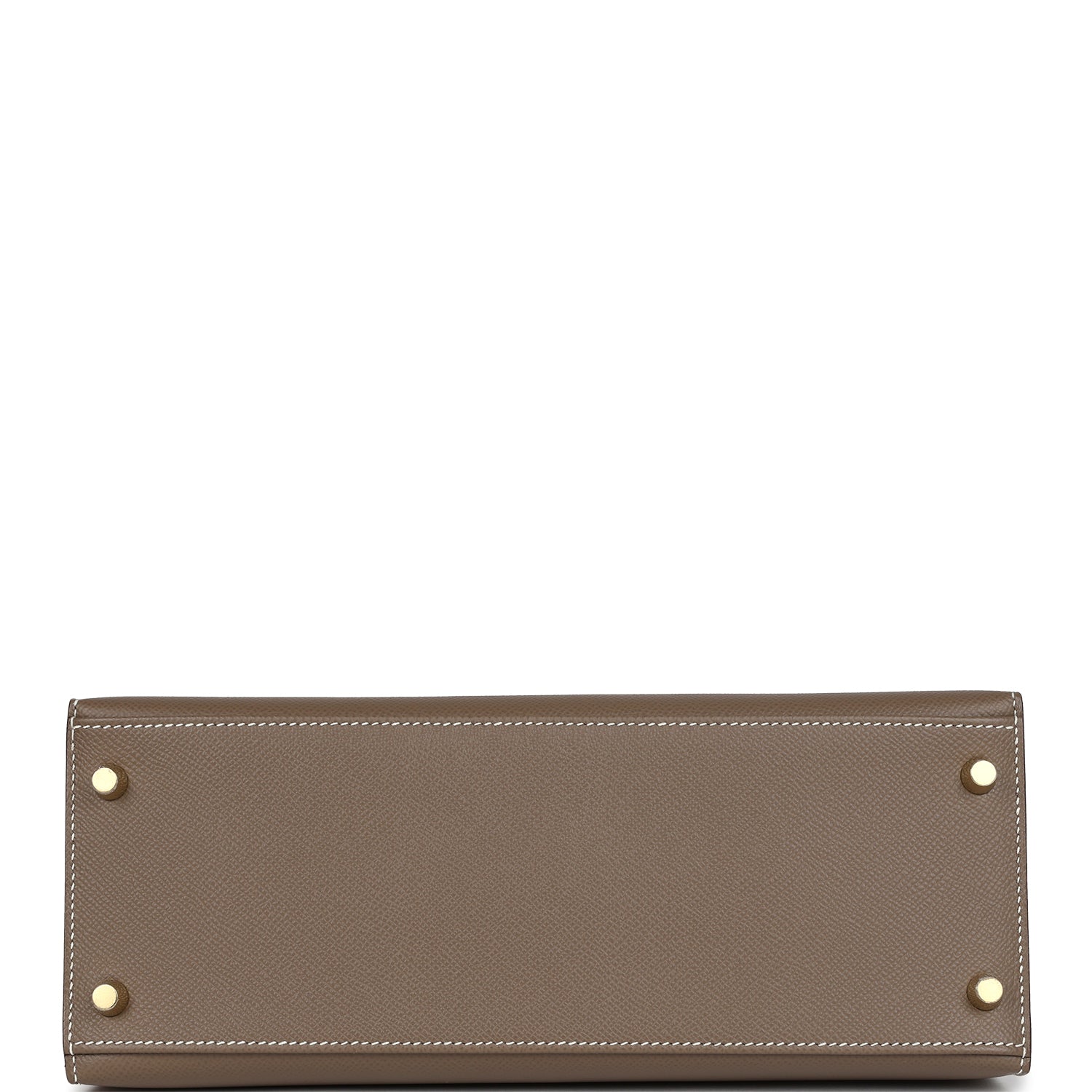 This Kelly, in the Sellier style, is in Etoupe epsom leather with gold hardware and has contrast stitching, front flap, two straps with center toggle closure, clochette with lock and two keys a single rolled handle and removable shoulder strap.