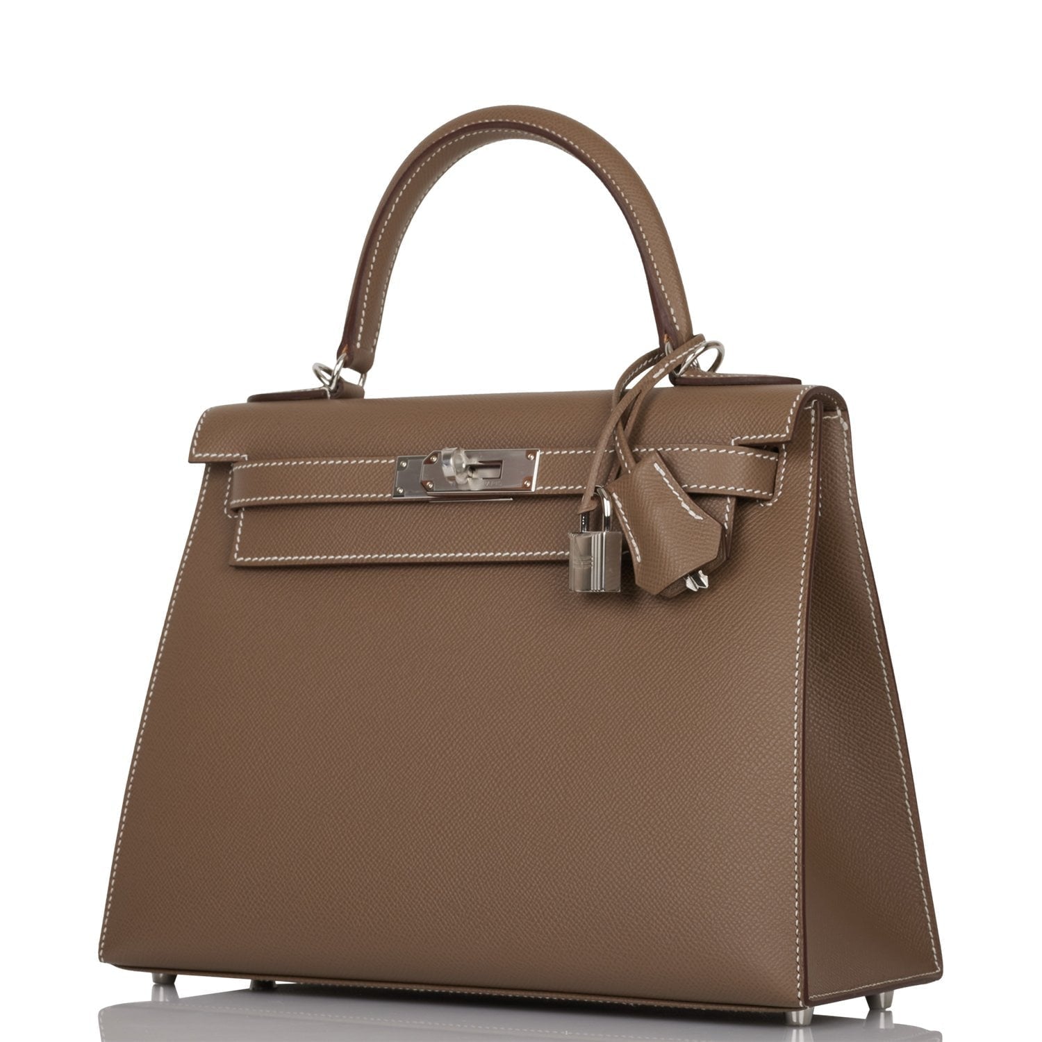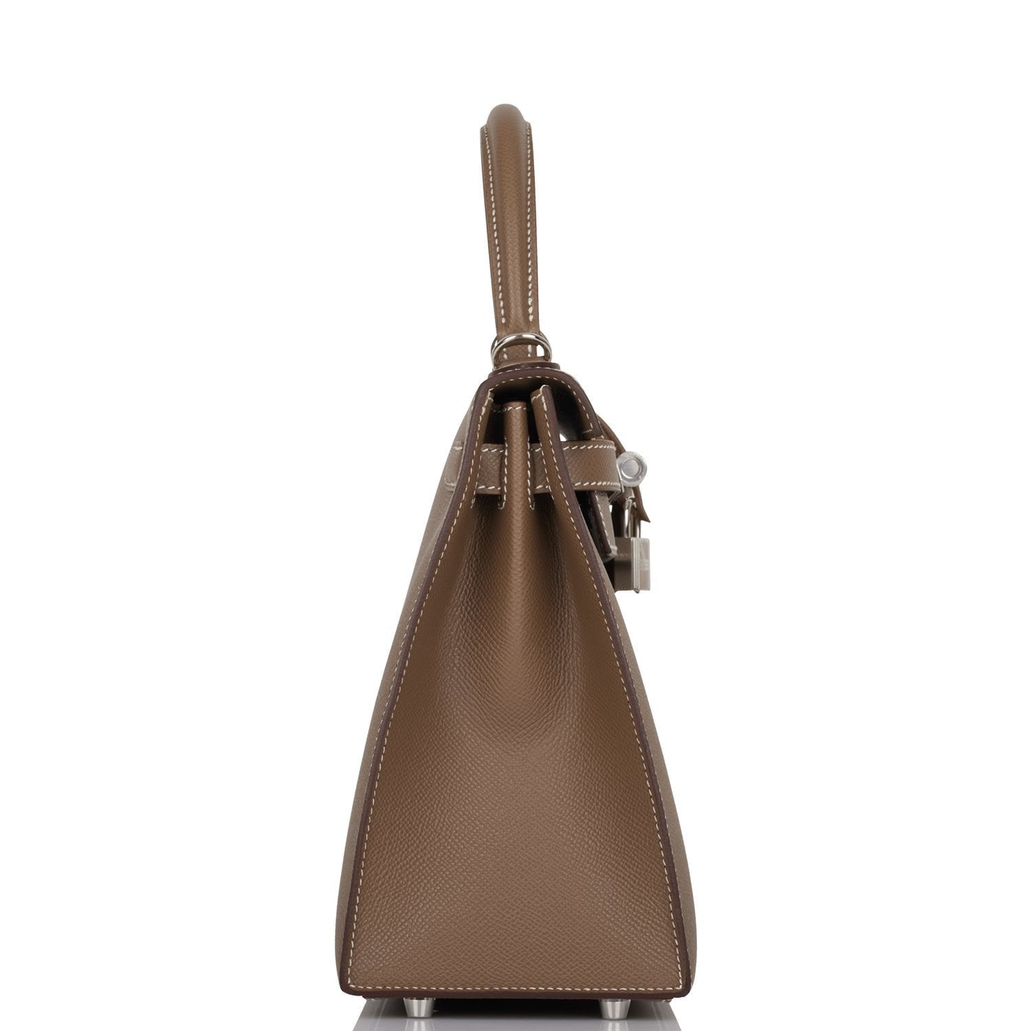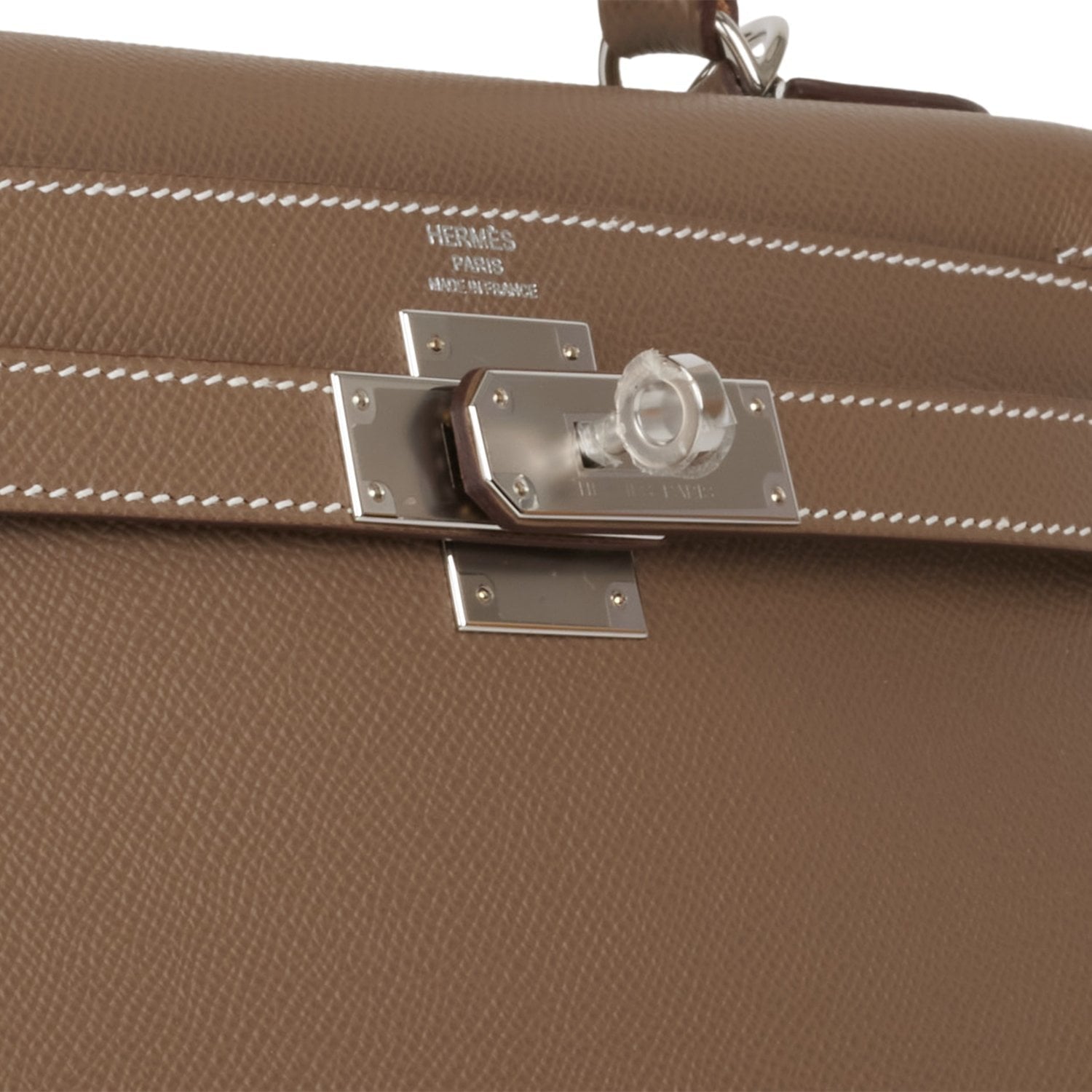 This Kelly, in the Sellier style, is in Etoupe epsom leather with palladium hardware and has contrast stitching, front flap, two straps with center toggle closure, clochette with lock and two keys a single rolled handle and removable shoulder strap.