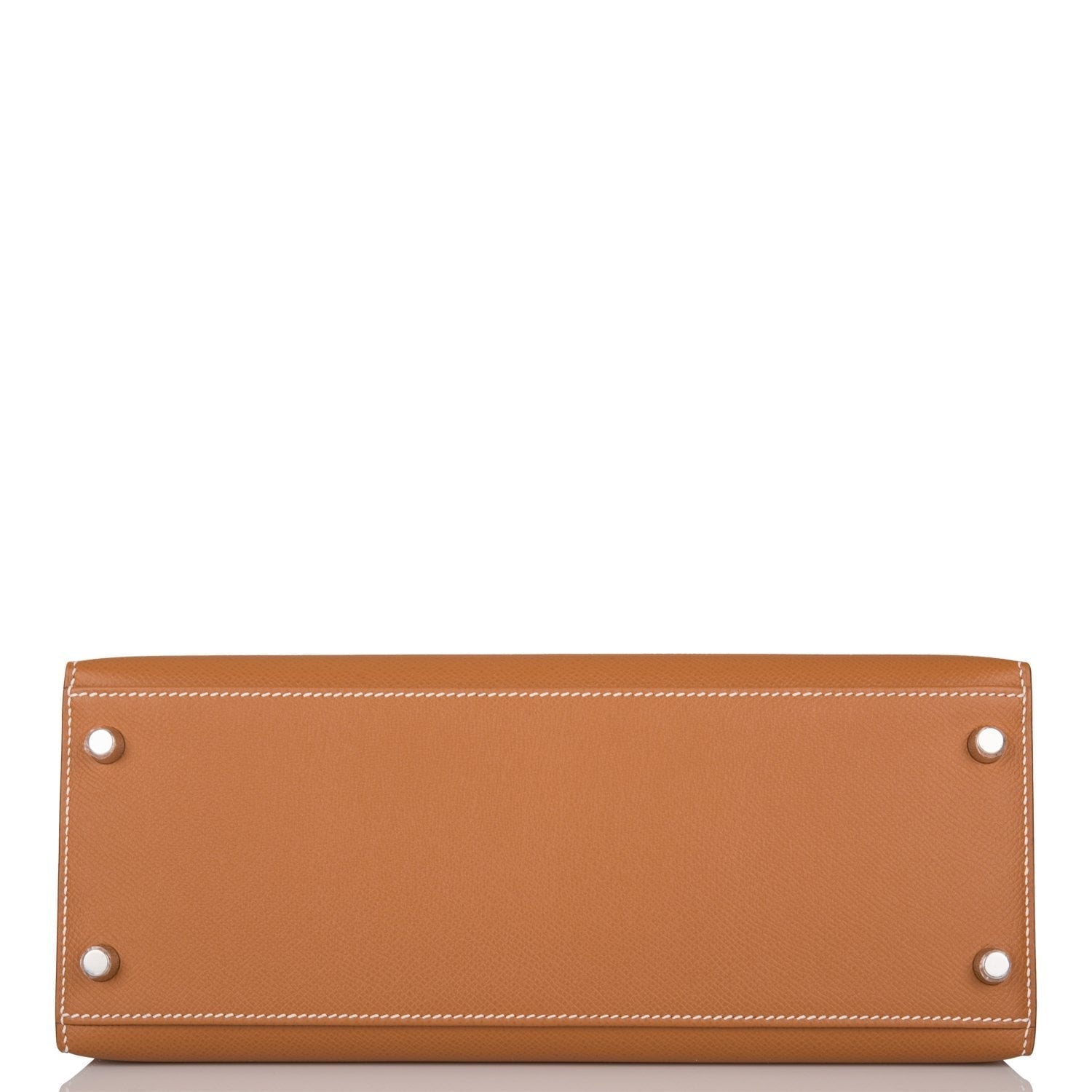 This Kelly, in the Sellier style, is in gold epsom leather with palladium hardware and has contrast stitching, front flap, two straps with center toggle closure, clochette with lock and two keys a single rolled handle and removable shoulder strap.
