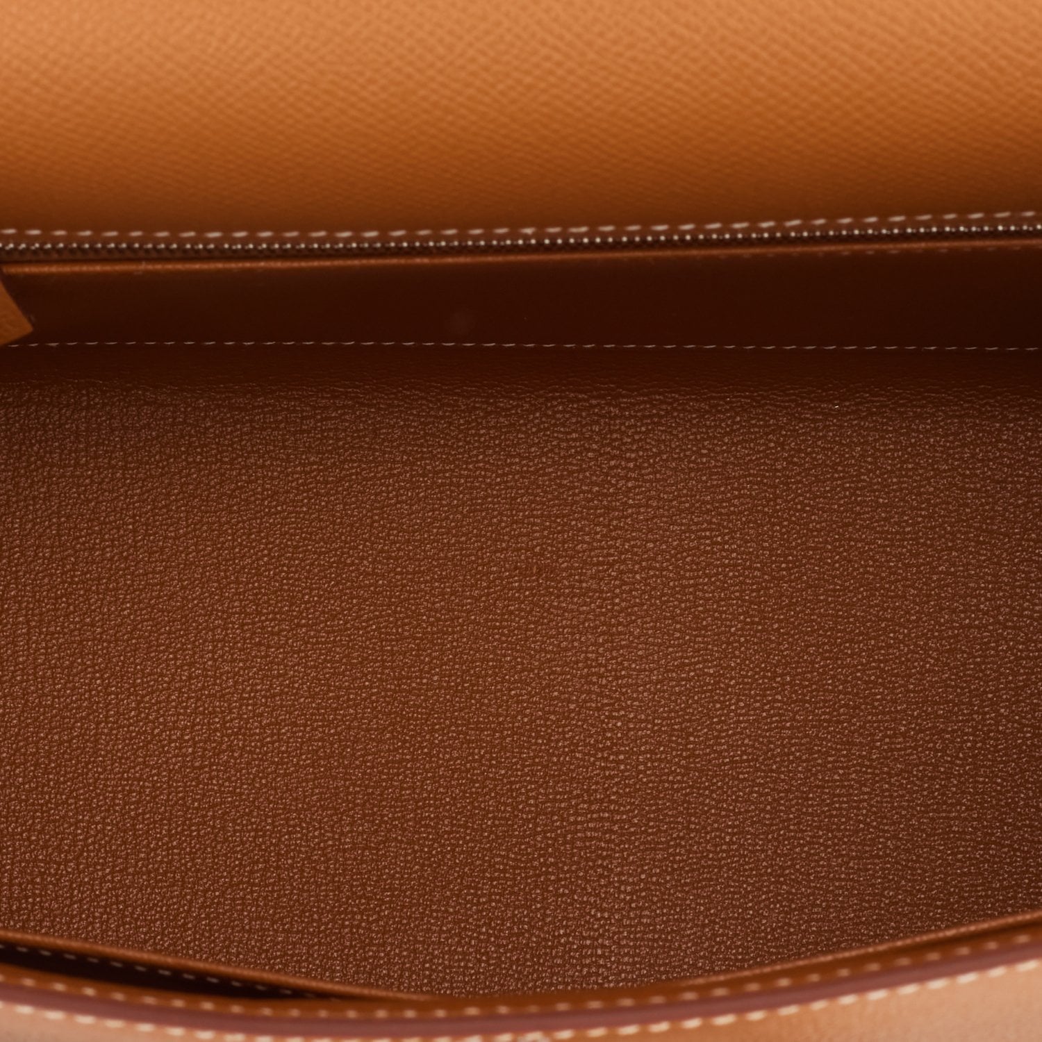 This Kelly, in the Sellier style, is in gold epsom leather with palladium hardware and has contrast stitching, front flap, two straps with center toggle closure, clochette with lock and two keys a single rolled handle and removable shoulder strap.