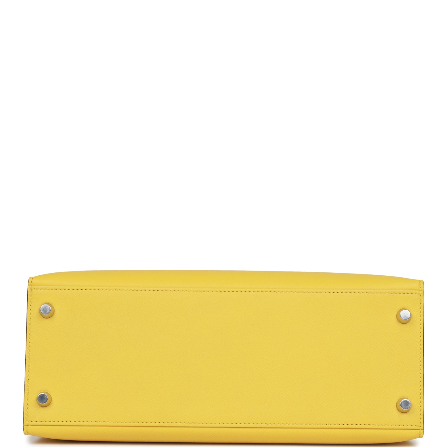 This Kelly Sellier is of Jaune de Naples epsom leather with palladium hardware and has tonal stitching, a front toggle closure, a clochette with lock and two keys, a single rolled handle and an optional shoulder strap.
