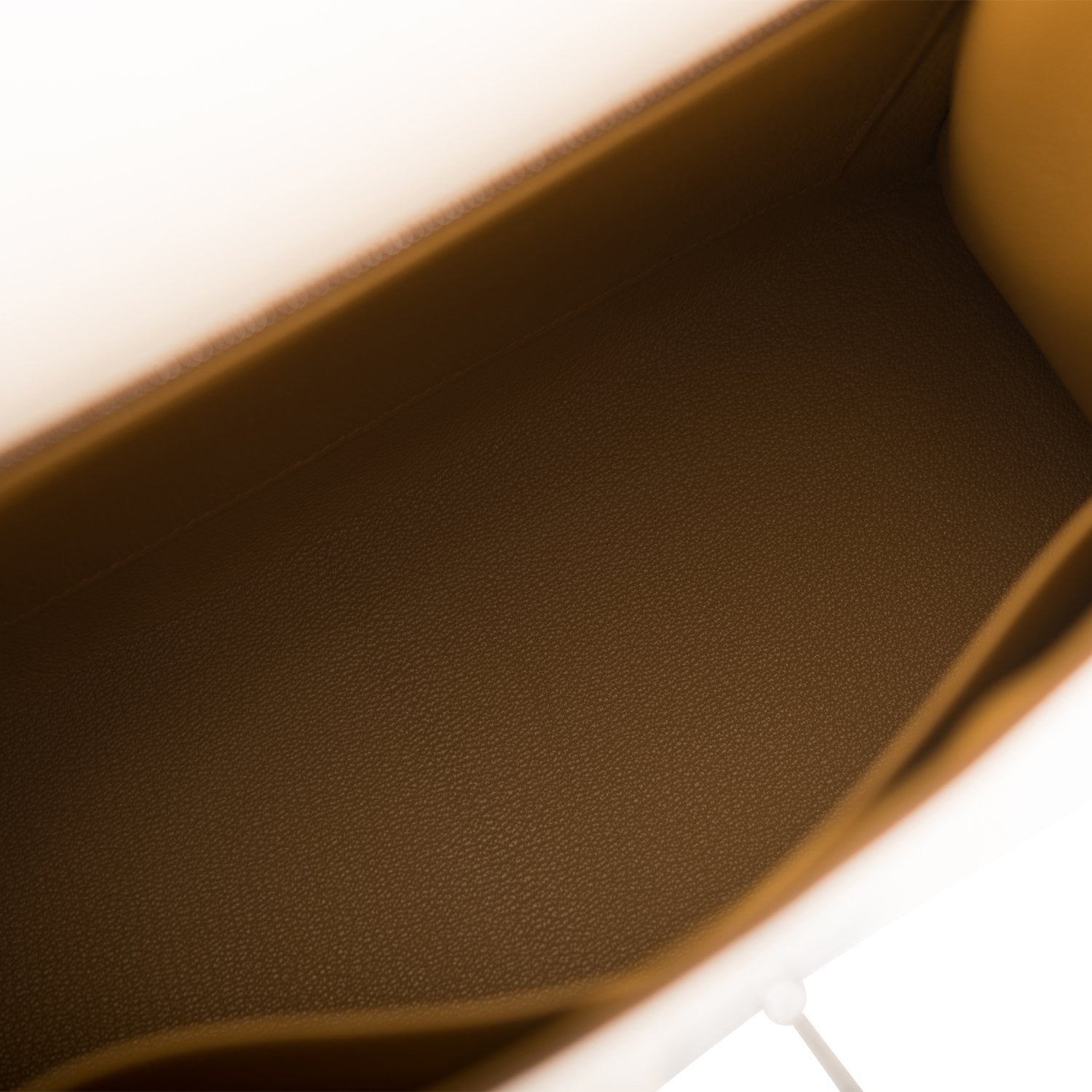 This Kelly, in the Sellier style, is in Nata epsom leather with palladium hardware and has an Ocre interior, tonal stitching, front flap, two straps with center toggle closure, clochette with lock and two keys, single rolled handle and removable shoulder strap.