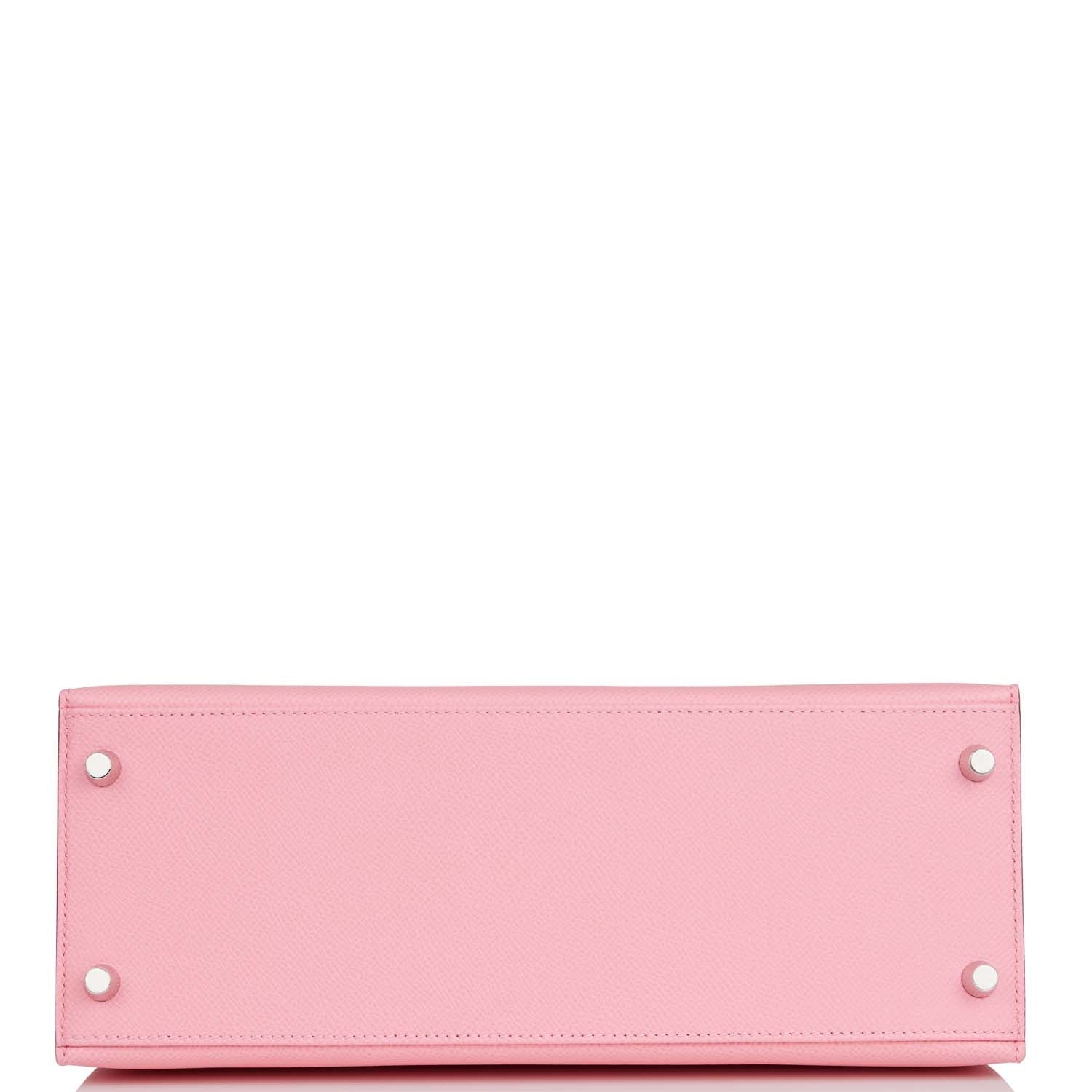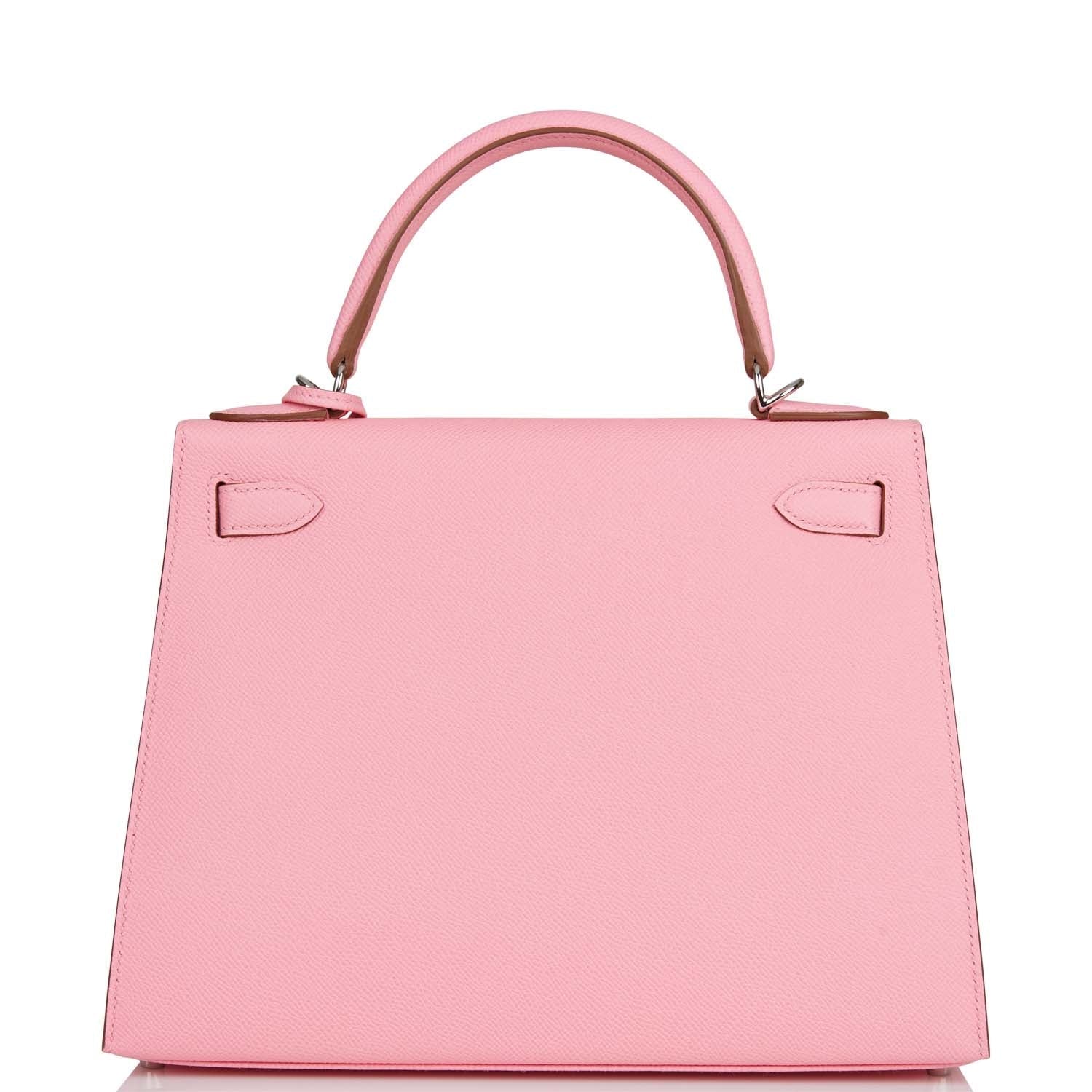 This Kelly, in the Sellier style, is in Rose Confetti epsom leather with palladium hardware and has tonal stitching, front flap, two straps with center toggle closure, clochette with lock and two keys a single rolled handle and removable shoulder strap.