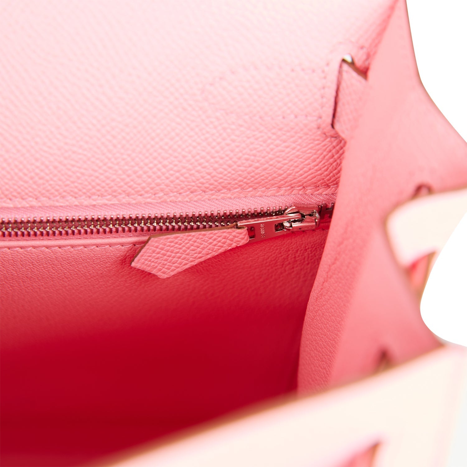 The interior is lined with Rose Confetti chevre leather and has one zip pocket with an Hermes engraved pull and two open pockets on the opposite side.