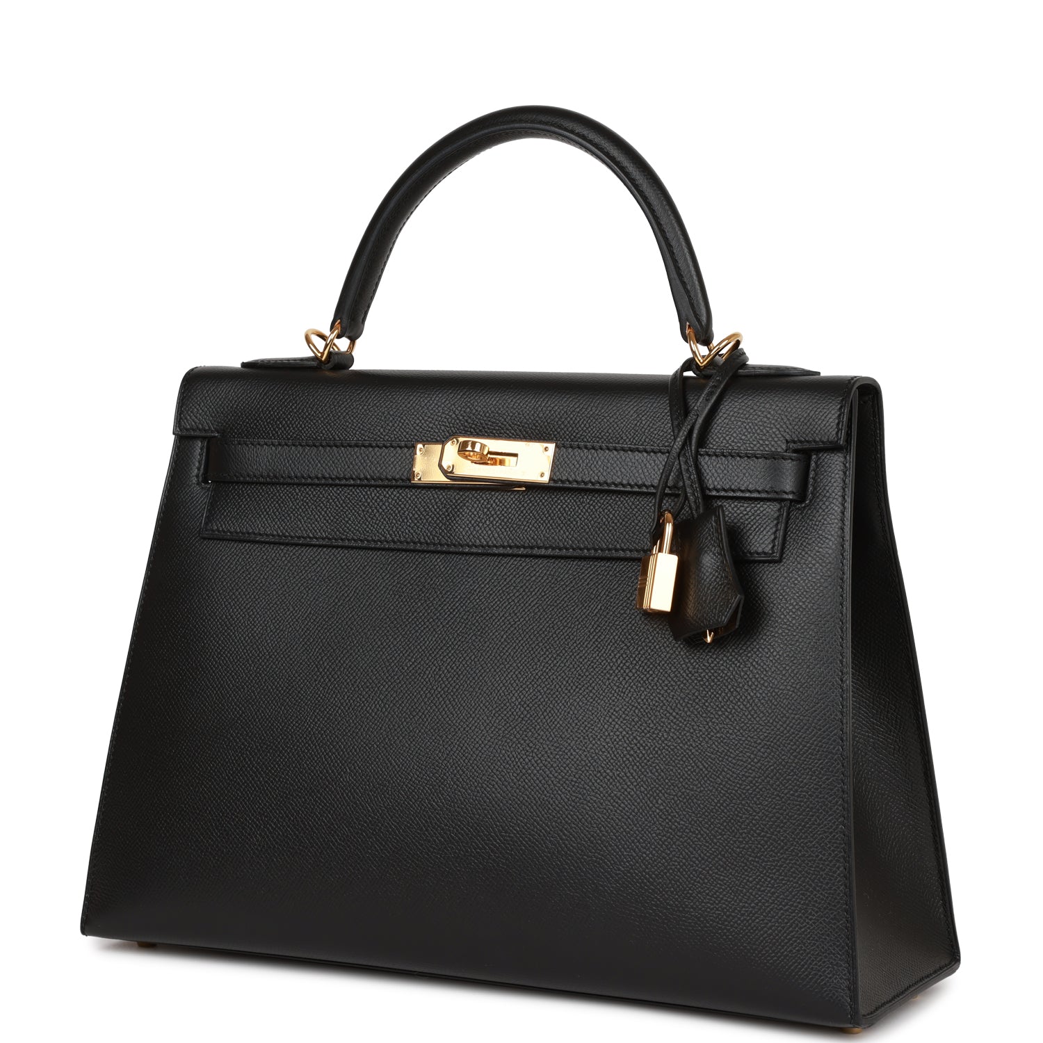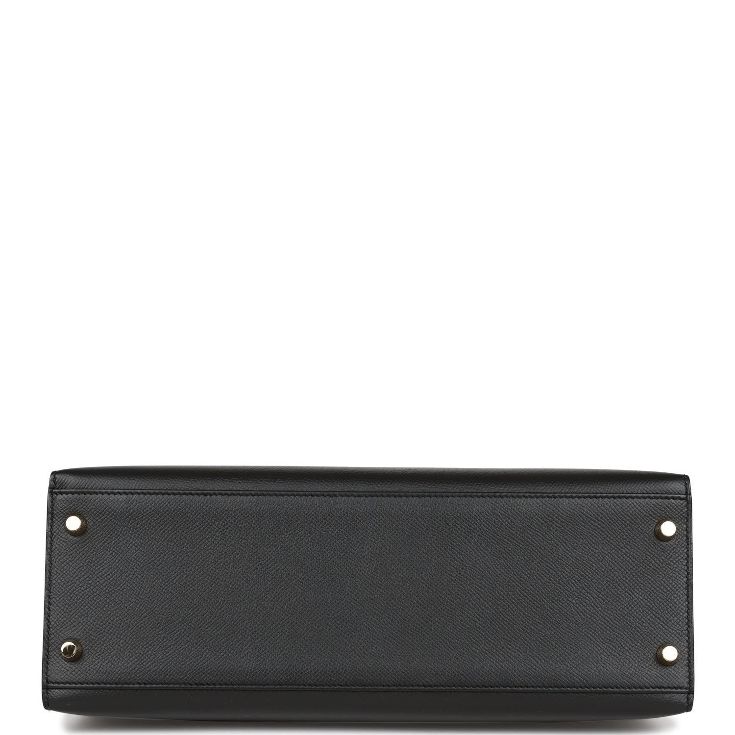 This Kelly, in the Sellier style, is in Black epsom leather with gold hardware and has tonal stitching, two straps with front toggle closure, clochette with lock and two keys, single rolled handle and optional shoulder strap.