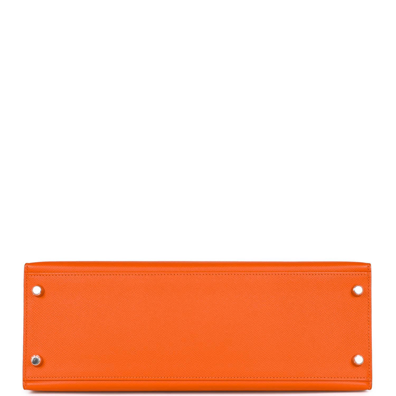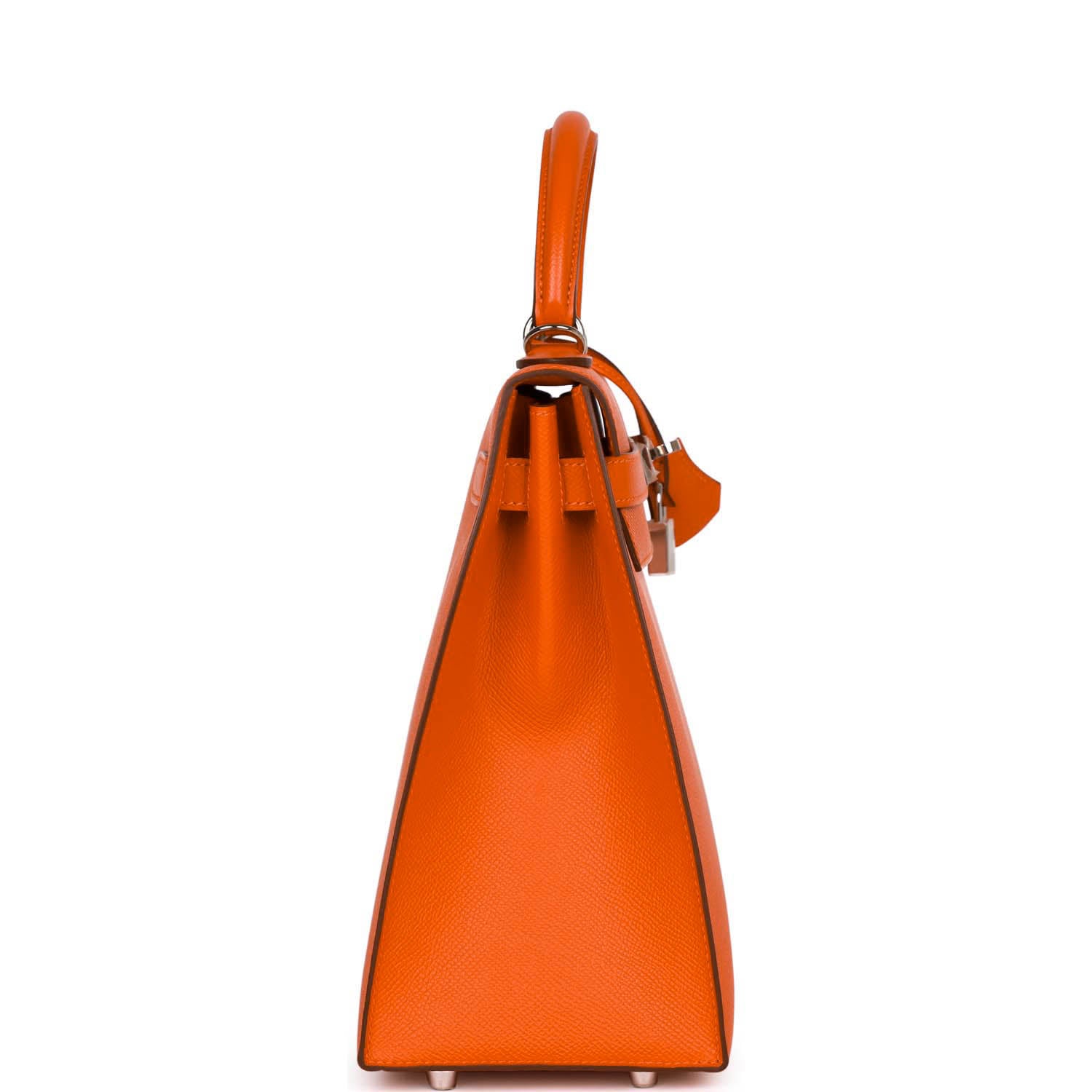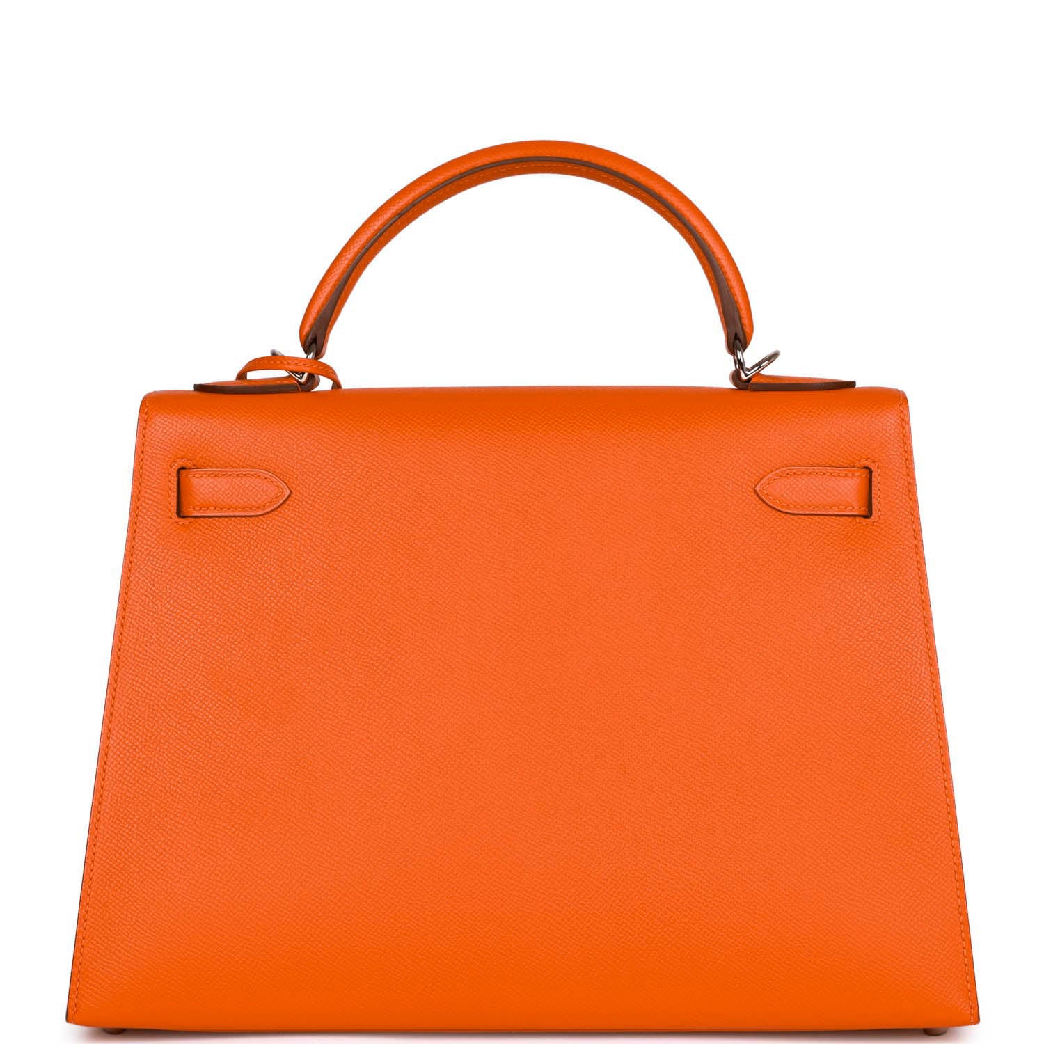This Kelly, in the Sellier style, is in Feu epsom leather with palladium hardware and has tonal stitching, two straps with front toggle closure, clochette with lock and two keys, single rolled handle and optional shoulder strap.