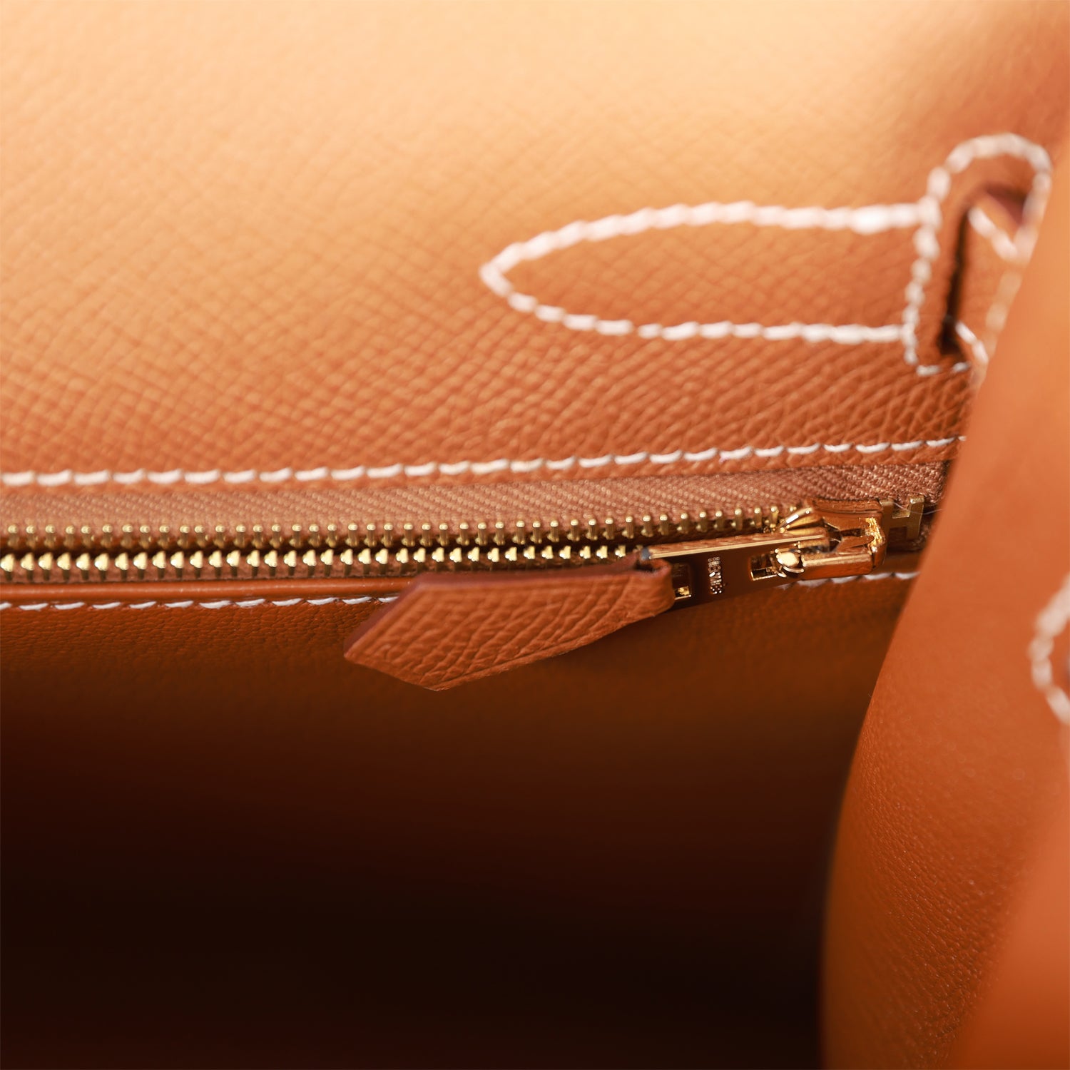 This Kelly, in the Sellier style, is in gold epsom leather with gold hardware and has contrast stitching, two straps with front toggle closure, clochette with lock and two keys, single rolled handle and optional shoulder strap.