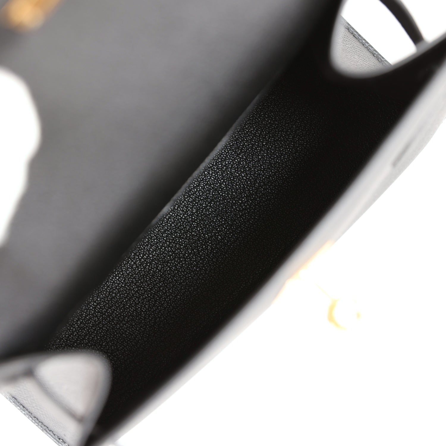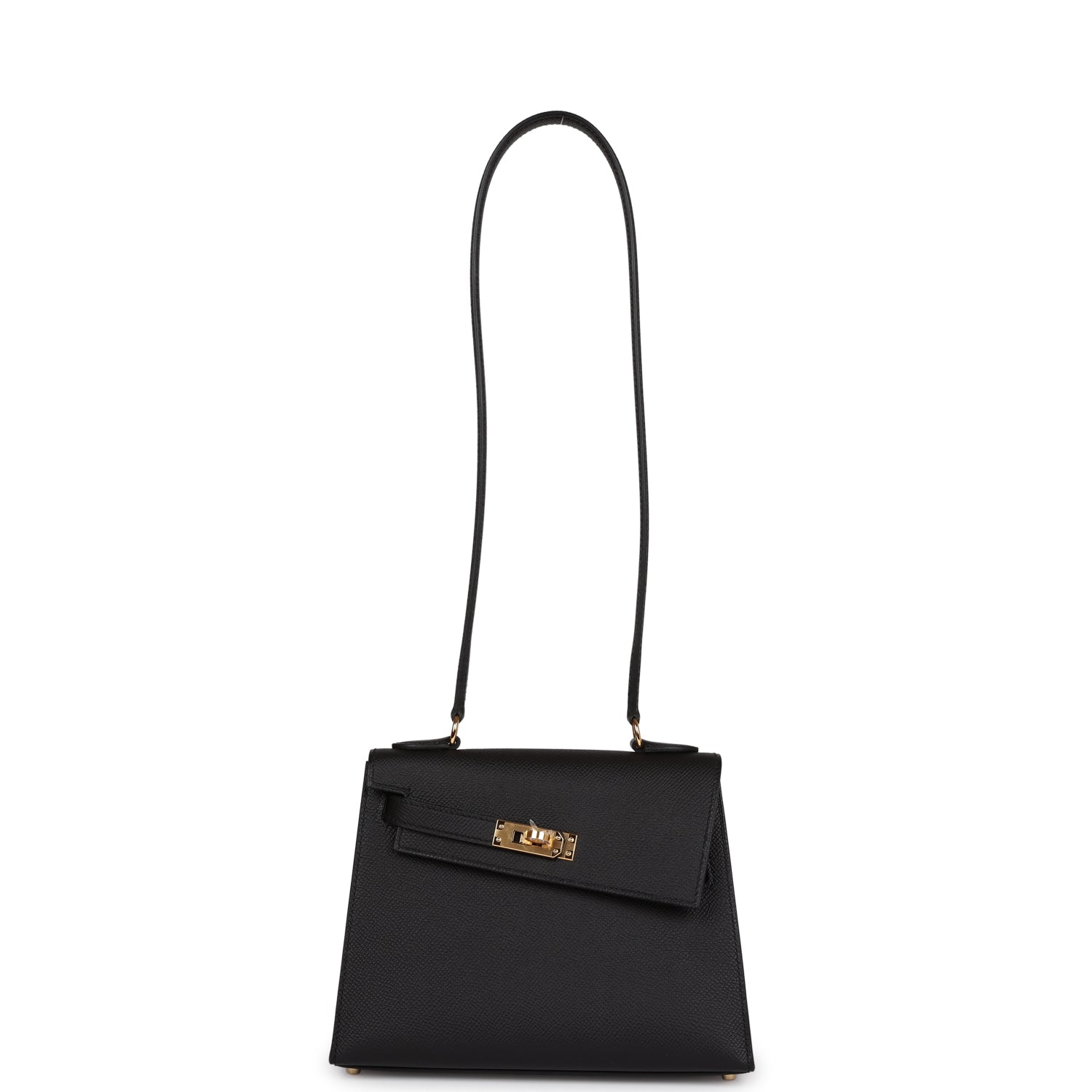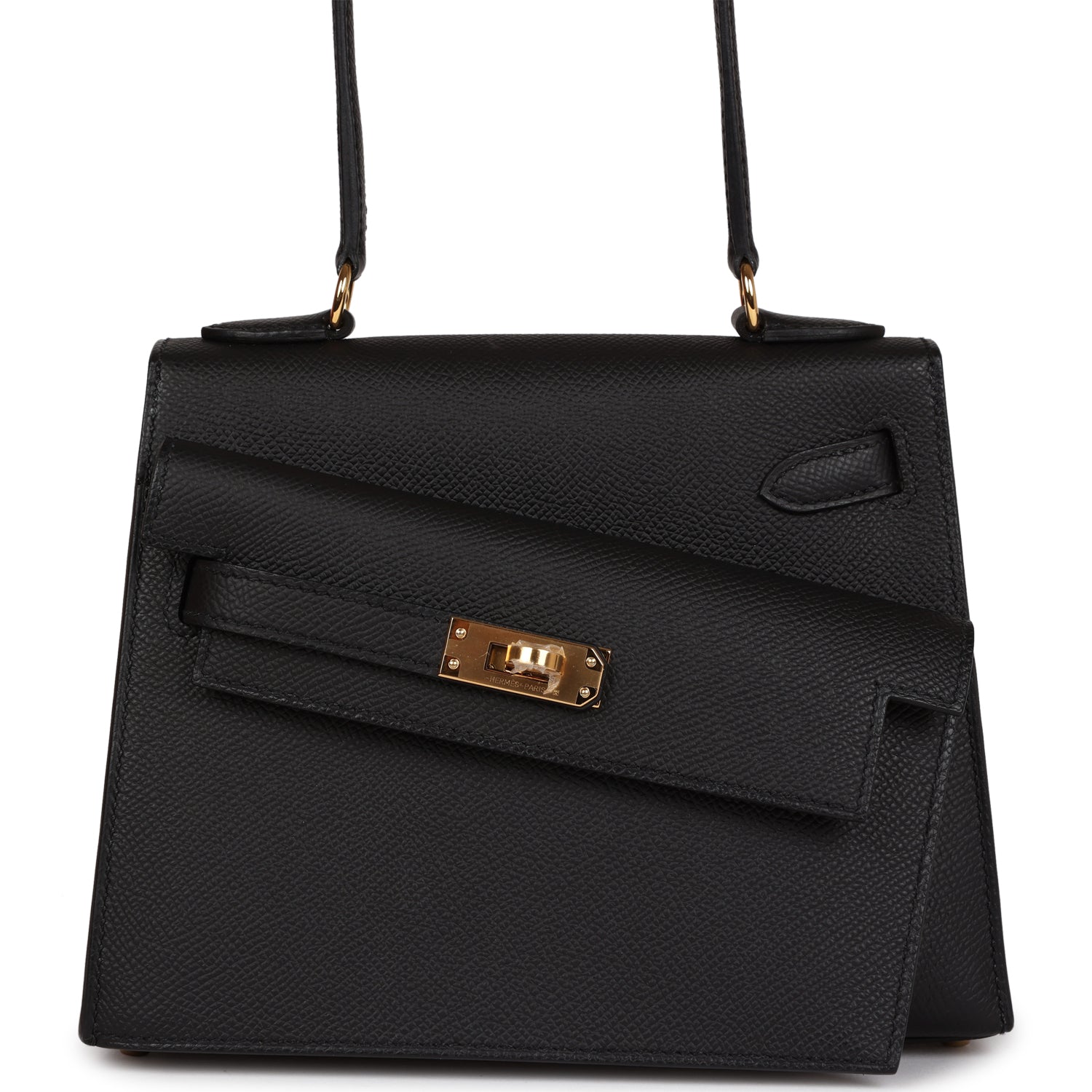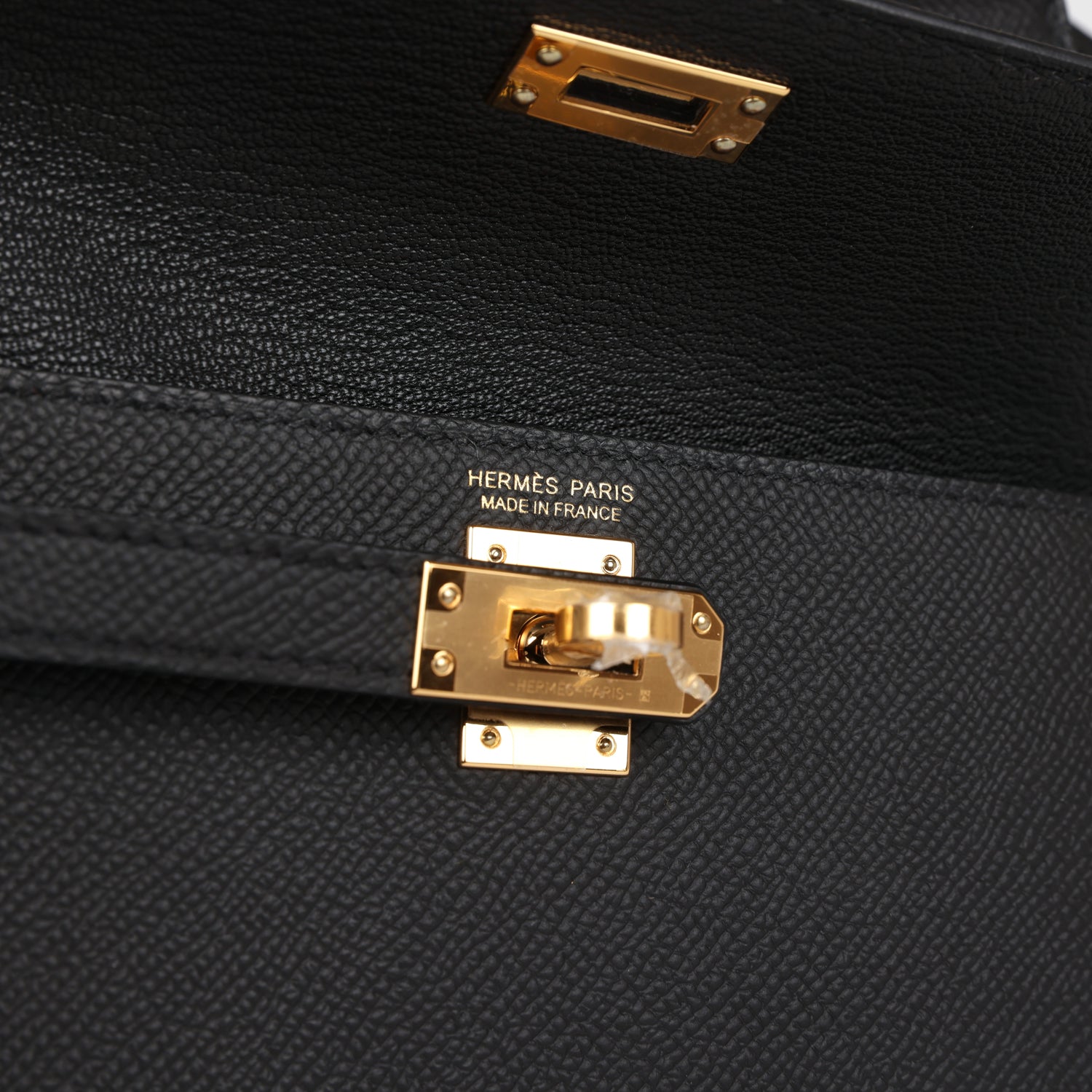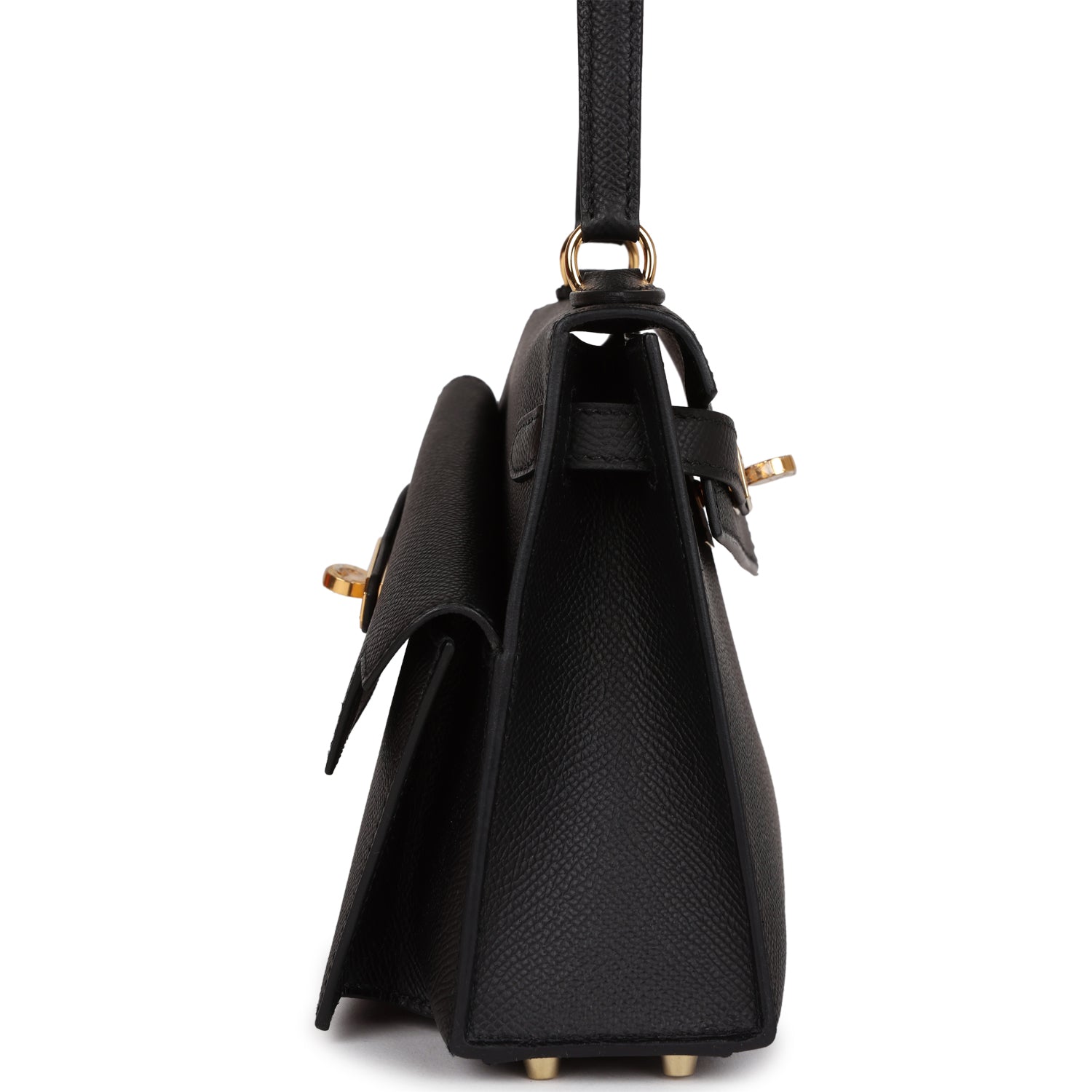 This Limited Edition Sellier en Desordre Kelly is in black epsom leather with gold hardware and has tonal stitching, distorted flaps with turnlock closures, one exterior flap pocket and single shoulder strap.