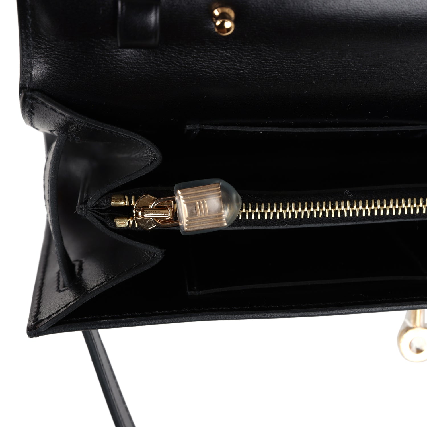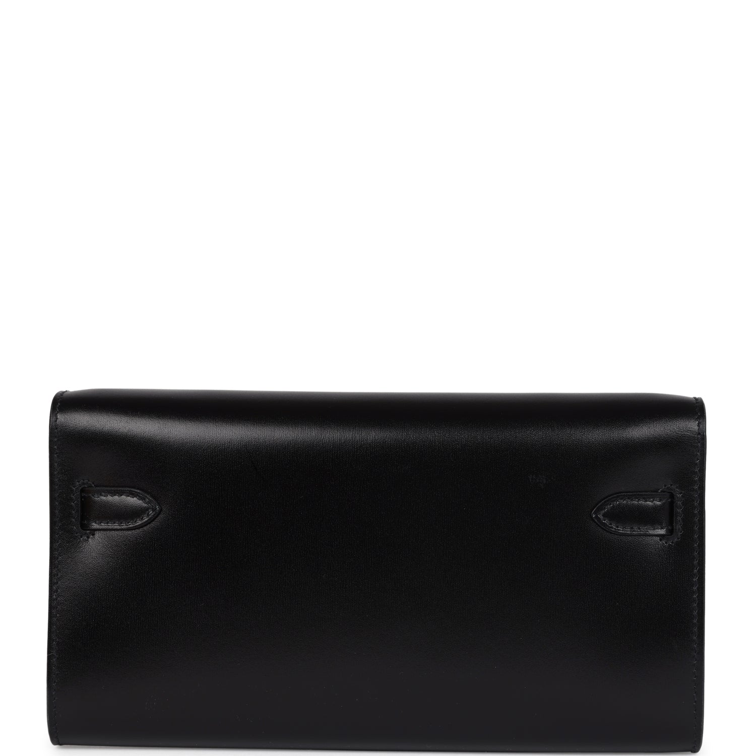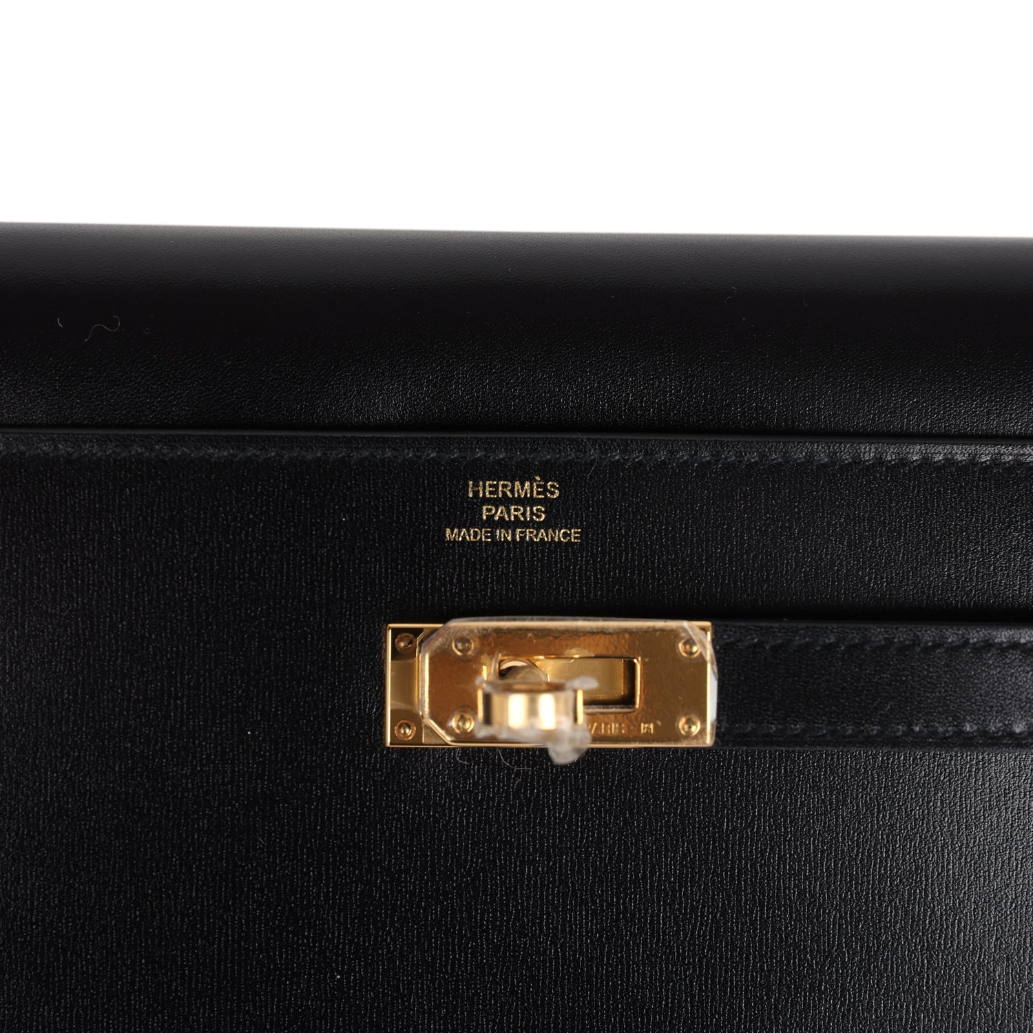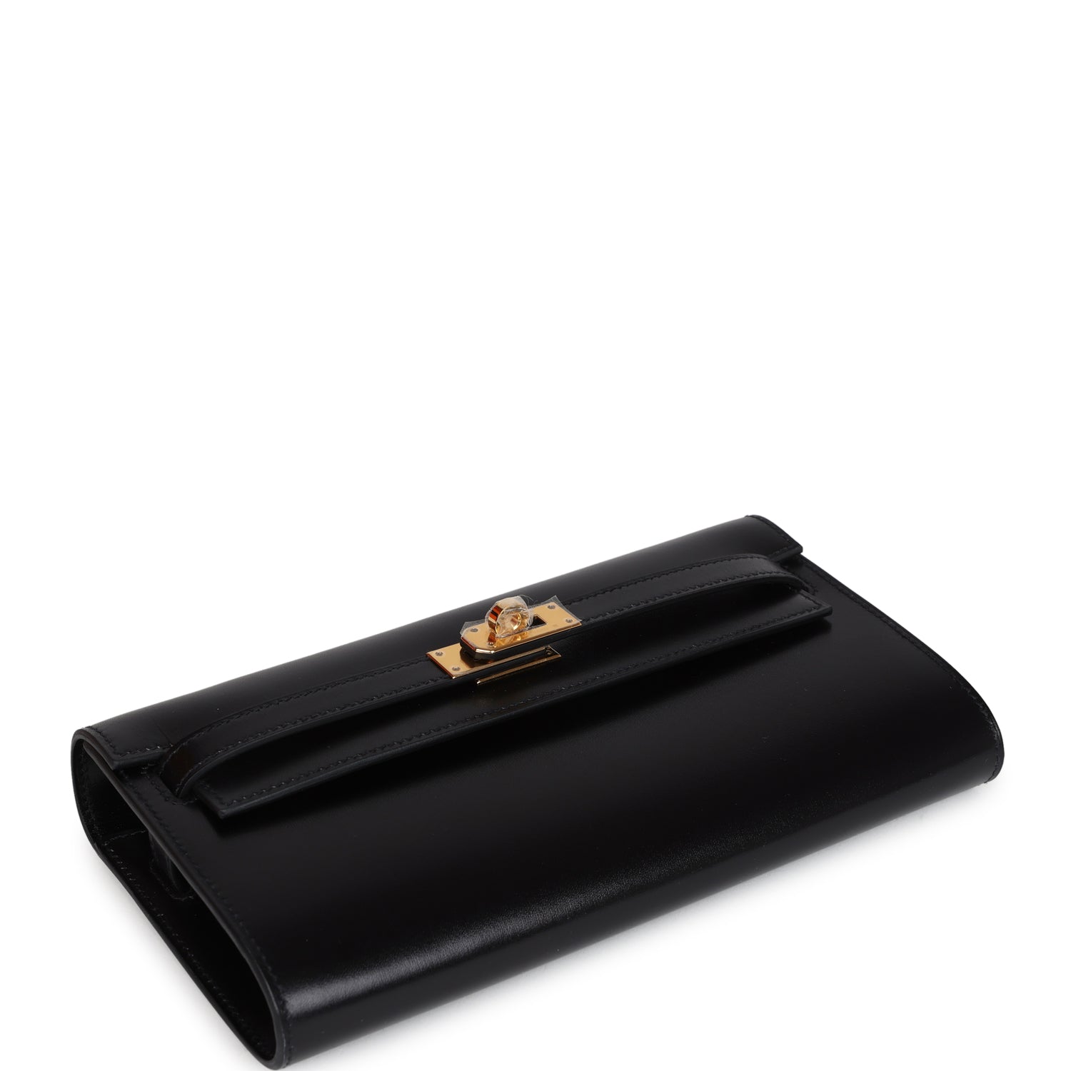 This Kelly Wallet To Go is in Black box calf leather with gold hardware and has tonal stitching, two straps with front toggle closure and removable crossbody strap.