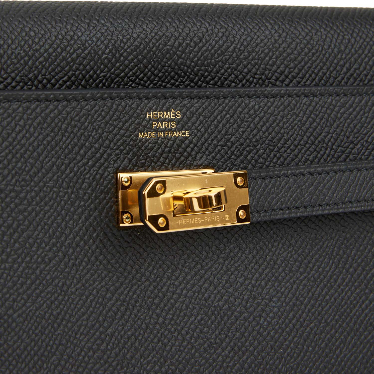 This Kelly Wallet To Go is in black epsom leather with gold hardware and has tonal stitching, two straps with front toggle closure and removable crossbody strap.