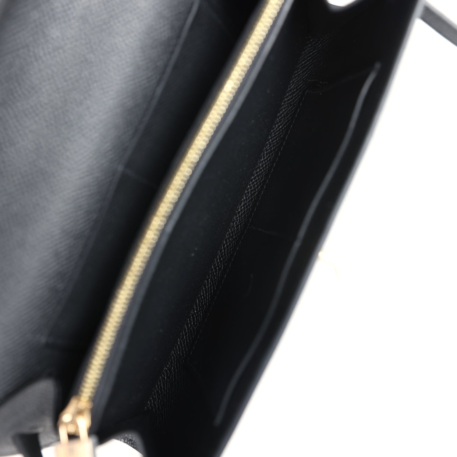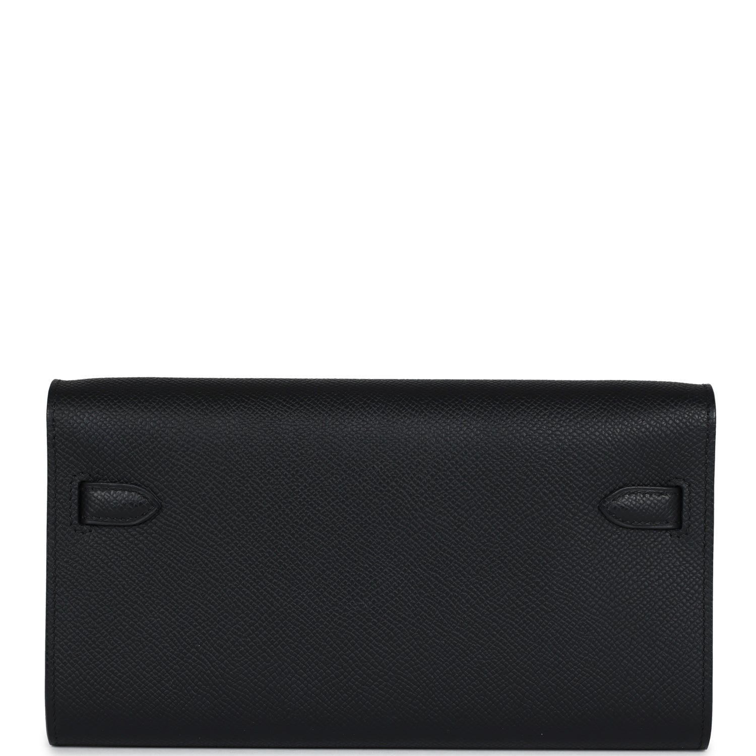 This Kelly Wallet To Go is in Black epsom leather with gold hardware and has tonal stitching, two straps with front toggle closure and removable crossbody strap.