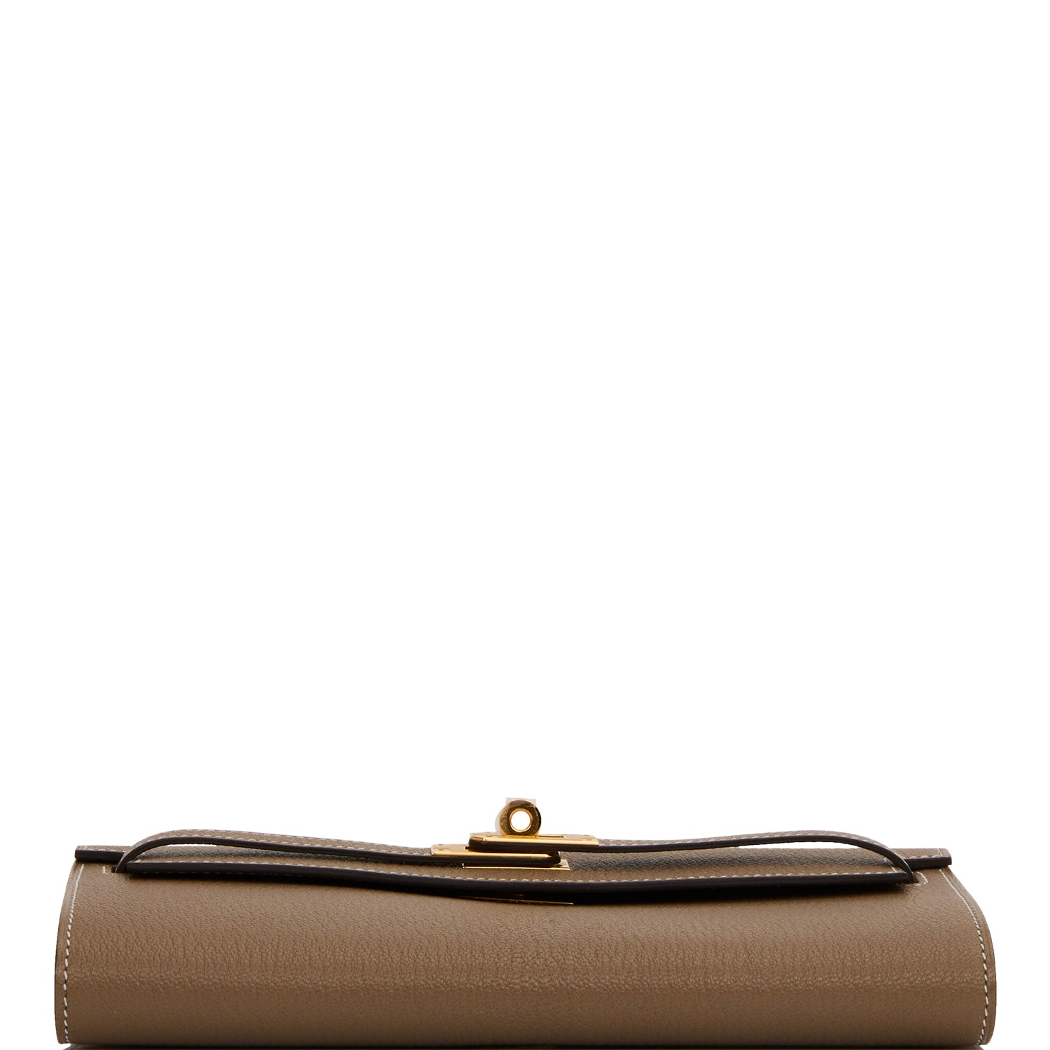 This Kelly Wallet To Go is in Etoupe chevre leather with gold hardware and has contrast stitching, two straps with front toggle closure and removable crossbody strap.