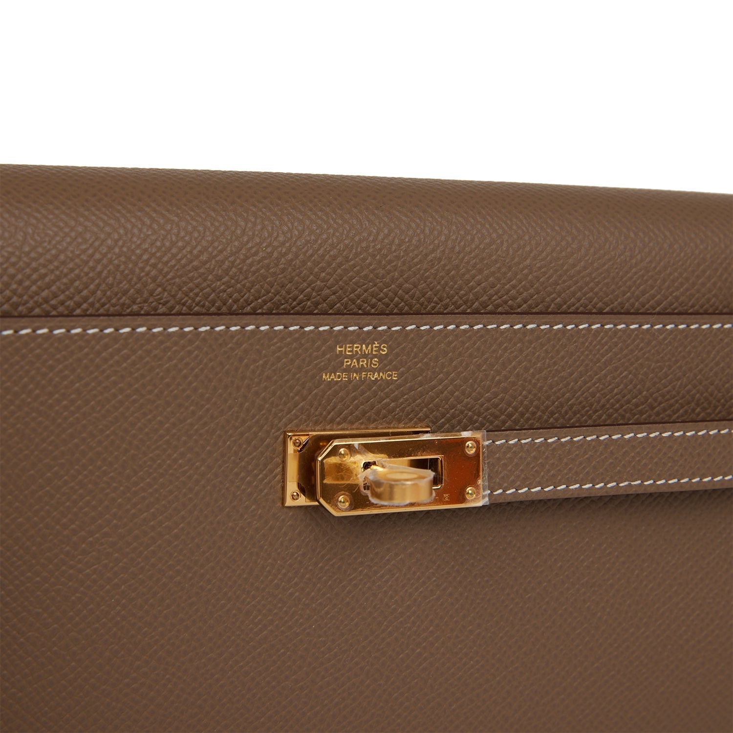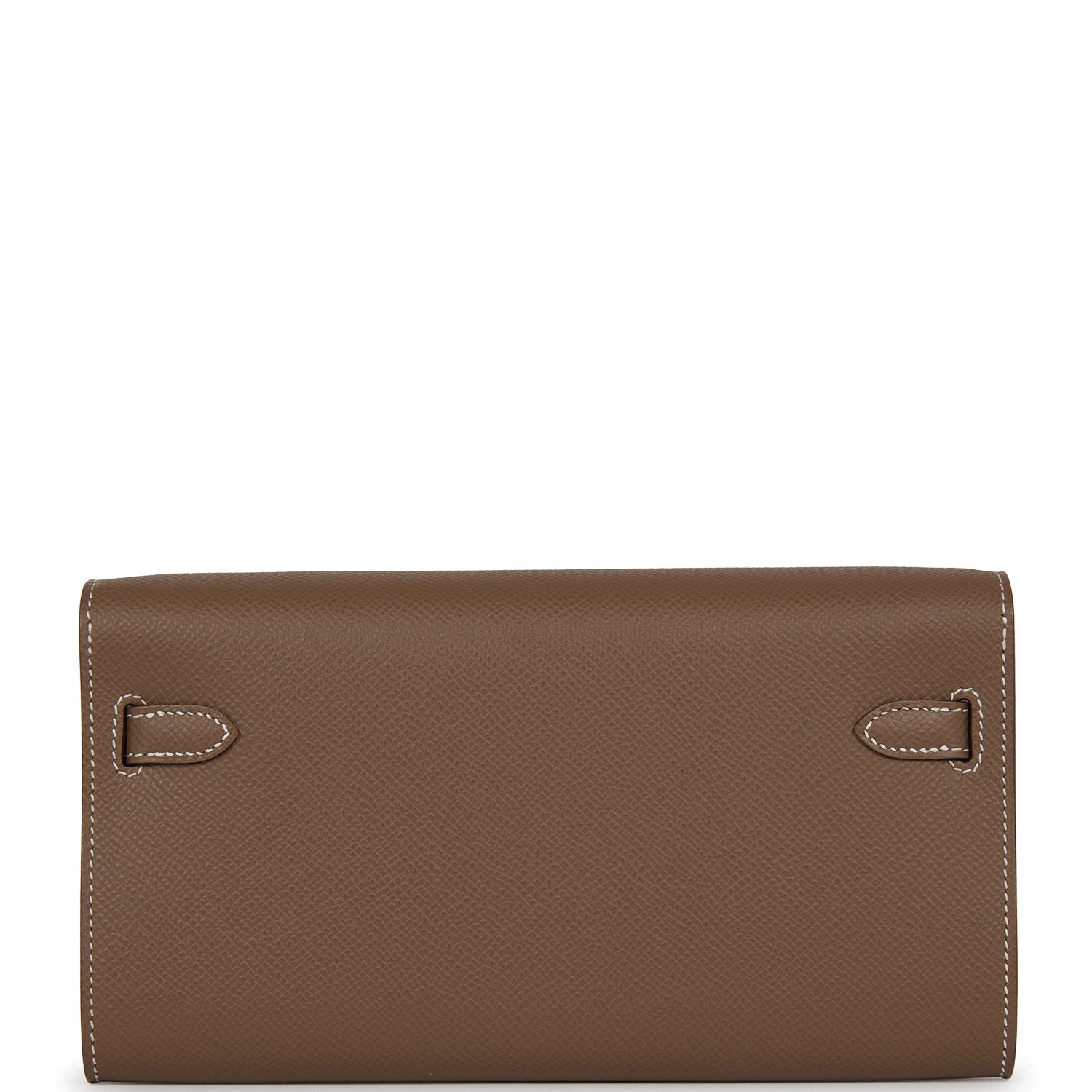 This Kelly Wallet To Go is in Etoupe epsom leather with gold hardware and has contrast stitching, two straps with front toggle closure and removable crossbody strap.