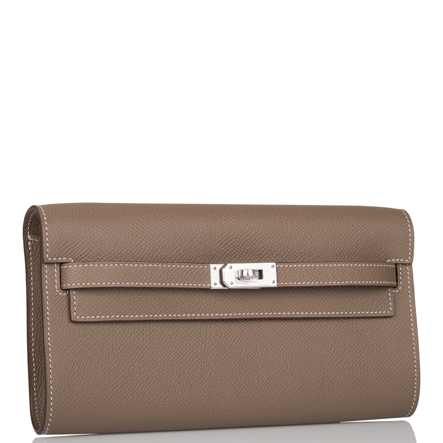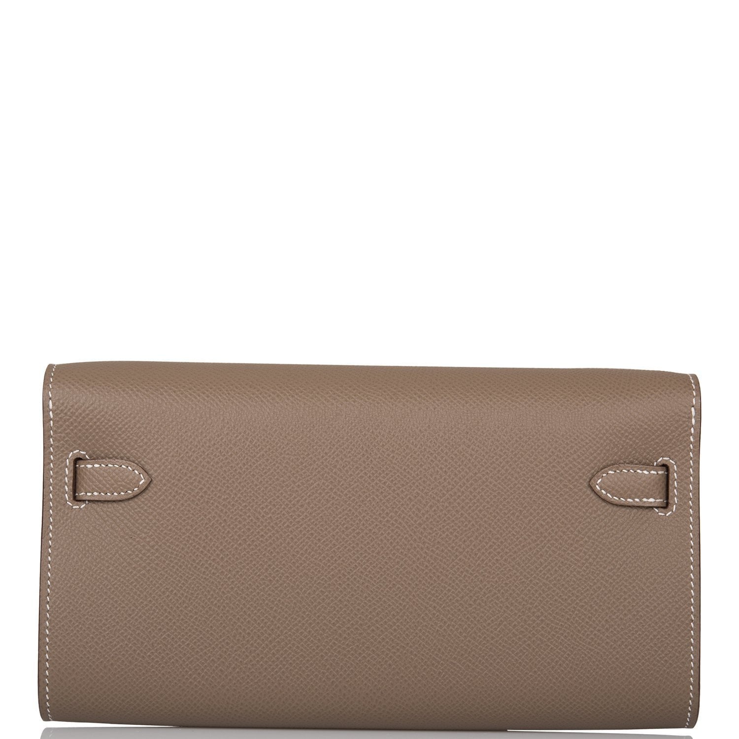 This Kelly Wallet To Go is in Etoupe epsom leather with palladium hardware and has contrast stitching, two straps with front toggle closure and removable crossbody strap.