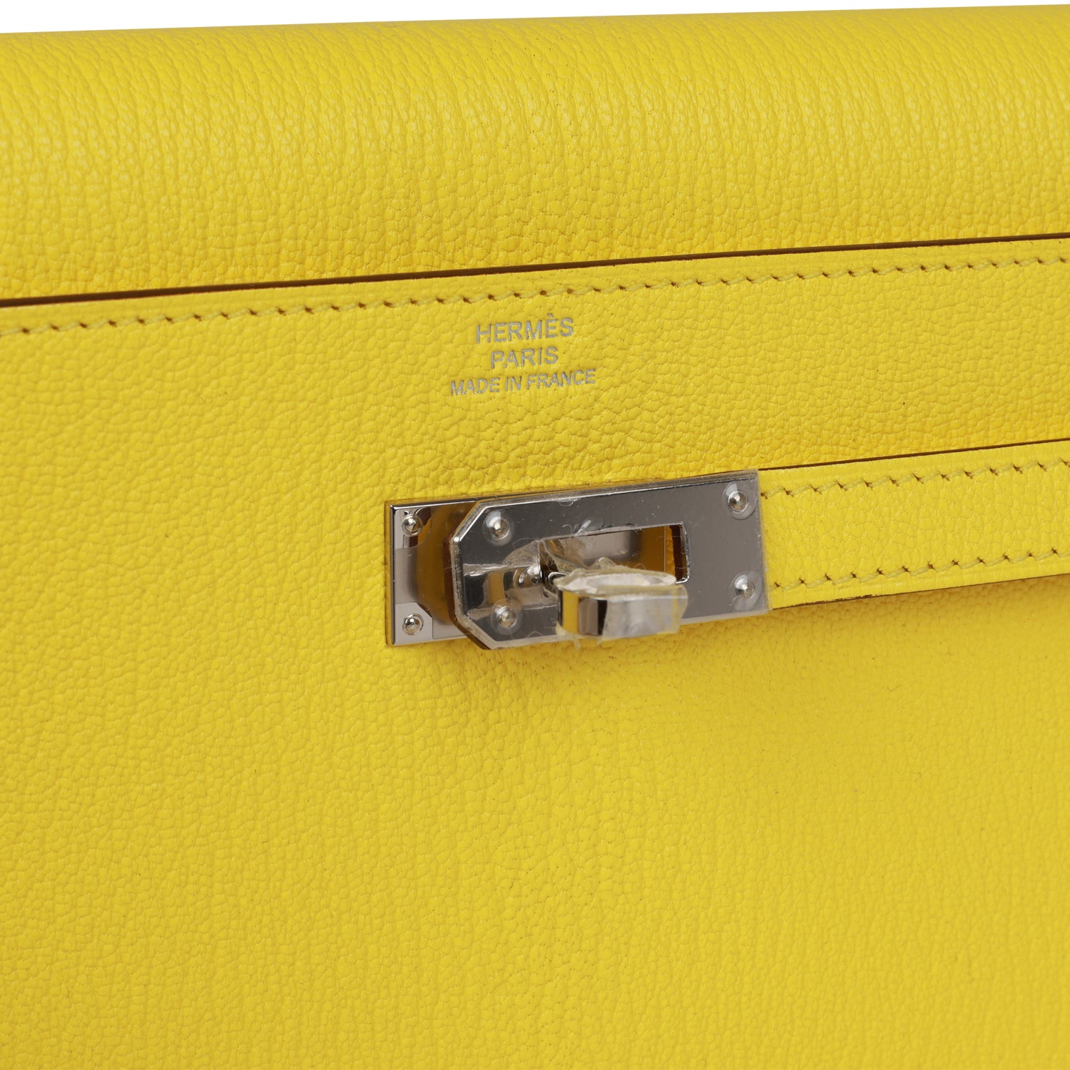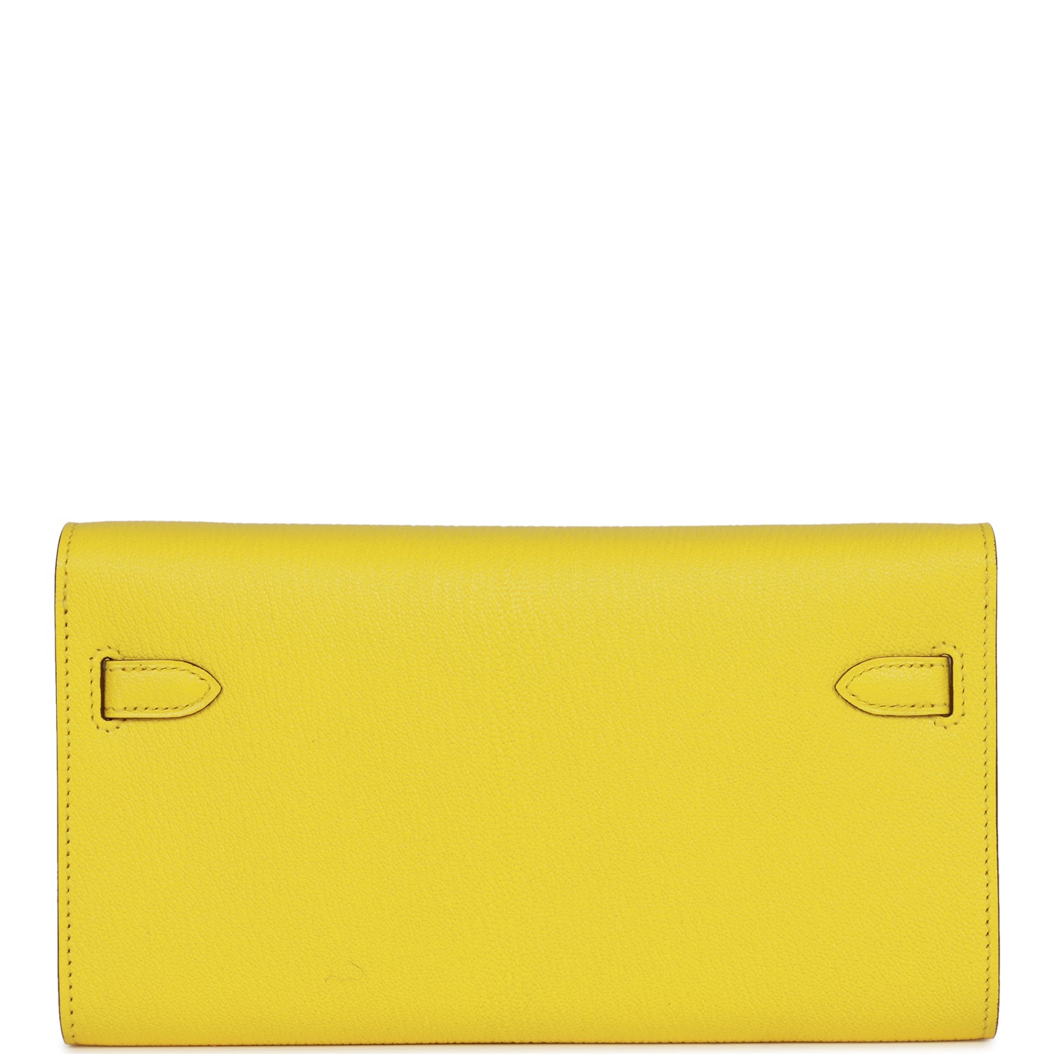 This Kelly Wallet To Go is in Jaune Citron Chevre leather with Palladium Hardware and has tonal stitching, two straps with front toggle closure and a removable crossbody strap.