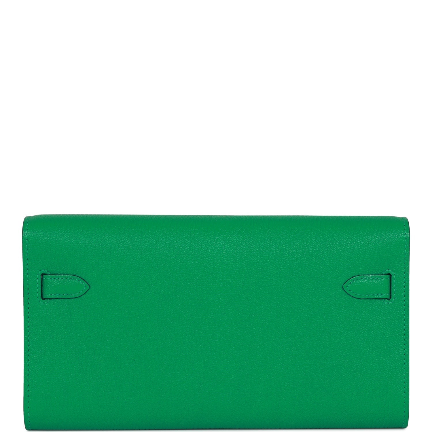 This Kelly Wallet To Go is in Menthe chevre leather with gold hardware and has tonal stitching, two straps with front toggle closure and removable crossbody strap.