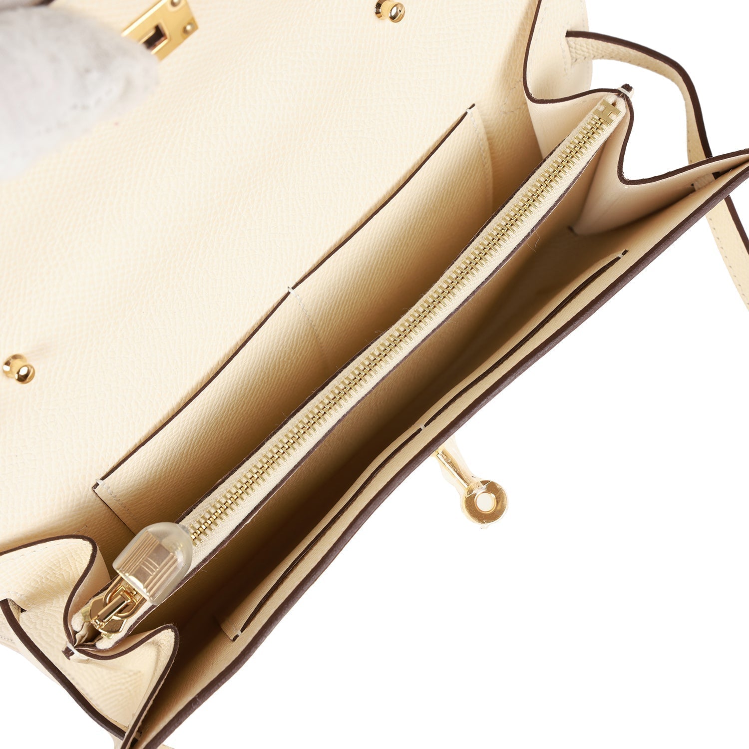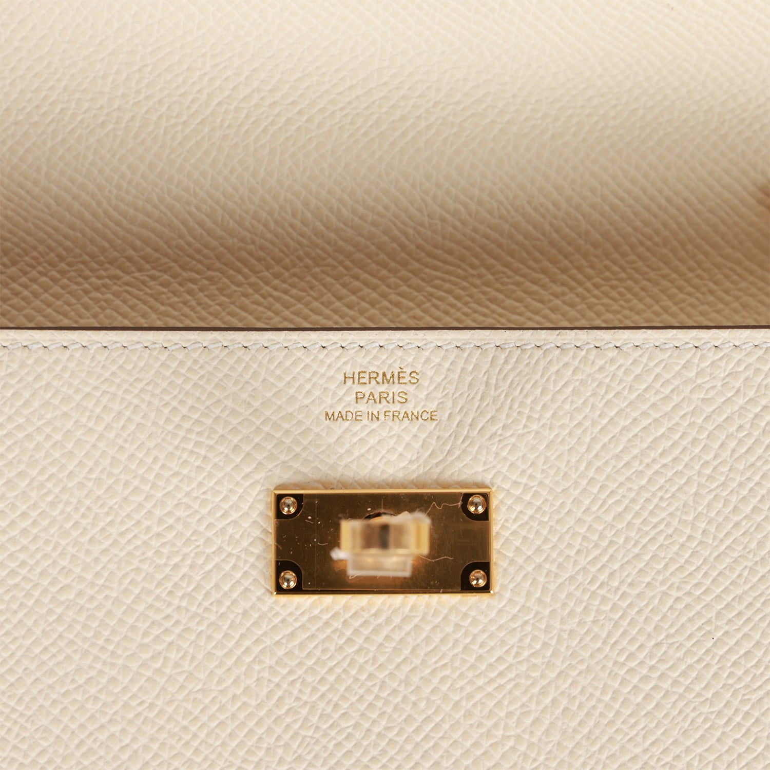 This Kelly Wallet To Go is in Nata epsom leather with gold hardware and has tonal stitching, two straps with front toggle closure and removable crossbody strap.