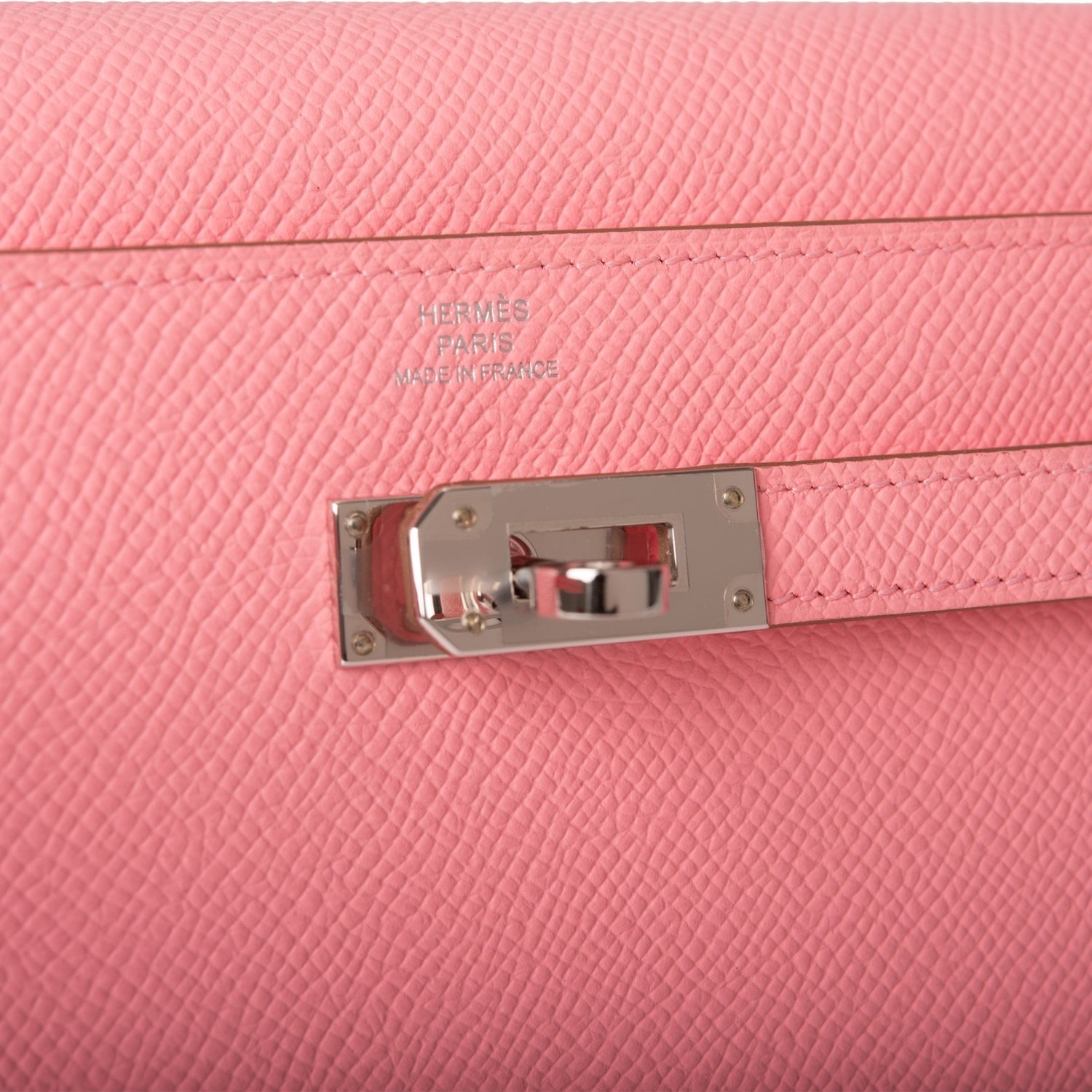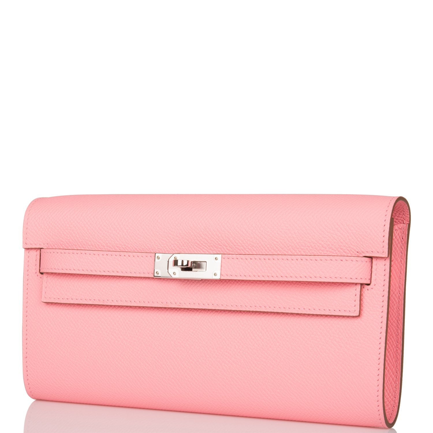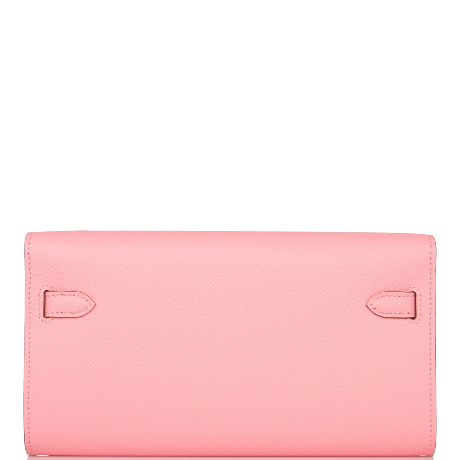 This Kelly Wallet To Go is in Rose Confetti epsom leather with palladium hardware and has tonal stitching, two straps with front toggle closure and removable crossbody strap.