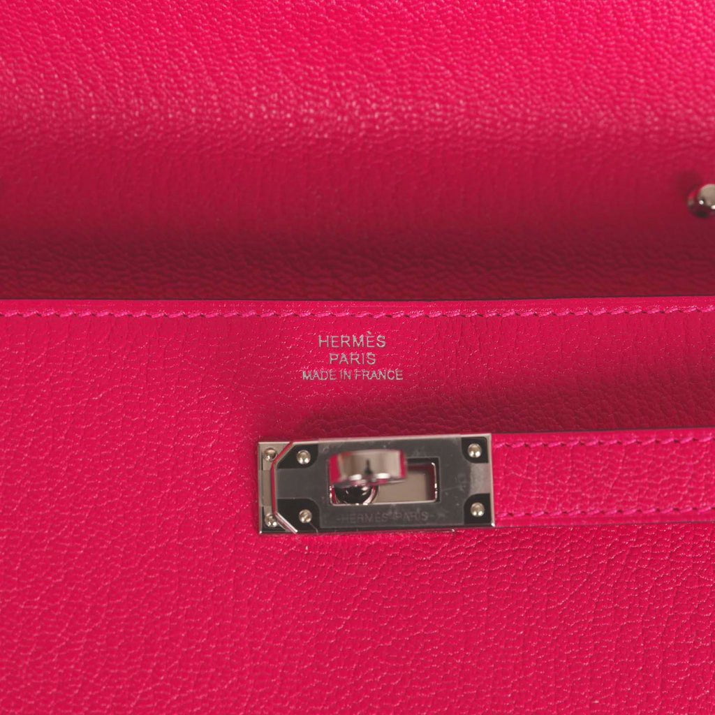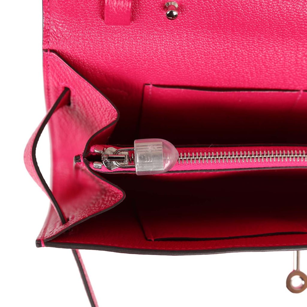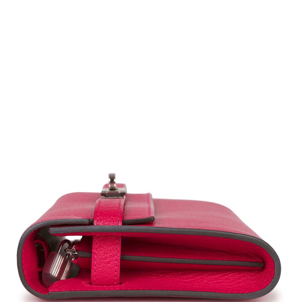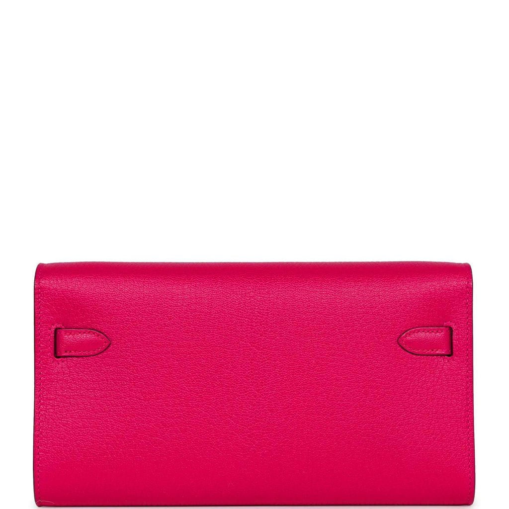 This Kelly Wallet To Go is in Rose Mexico chevre leather with palladium hardware and has tonal stitching, two straps with front toggle closure and removable crossbody strap.