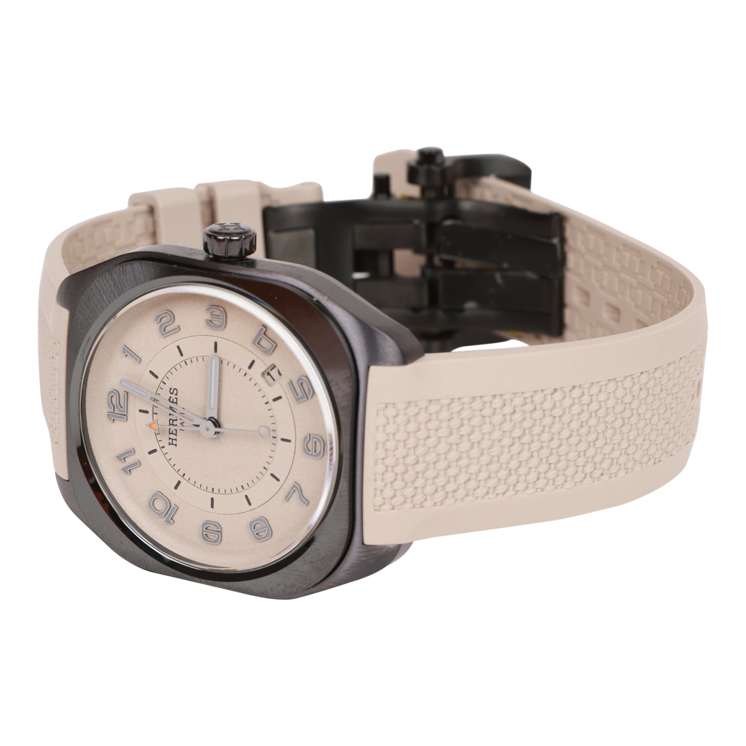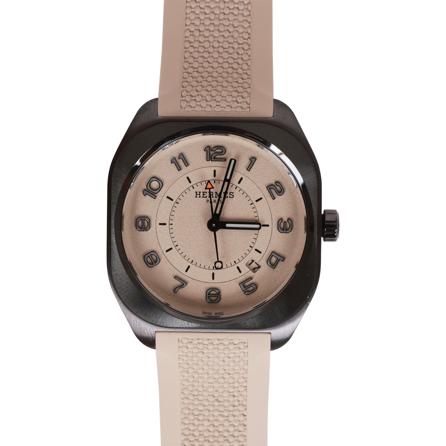 This limited edition Hodinkee watch is in titanium with a taupe rubber adjustable strap with silver watch hands.
