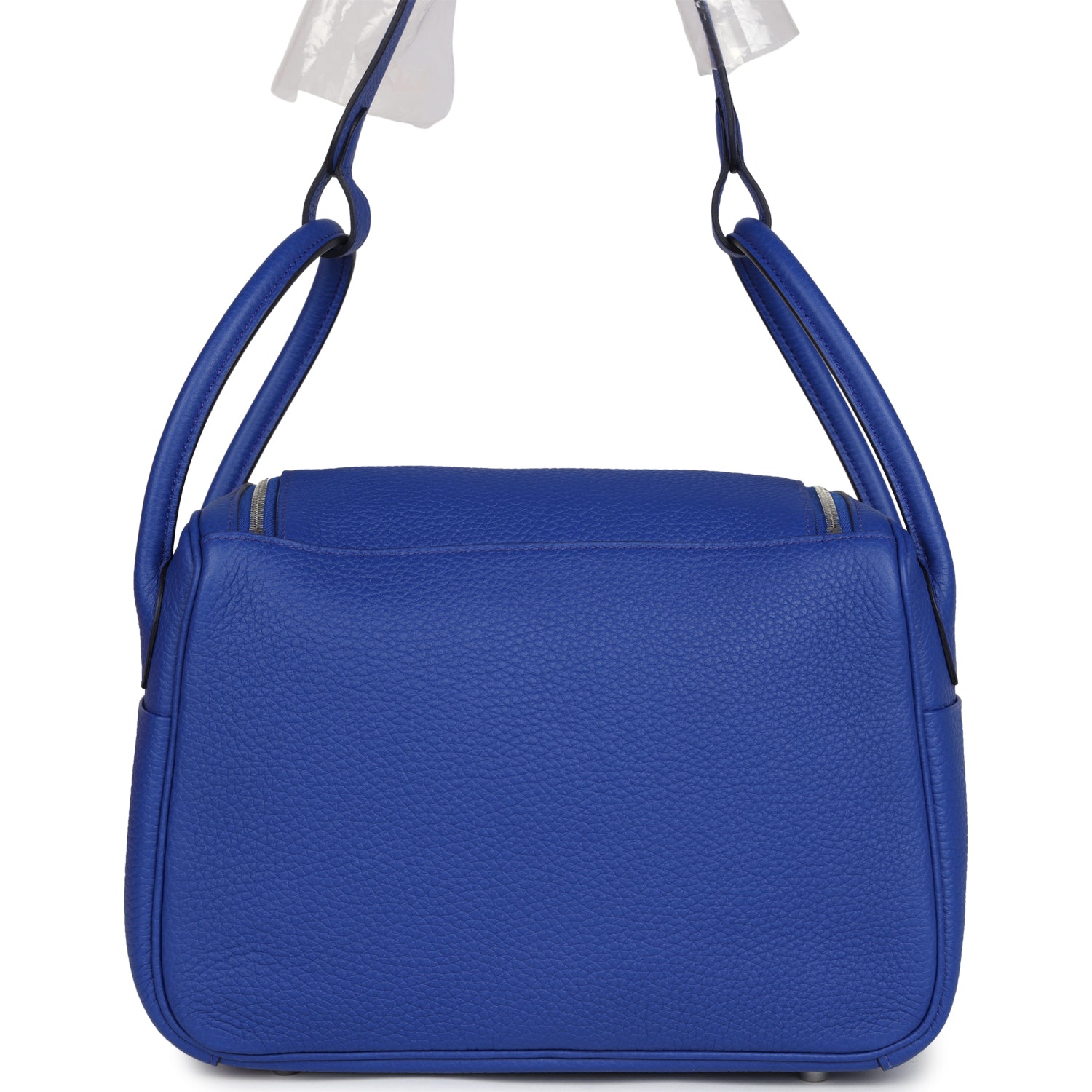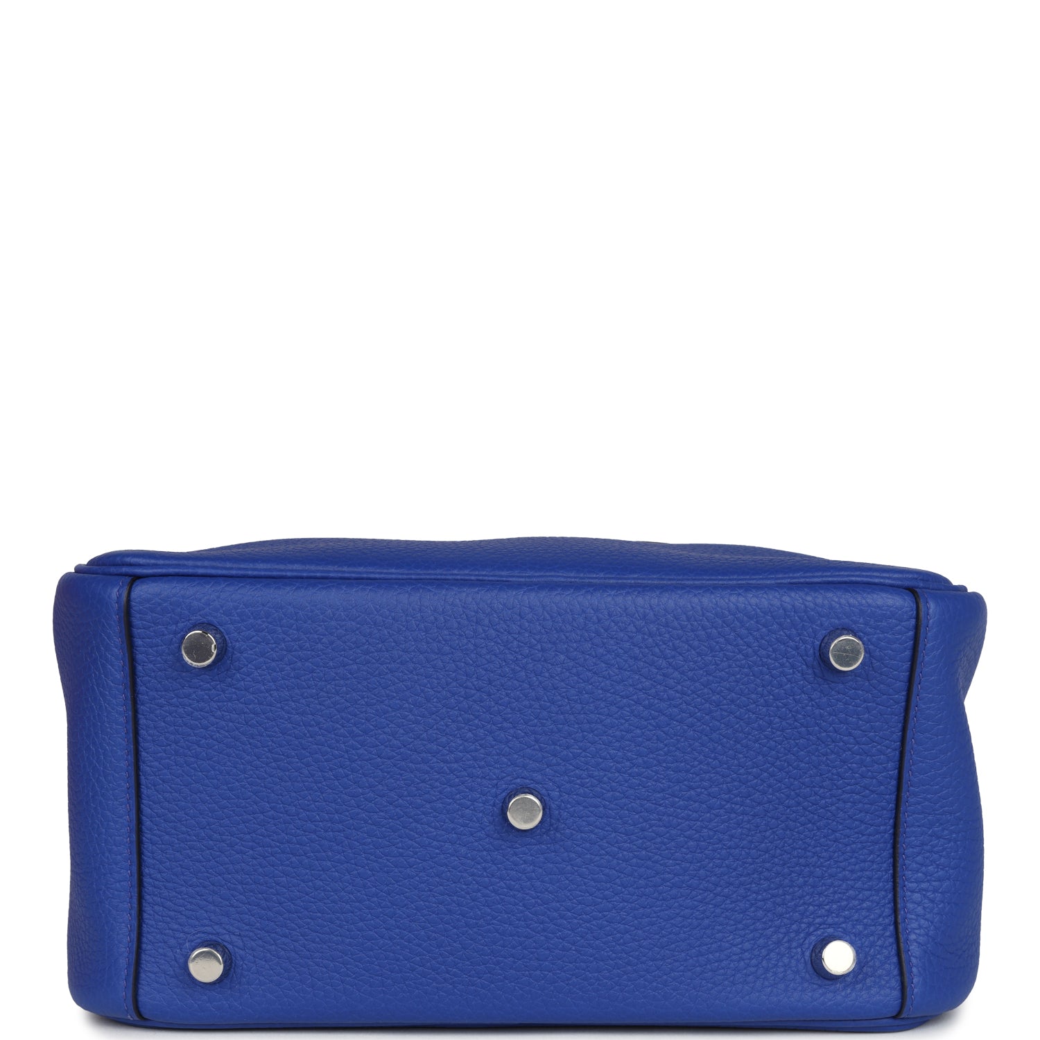 This Lindy is of Bleu Royal clemence leather with palladium hardware and features tonal stitching, double zipper pulls, center Hermes twist lock closure, five palladium feet, and two top handles that are linked by a shoulder strap.