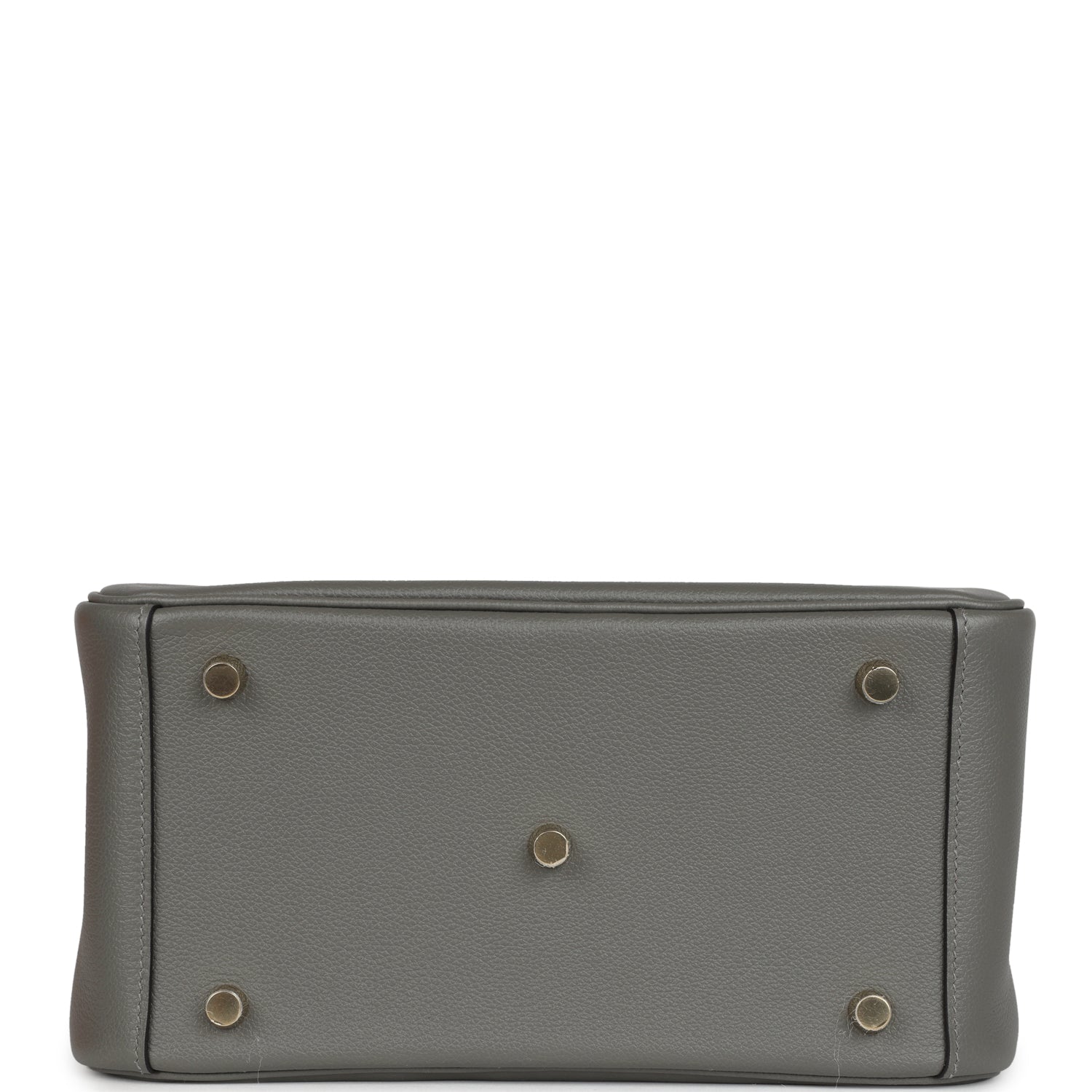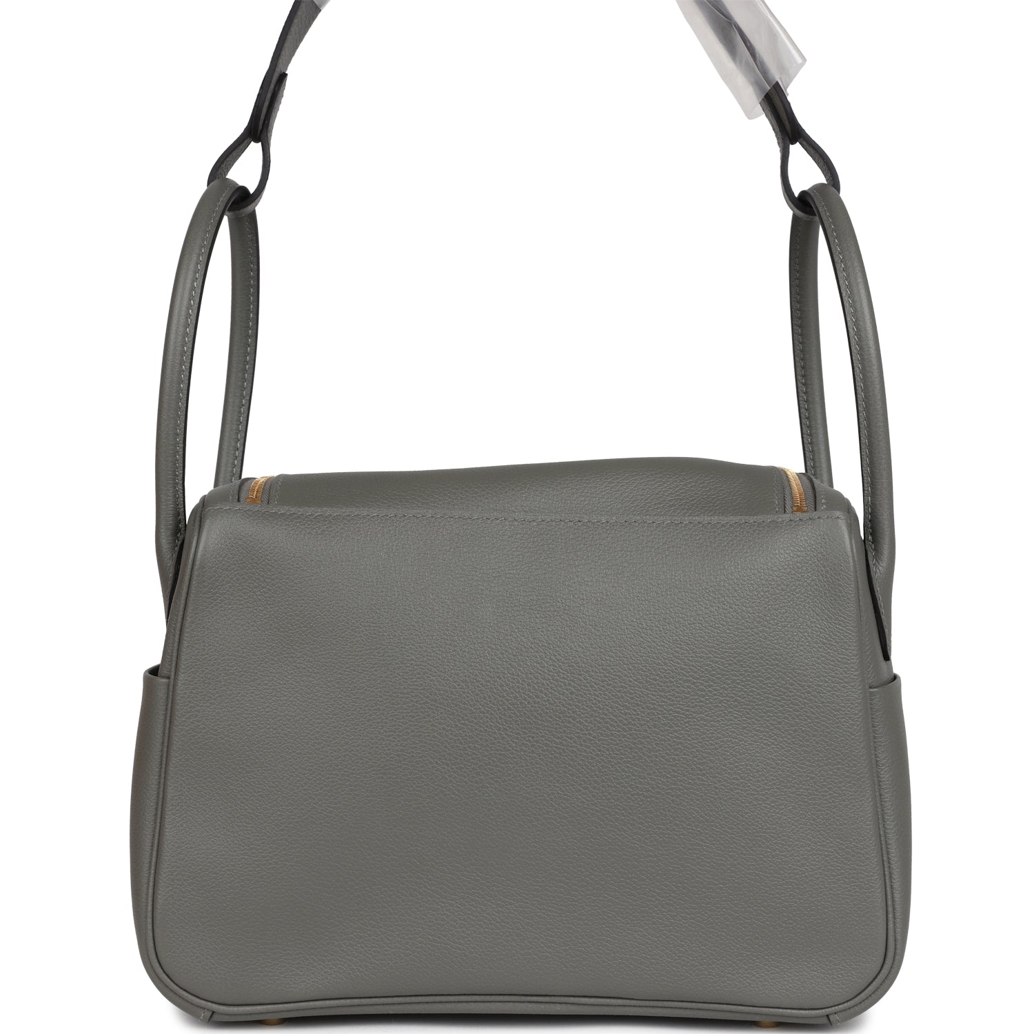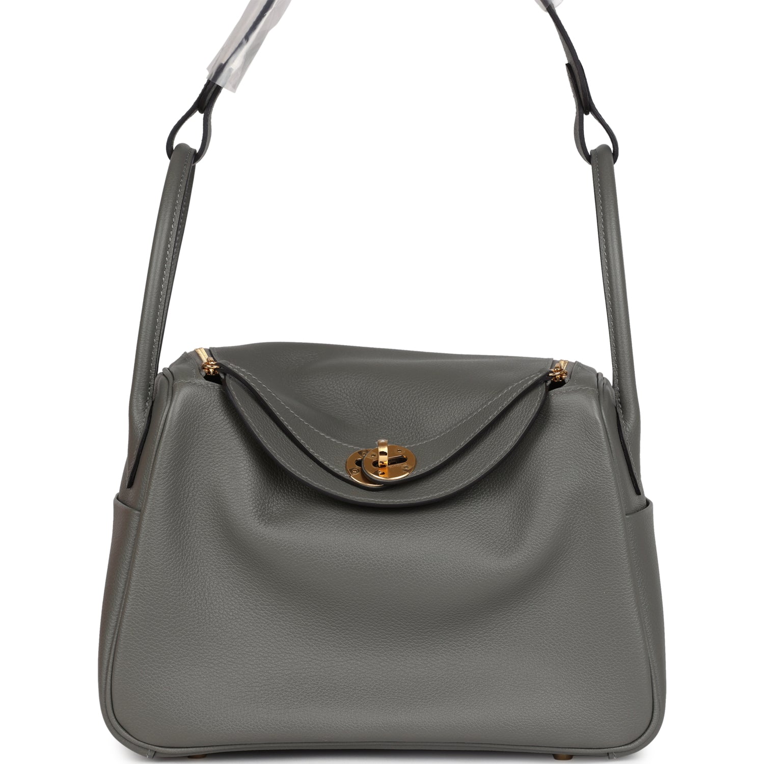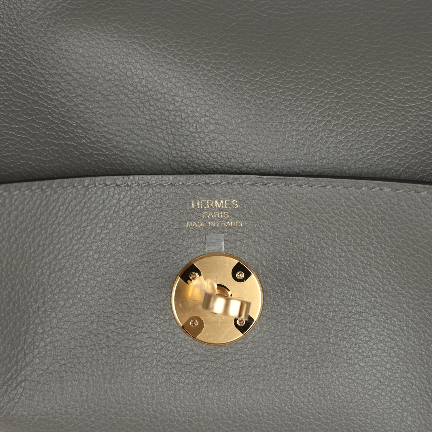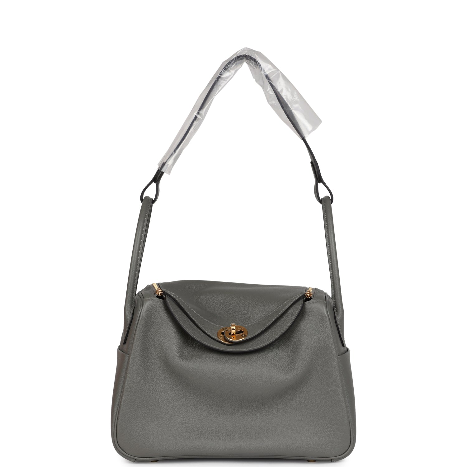 This Lindy is of Gris Meyer evercolor leather with gold hardware and features tonal stitching, double zipper pulls, center Hermes twist lock closure, five gold feet, and two top handles that are linked by a removable shoulder strap.