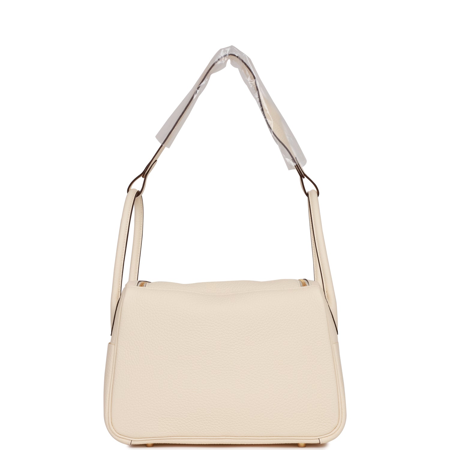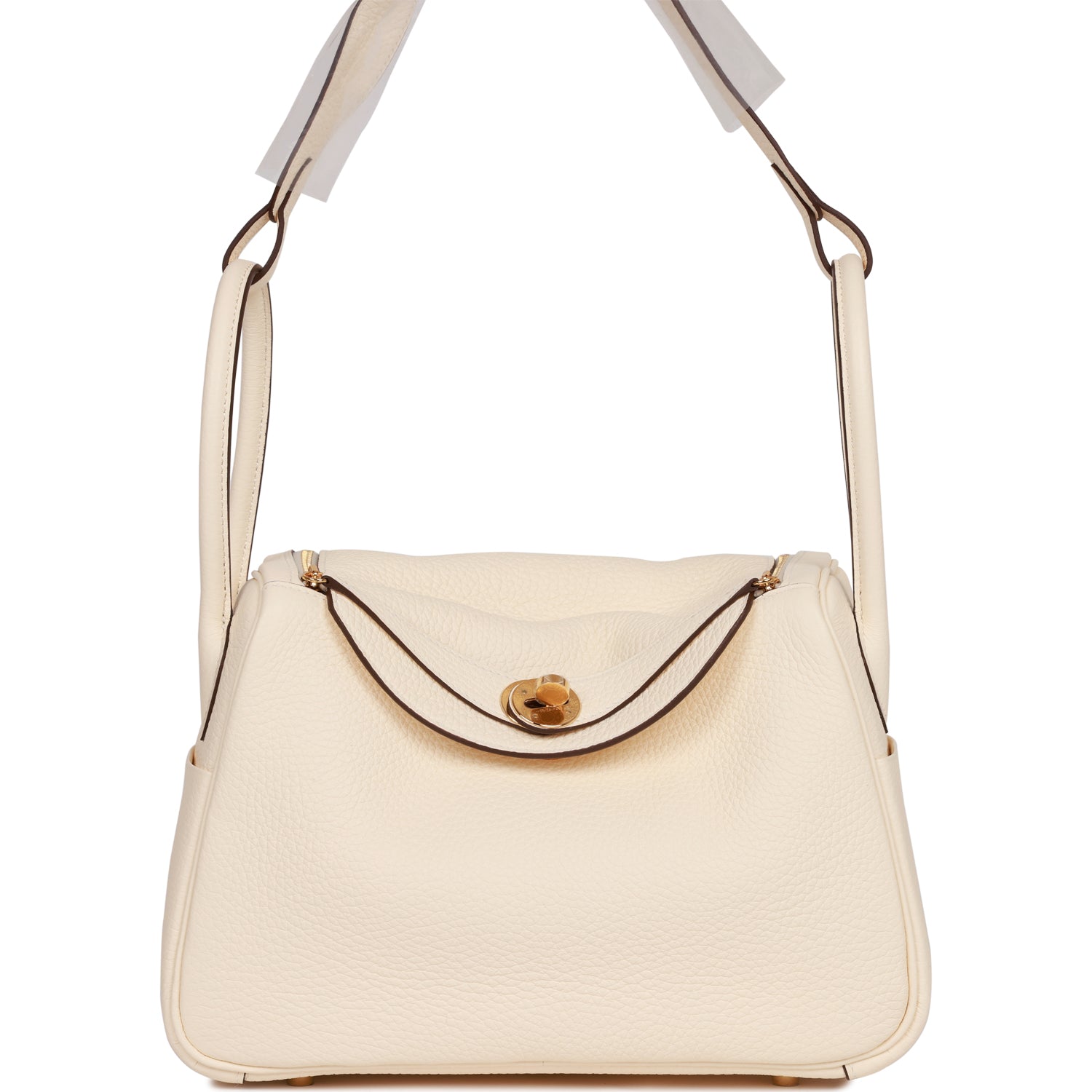 This Lindy is of Nata clemence with gold hardware and features tonal stitching, double zipper pulls, center Hermes twist lock closure, five gold feet, and two top handles that are linked by a removable shoulder strap.