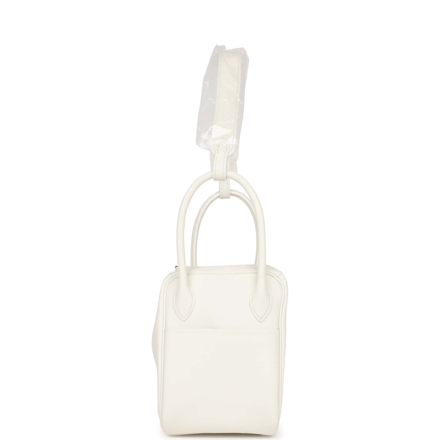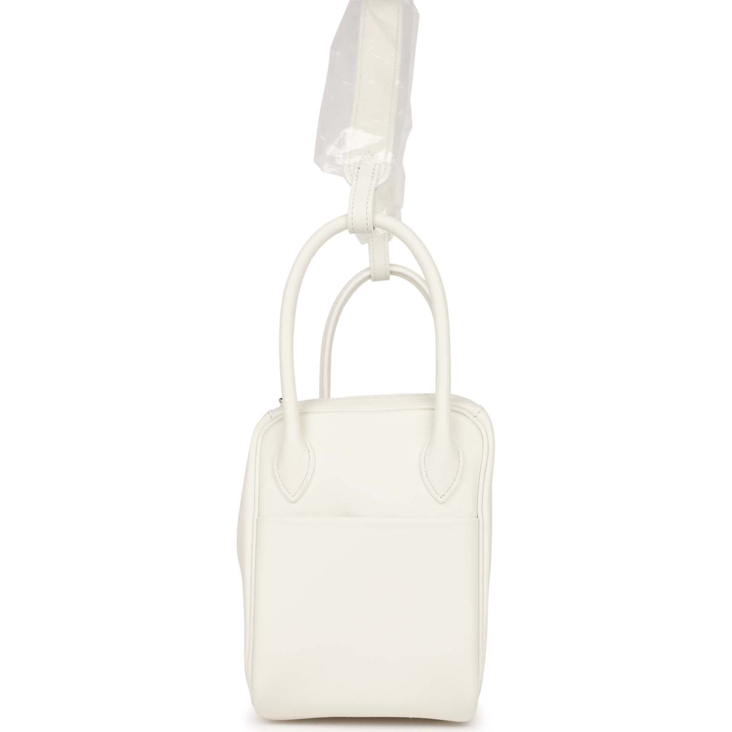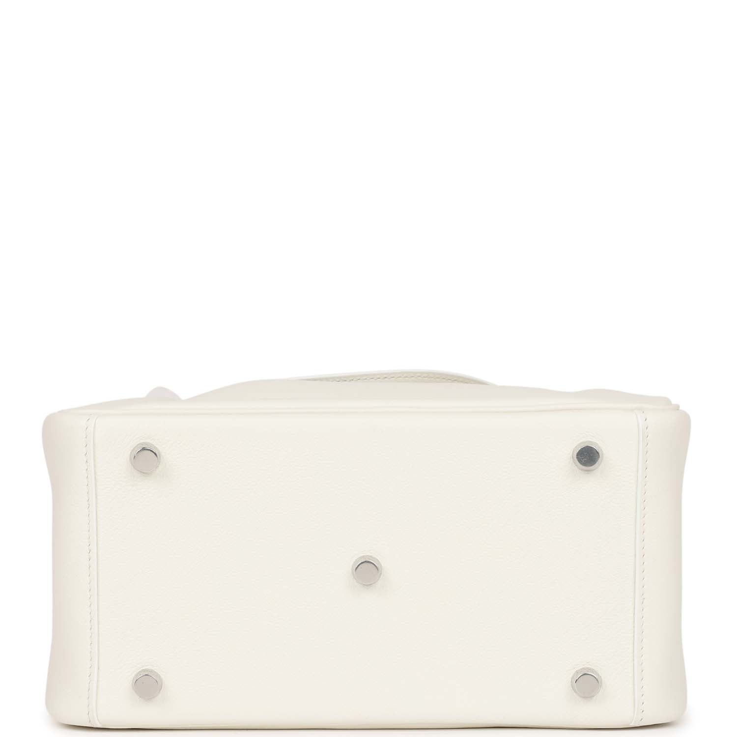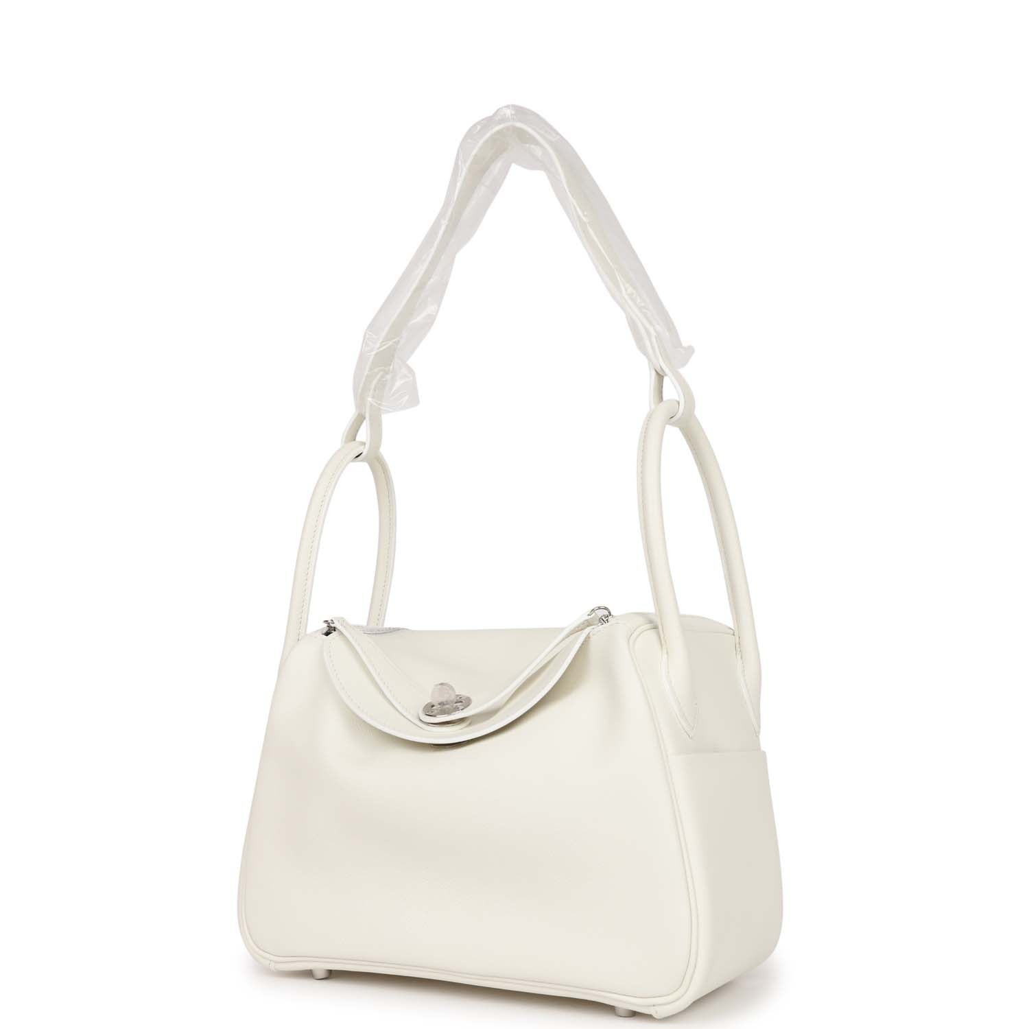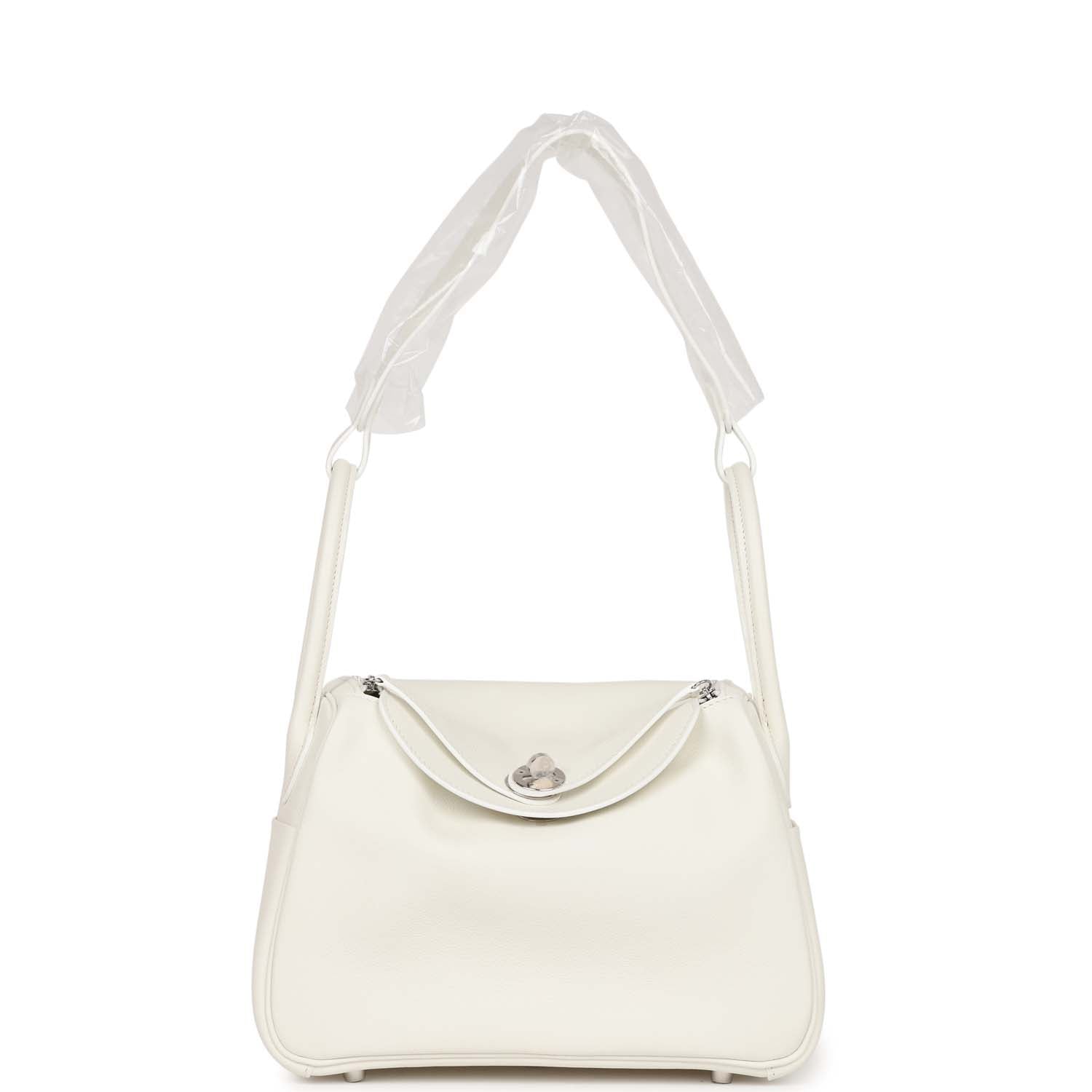 This Lindy is of White evercolor with palladium hardware and features tonal stitching, double zipper pulls, center Hermes twist lock closure, five gold feet, and two top handles that are linked by a removable shoulder strap.