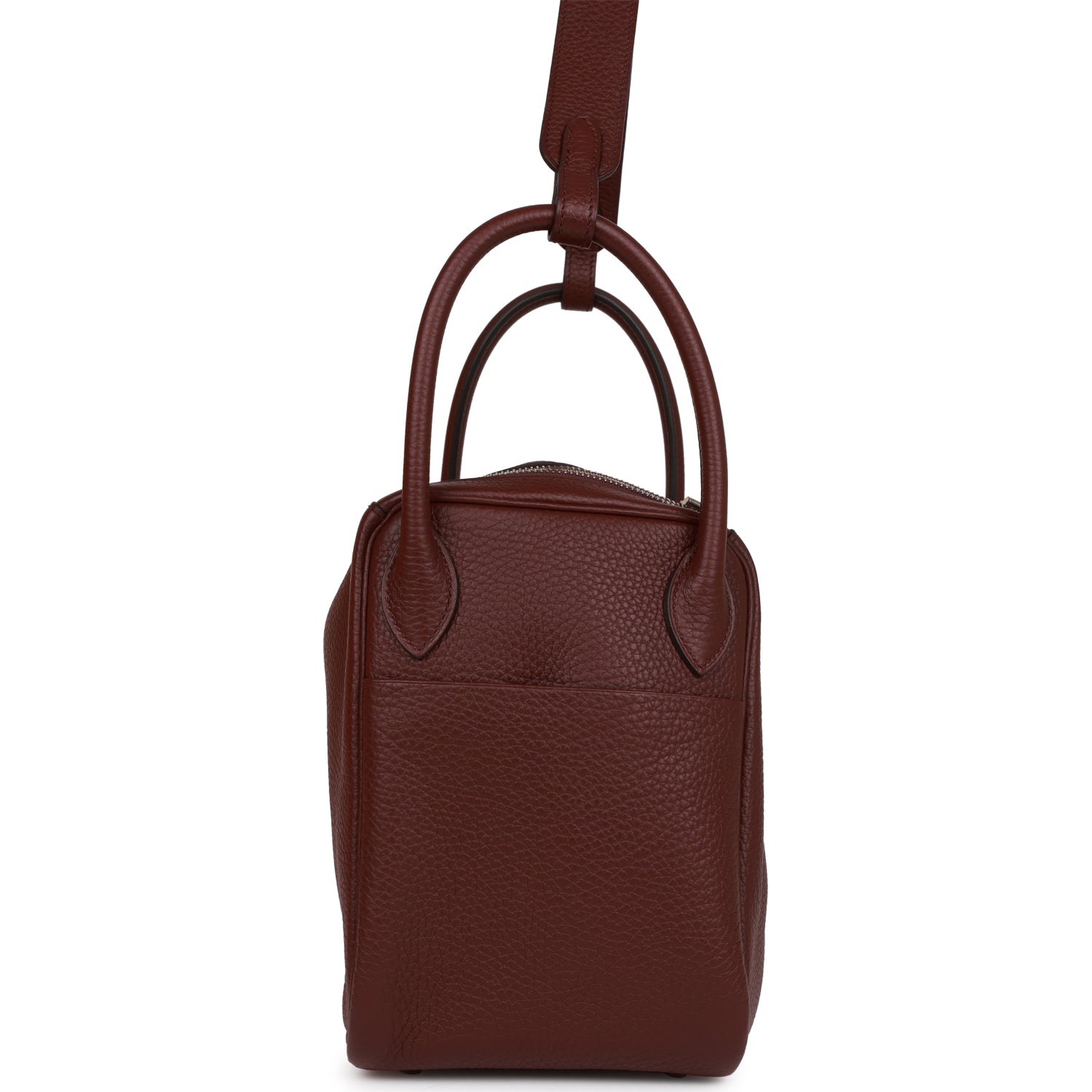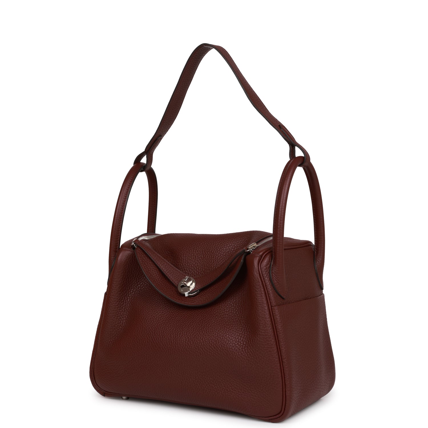 This Lindy is of Bordeaux clemence with palladium hardware and features tonal stitching, double zipper pulls, center Hermes twist lock closure, five palladium feet, and two top handles that are linked by a removable shoulder strap.