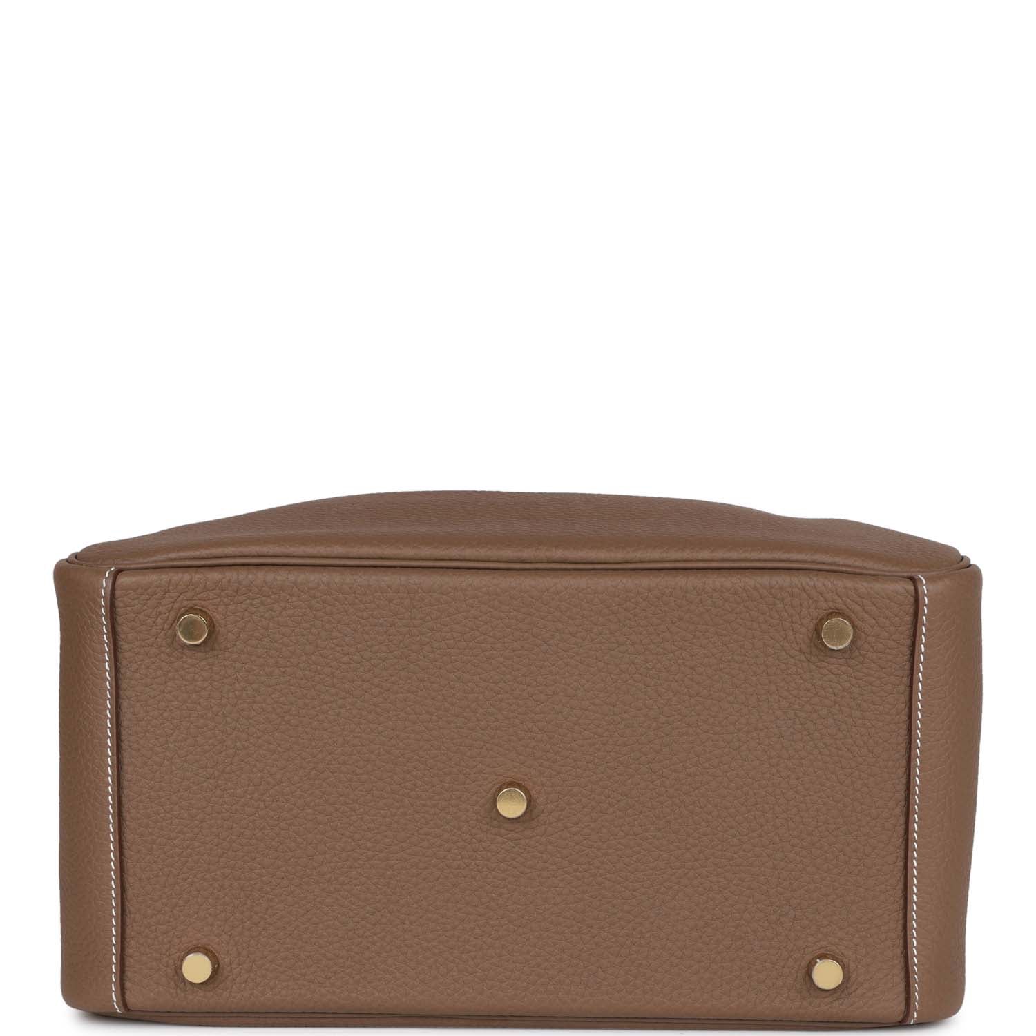 This Lindy is of Etoupe clemence with gold hardware and features contrast stitching, double zipper pulls, center Hermes twist lock closure, five gold feet, and two top handles that are linked by a removable shoulder strap.