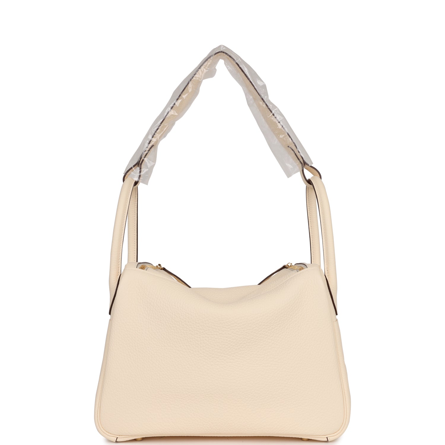 This Lindy is in Nata clemence with gold hardware and features tonal stitching, double zipper pulls, center Hermes twist lock closure, five gold feet, and two top handles that are linked by a removable shoulder strap.