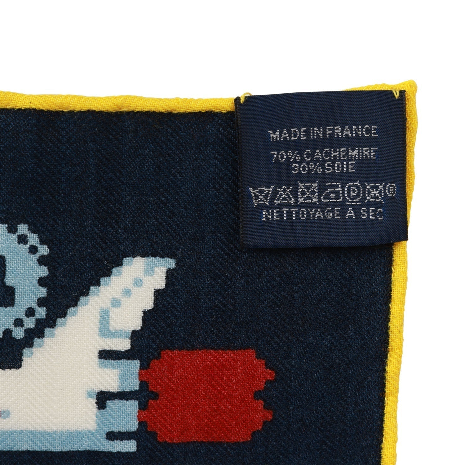 Hermes limited edition "Madison Party" silk and cashmere scarf designed by Tibor Karpati in a dark blue colorway.